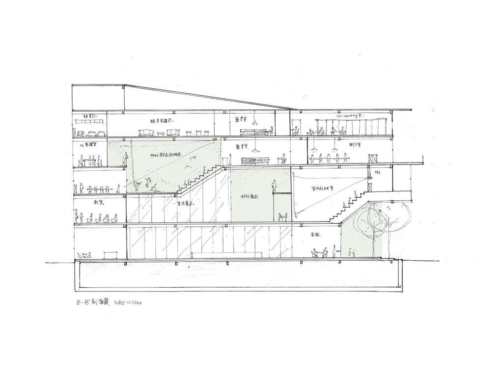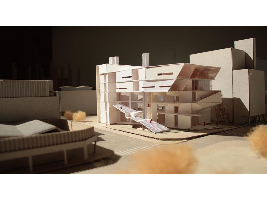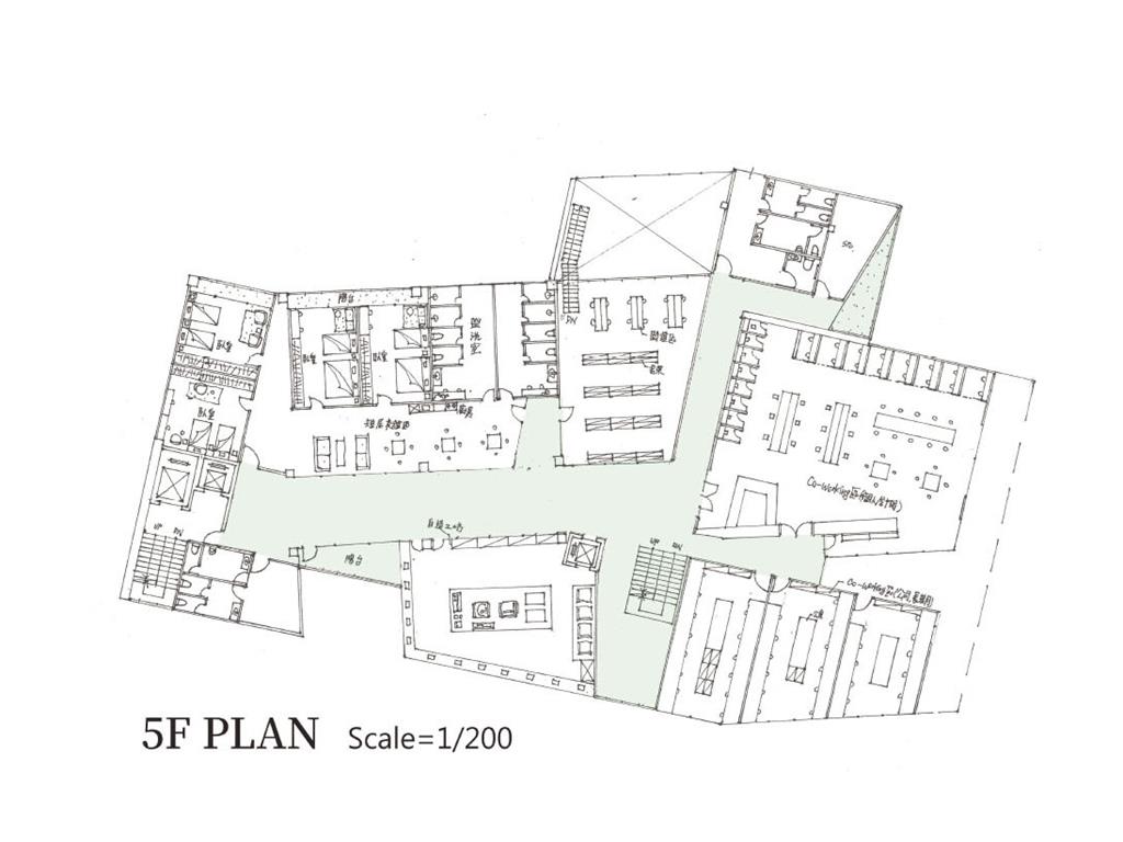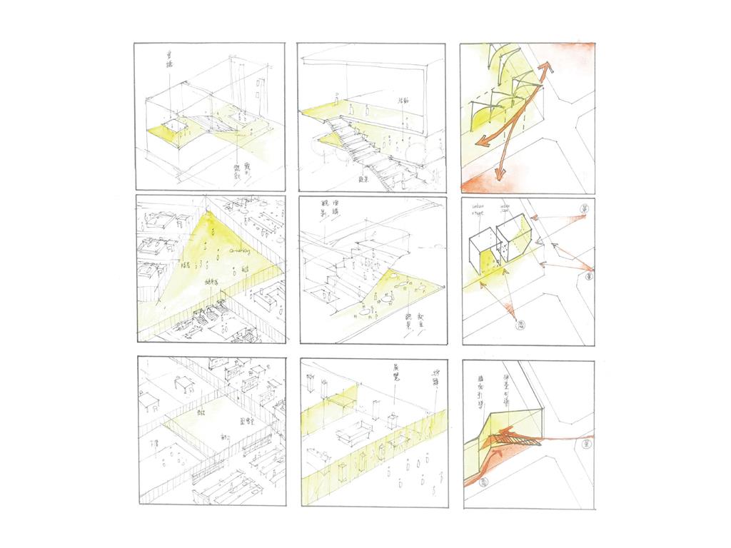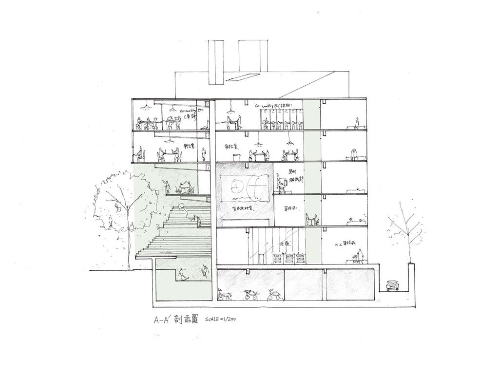 在動線上,我將樓電梯與廁所配置成十字的軸線,藉此引入陽光與風,也讓人能有效移動。這十字軸線為受管制的,使四、五樓的辦公與短居使用者能保有其領域,而在內部使用者和外部的互動上,一到三樓配置了一座獨立大斜梯,人們可以坐在上面觀賞懸日,或在斜梯旁空間活動(展覽、劇場、觀景走廊…)提供大眾一處24HR皆不受管制的都市活動場所。