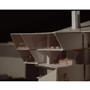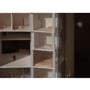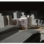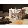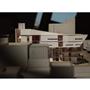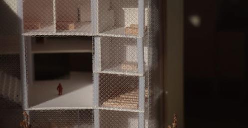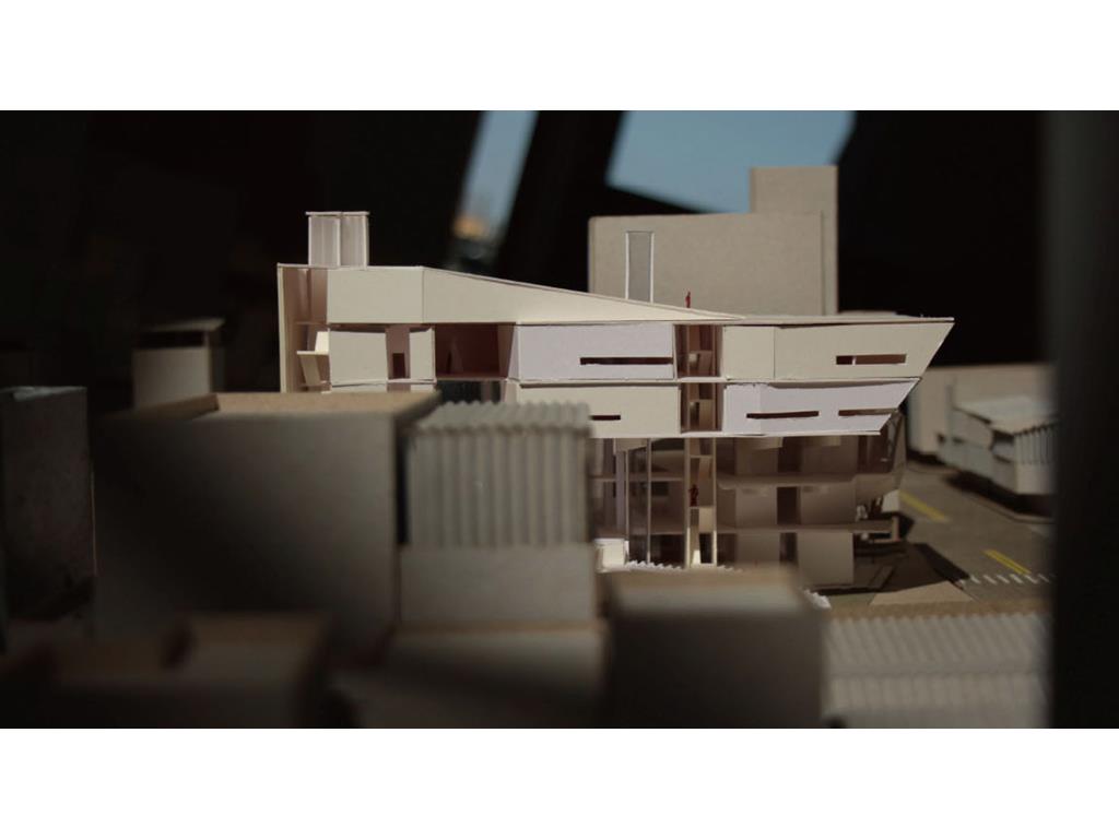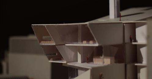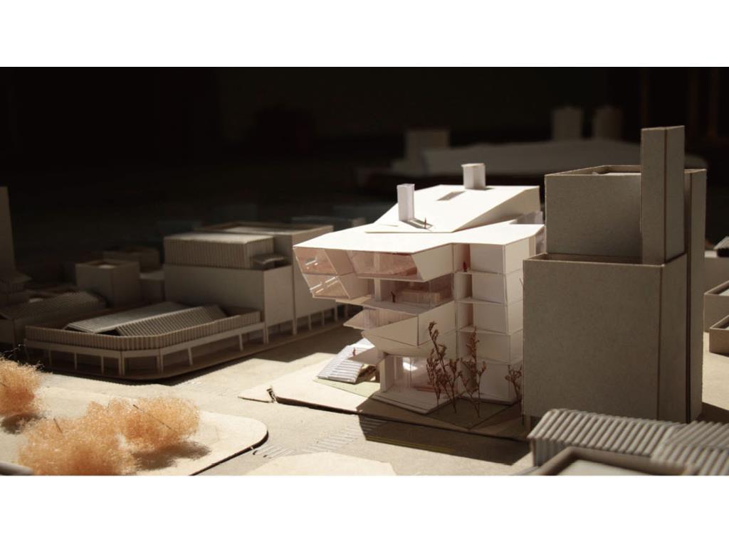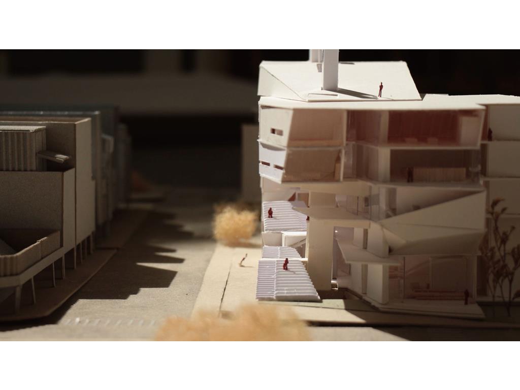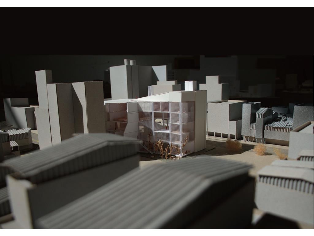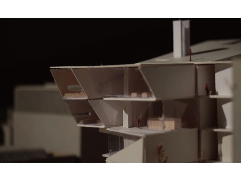 在動線上,我將樓電梯與廁所配置成十字的軸線,藉此引入陽光與風,也讓人能有效移動。這十字軸線為受管制的,使四、五樓的辦公與短居使用者能保有其領域,而在內部使用者和外部的互動上,一到三樓配置了一座獨立大斜梯,人們可以坐在上面觀賞懸日,或在斜梯旁空間活動(展覽、劇場、觀景走廊…)提供大眾一處24HR皆不受管制的都市活動場所。