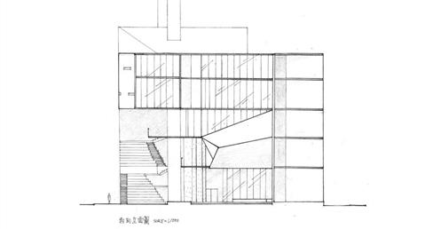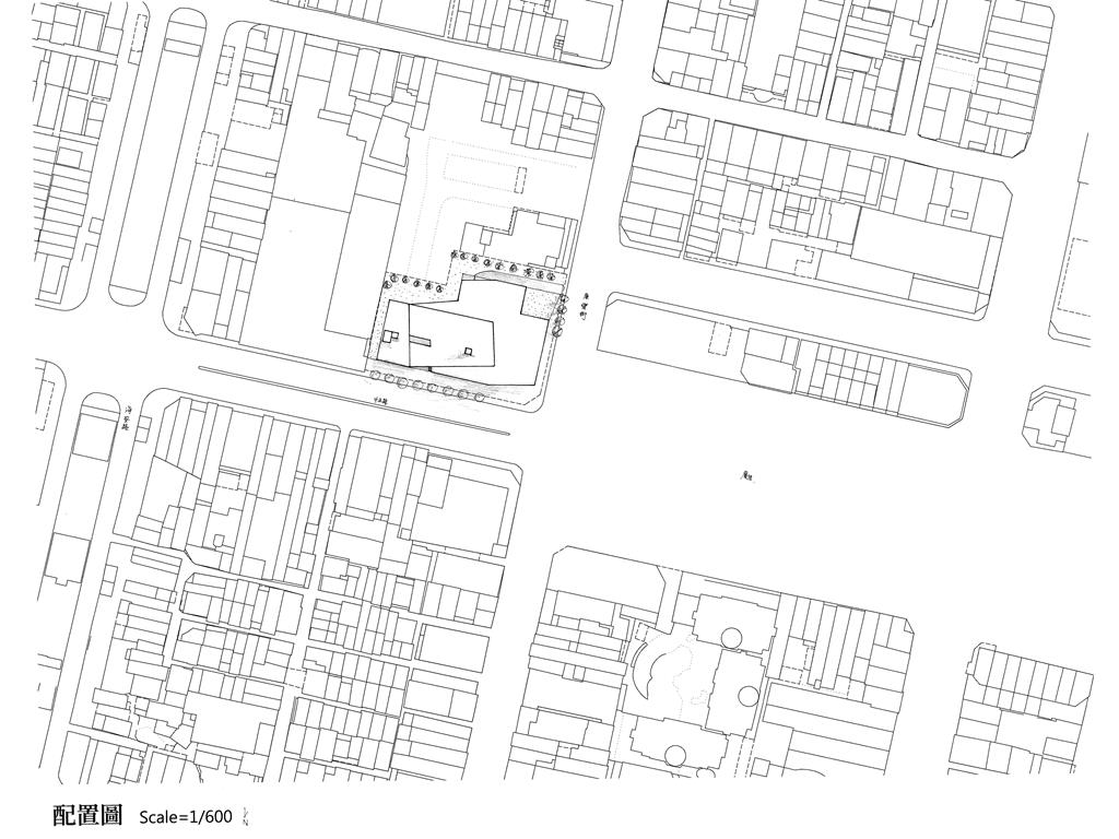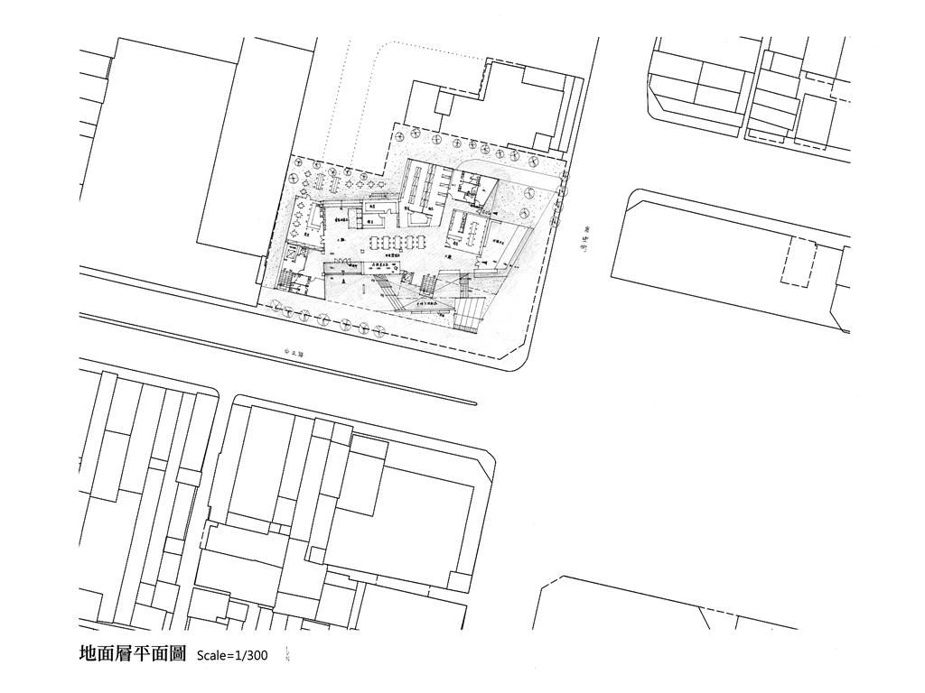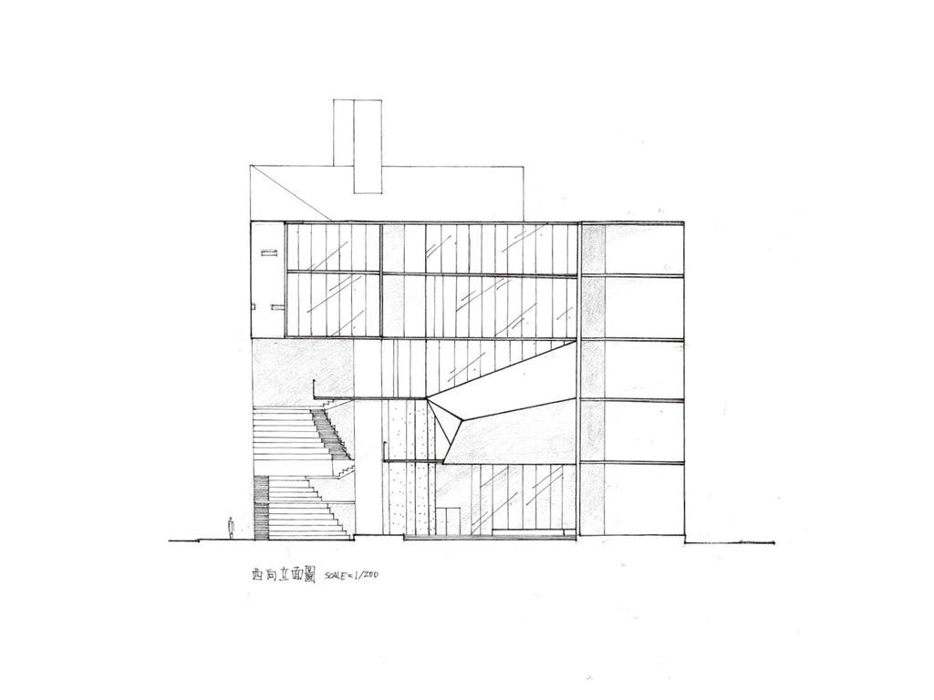 在外部空間的留設上,我將基地向中正路沿街面貼近,使垂直動線、大階梯、具都市舞台性質的空間都向其貼近,以產生生氣蓬勃的立面。也藉此留出了良好採光的後院,南向一側配置了教室、演講室、放映與表演空間、短居空間…等,能隔絕外在的噪音干擾,但仍保有良好景觀。