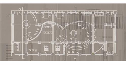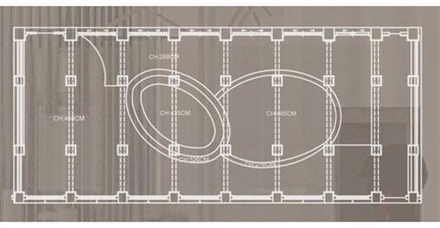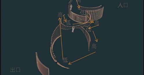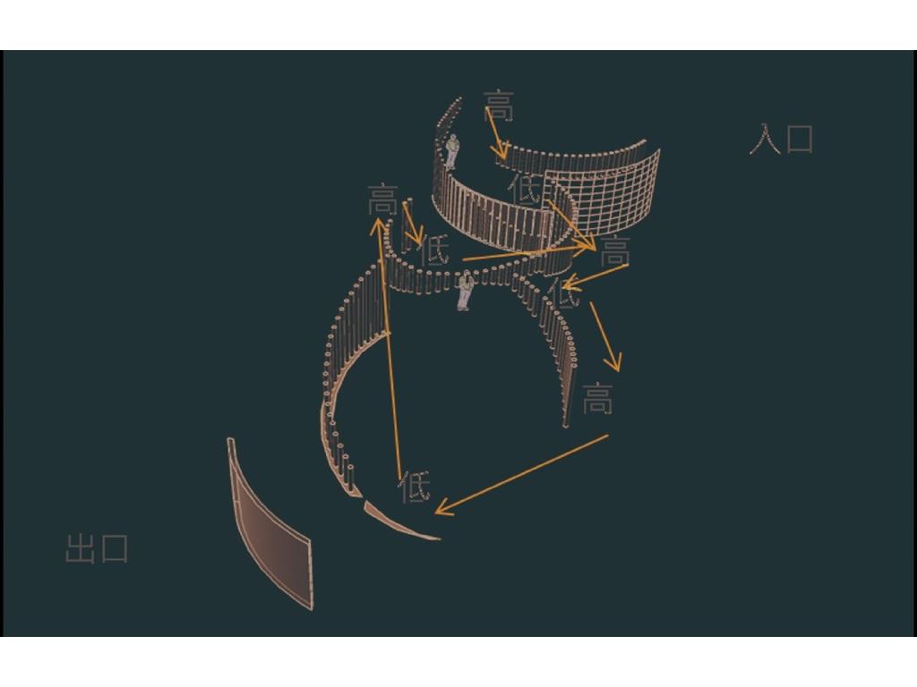 牆面部分的高度規劃是希望它能夠是一個有秩序有規律的流暢變化的牆面,由入門處的低延伸至高再傳遞給低牆,促成整個空間的牆面是迴圈自然的,並且引導出動線,自然的指引人的行為