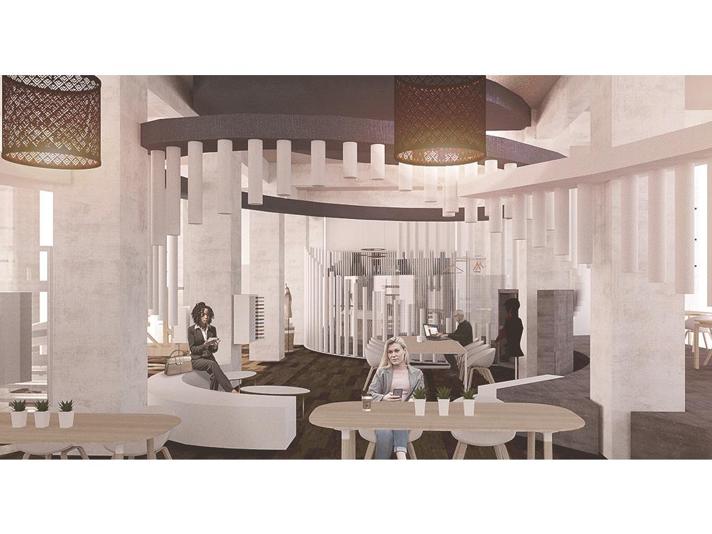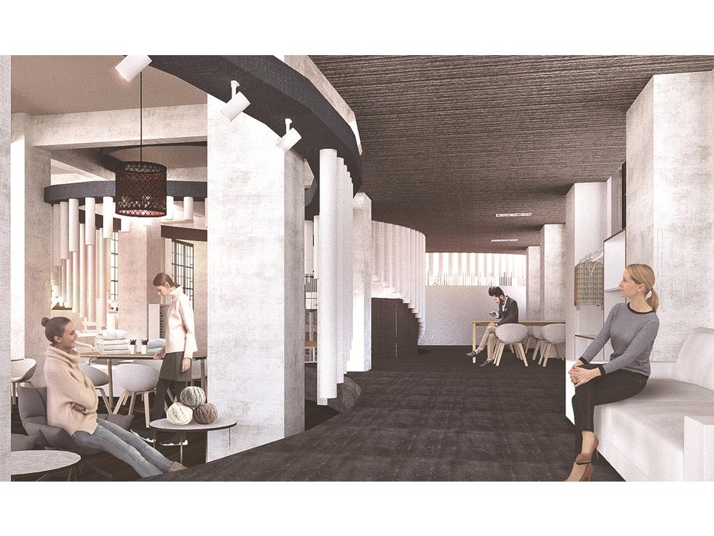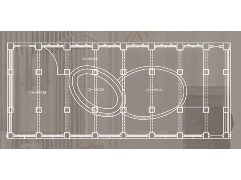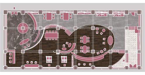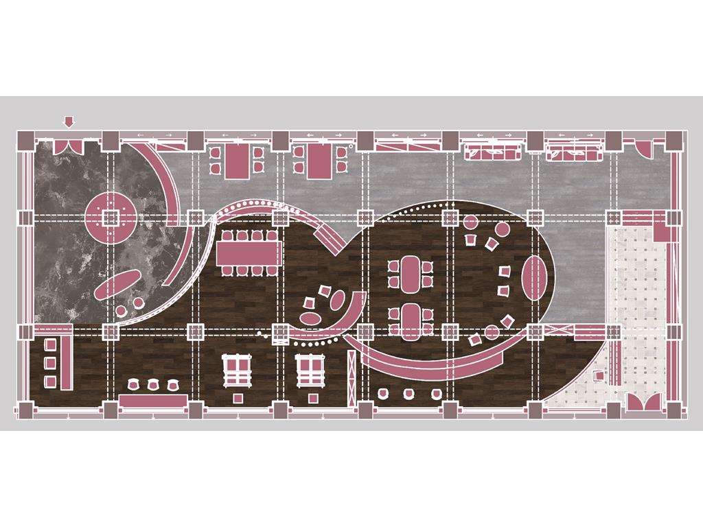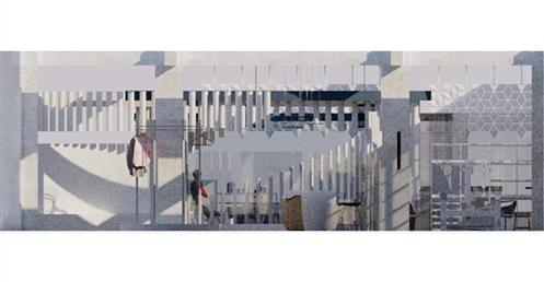 通過共同的愛好,將一個個的人(一個個的量體)彙聚到我們的基地,生活開始有連結,相識,對於空間來說,人是單個小量體,而對於更大的外面來說,也許工坊也是一個聚集的小點,正如天邊的星辰,一個小的量體,在不同的量體的比較之下會呈現出不一樣的狀況,列如與小的比則大,與大的相較則小。在空間上我們也採用編織牆面的手法去凸顯編織這一個特點在平面上,我們呈現的是一種串聯包裹的2D形式,在立面上,我們利用單個量體的長短你排列去圍塑空間的層次感,使他在不同的視角上能夠有獨特的交錯包裹。以大圈的大面積為自造者主要區域,根據人員類型規劃動線,利用T台高度,將它的功能變得不止於走秀,而是可以當作椅子進行利用。