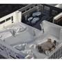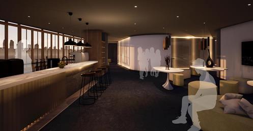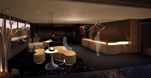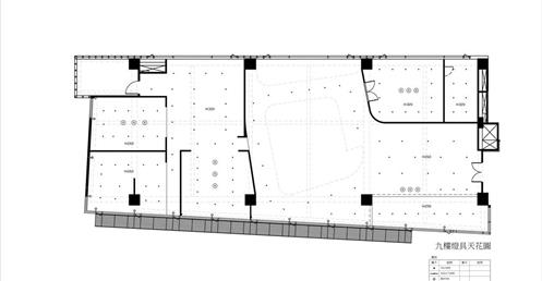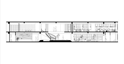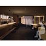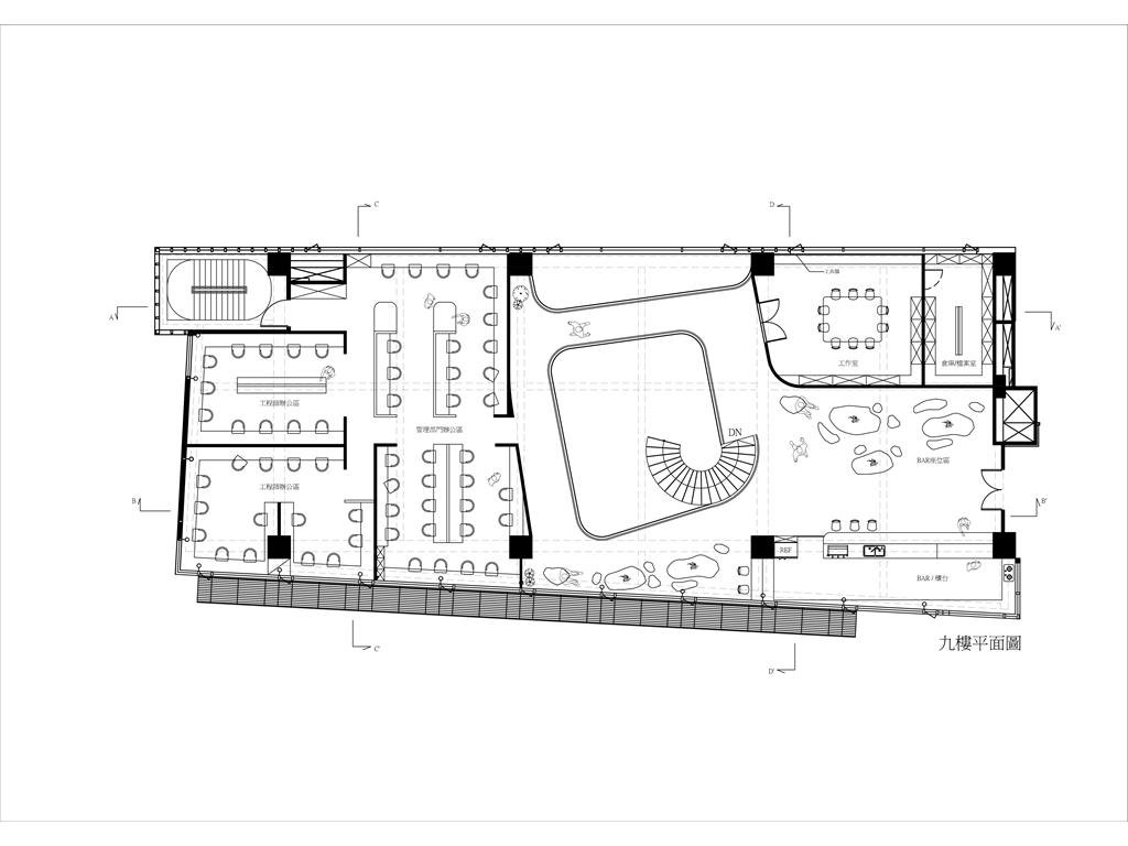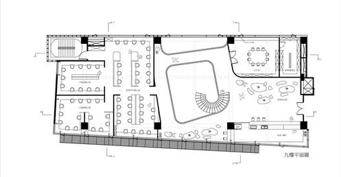 延續八樓有機體座位型態再做出變化。九樓配合八樓的休閒空間做了兩個挑空,挑空區周圍的牆是由玻璃纖維構成,創造出了與入口類似的廊道。咖啡廳善用了落地窗製造的自然光線,整體空間更加寬敞明亮。