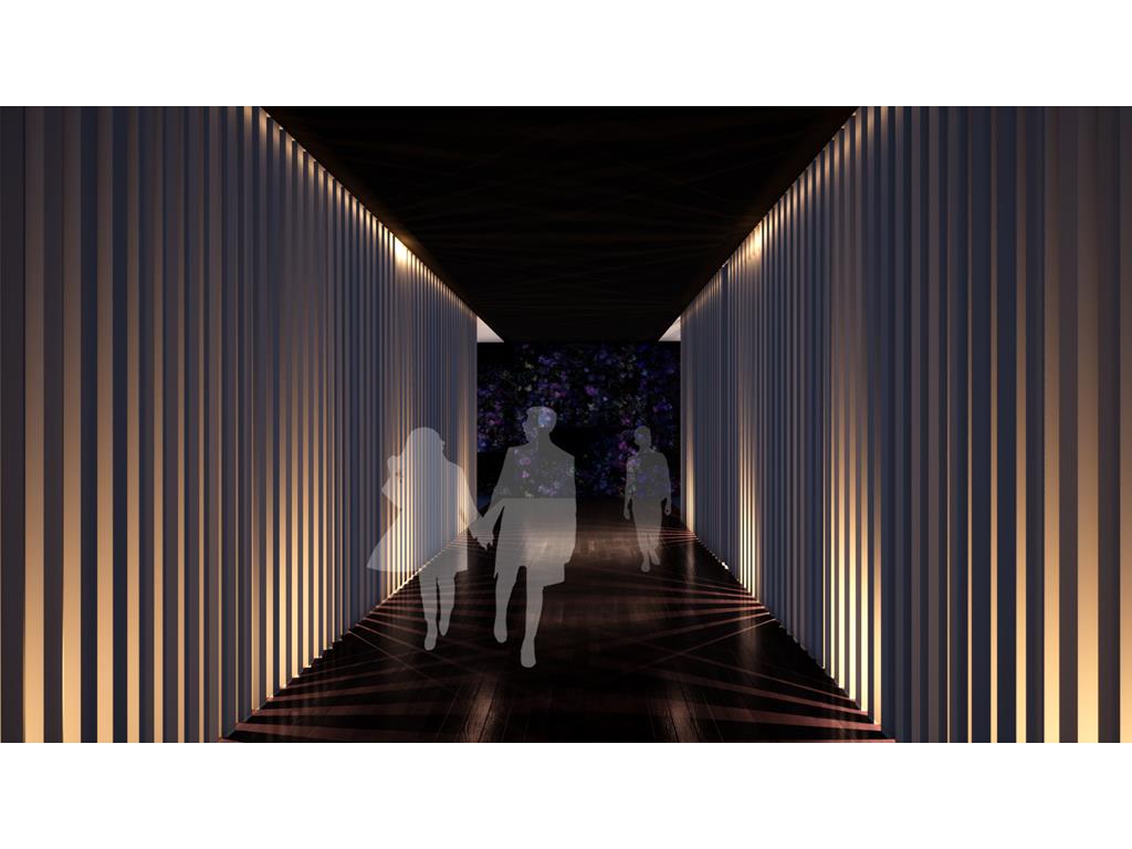 從進公司的那一刻即是一種身分的轉換,從個體進入到生態系,我們打造了具有儀式感的廊道希望每一位蒞臨的人能直接的體驗並感受到TeamLab的品牌精神。入口運用了感測裝置,讓人在走動的同時廊道旁的燈會隨之亮起。