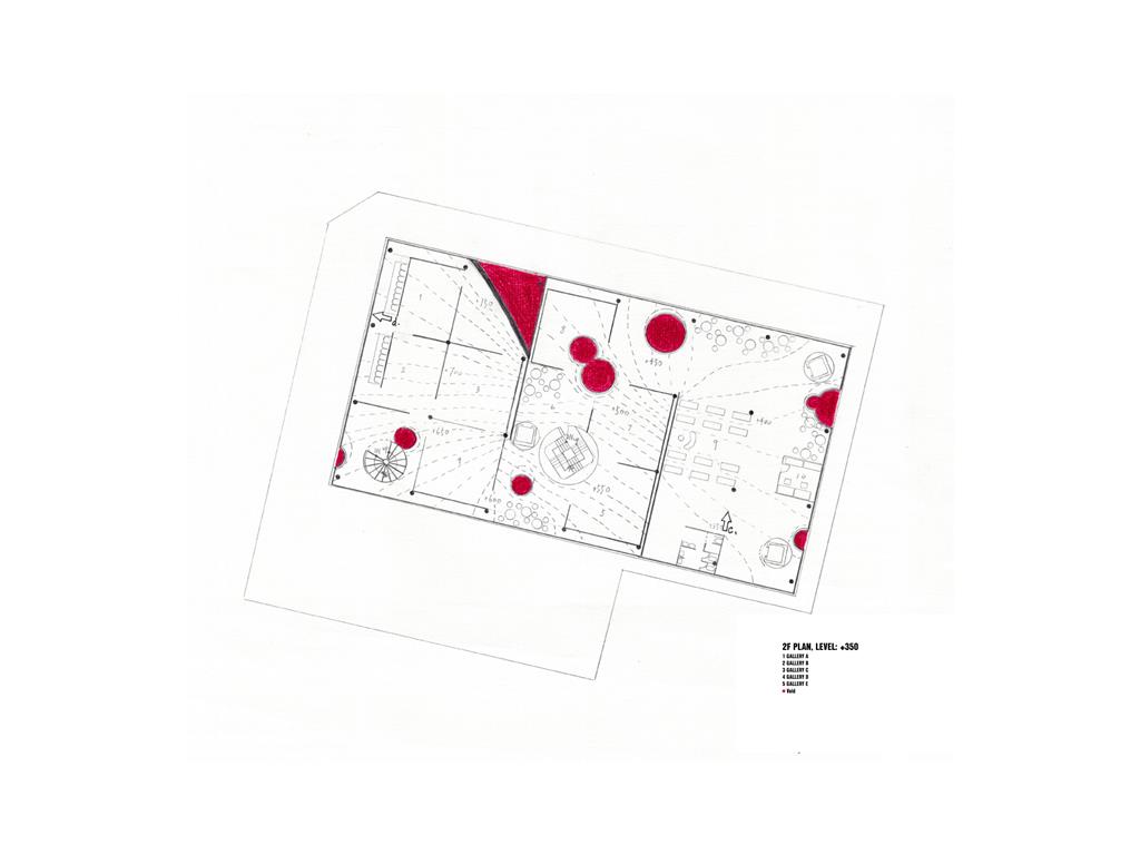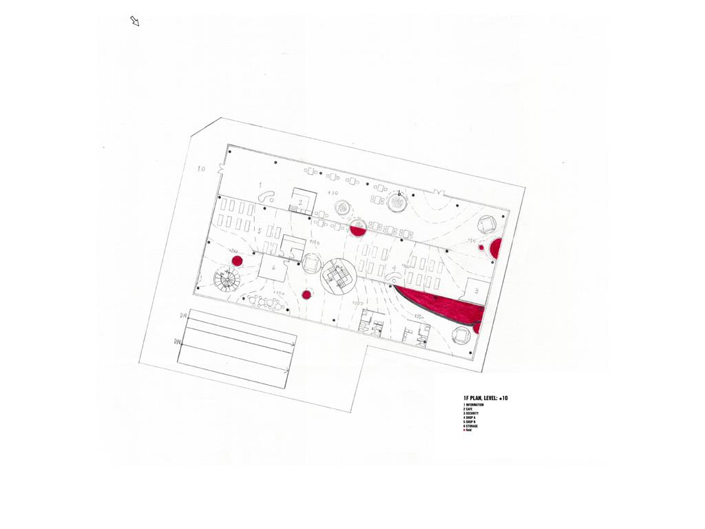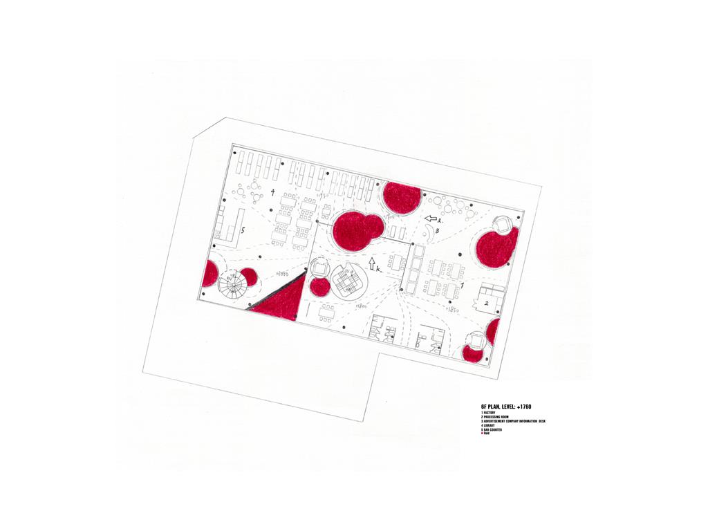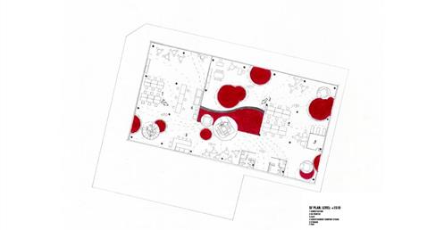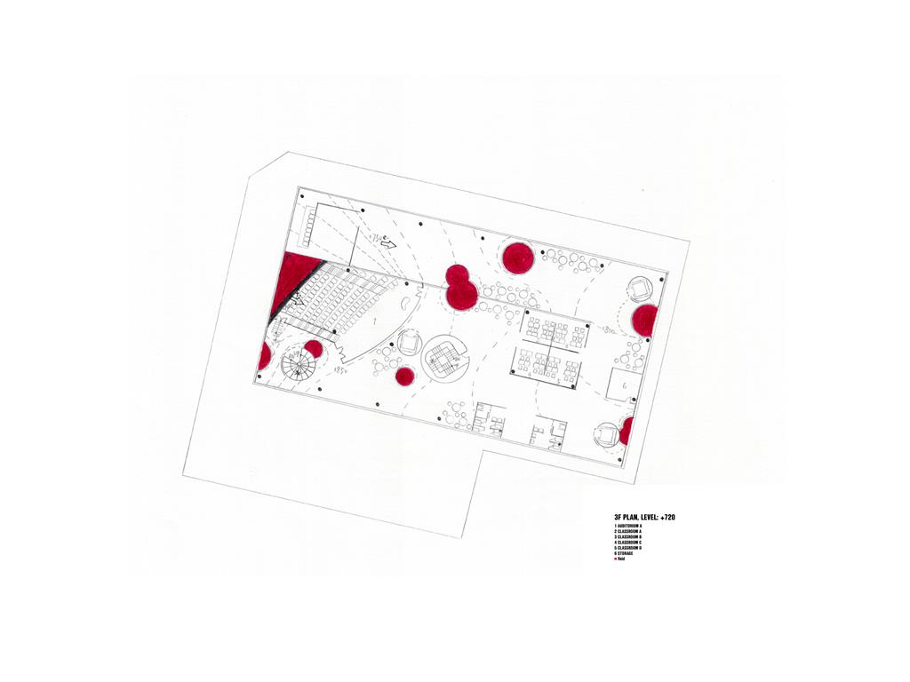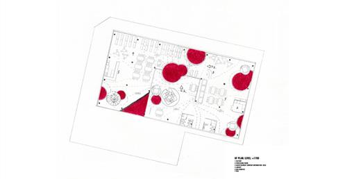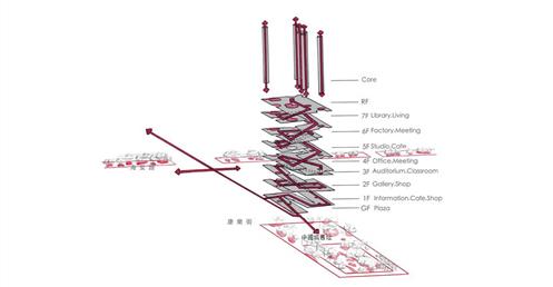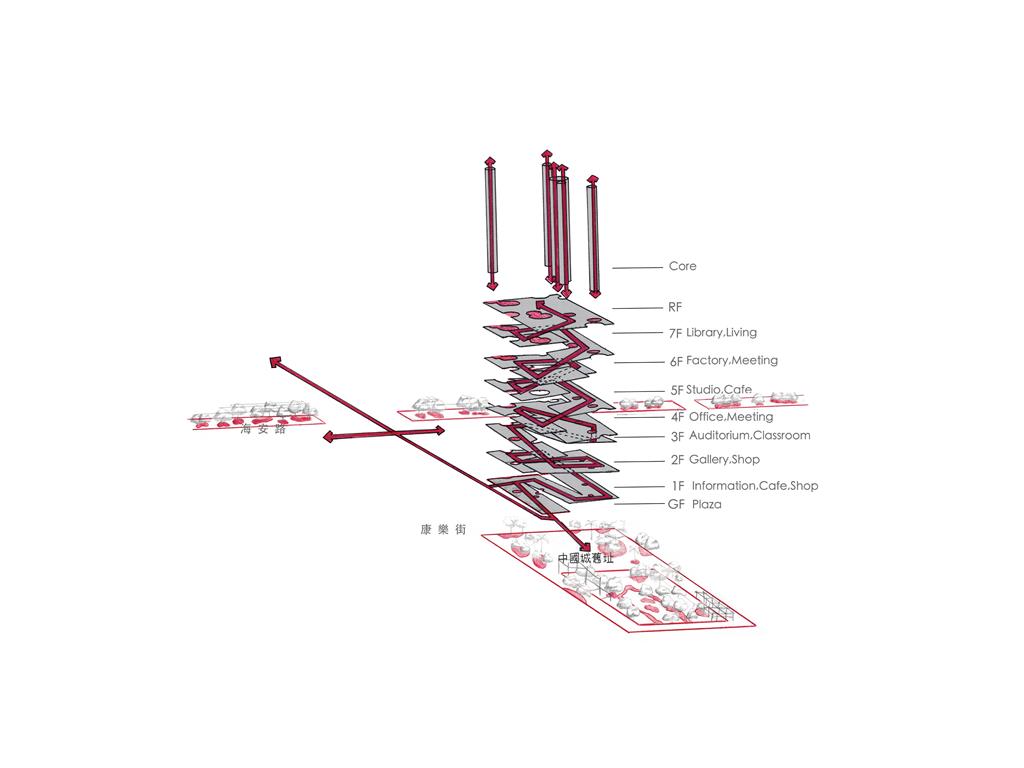 以實體虛體與樓板交疊操作,使得空間產生滲透性,實體與虛體交互產生使得人的活動產生互融 ,實體作為直接性的互動,虛體則柔化交融形式,空間的滲透性在此產生;樓板的交疊,使得人在空間的活動並不是純粹的垂直水平性移動,以三維曲度樓板型式作為空間分界,而非以牆做為區隔,空間的內外分界變得曖昧且多樣,人與人之間的互動產生多樣維度的交疊。