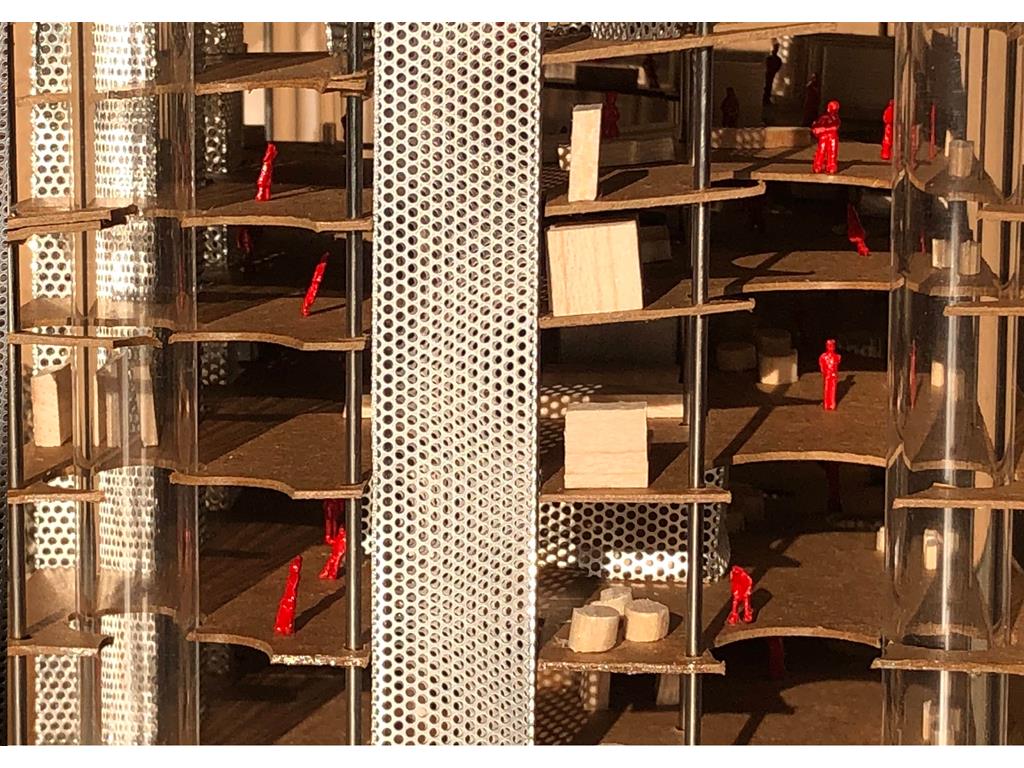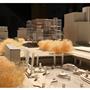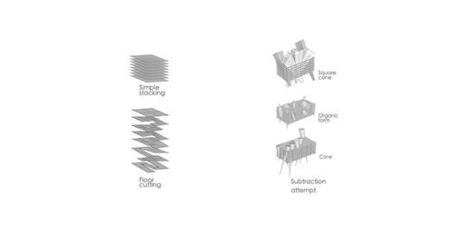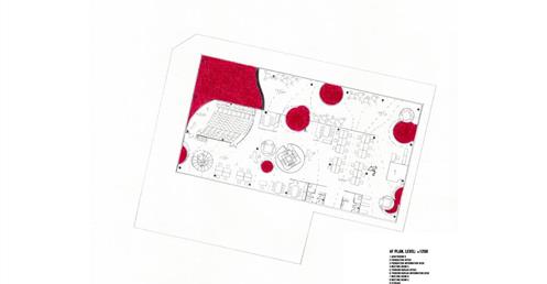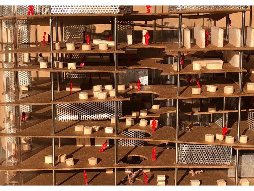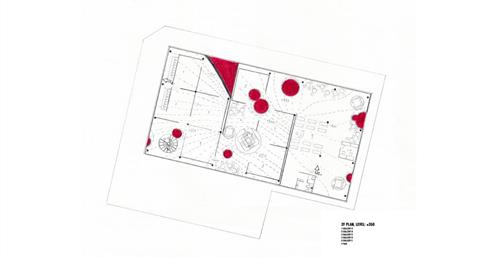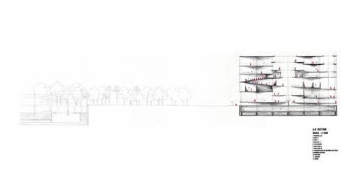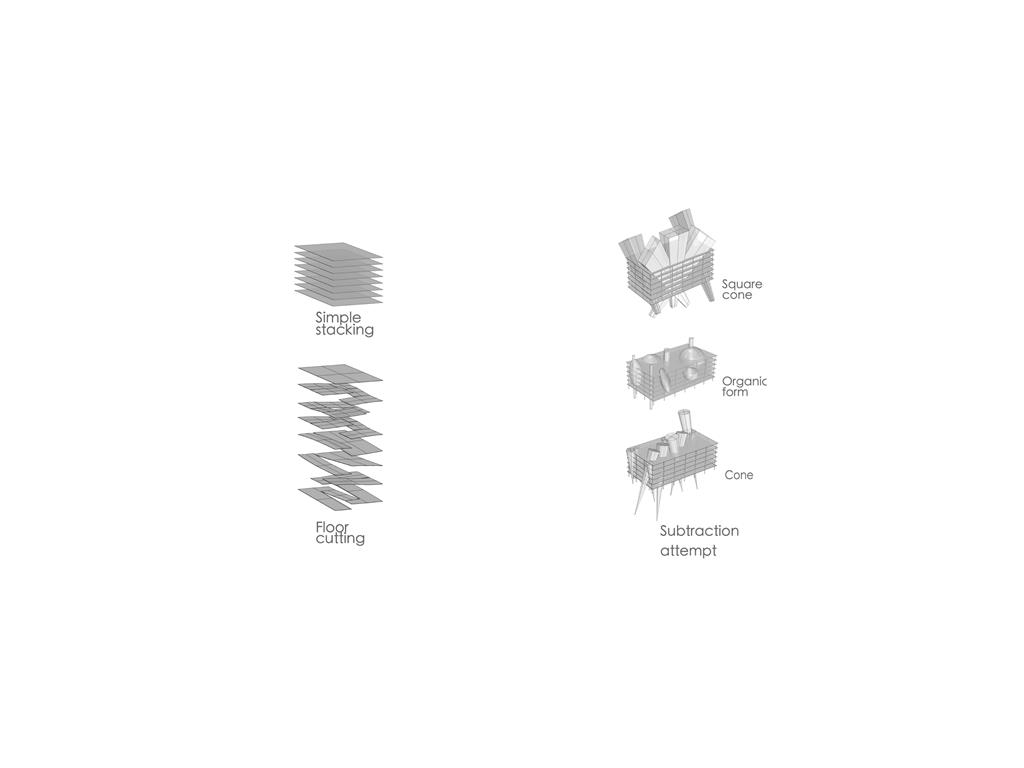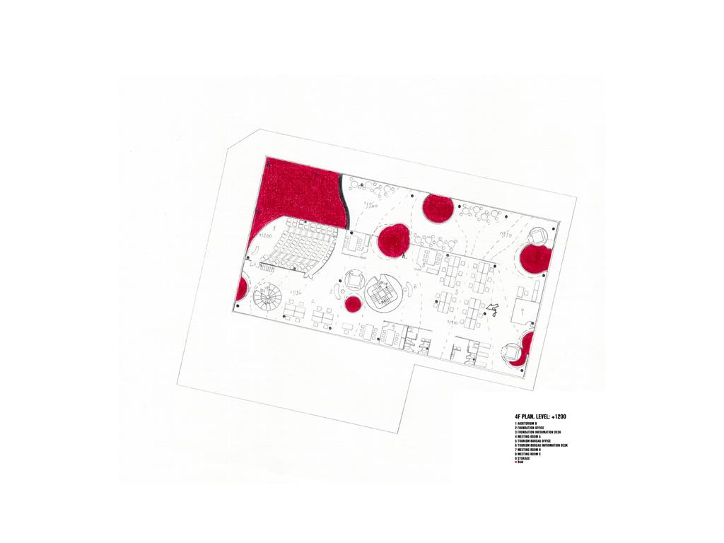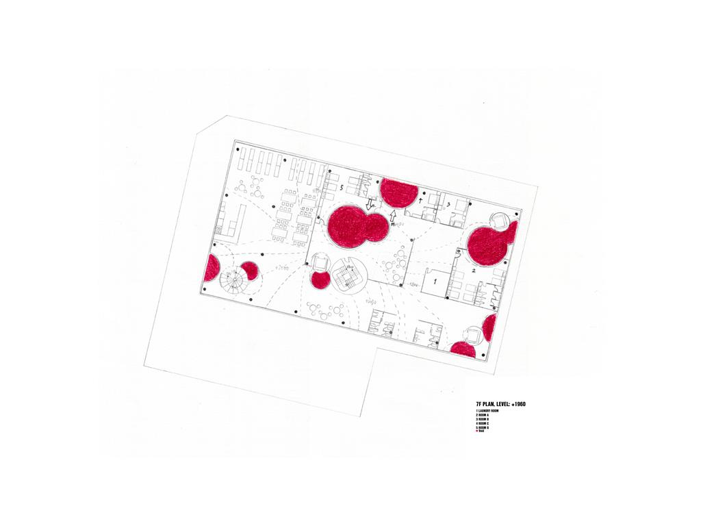 以實體虛體與樓板交疊操作,使得空間產生滲透性,實體與虛體交互產生使得人的活動產生互融 ,實體作為直接性的互動,虛體則柔化交融形式,空間的滲透性在此產生;樓板的交疊,使得人在空間的活動並不是純粹的垂直水平性移動,以三維曲度樓板型式作為空間分界,而非以牆做為區隔,空間的內外分界變得曖昧且多樣,人與人之間的互動產生多樣維度的交疊。