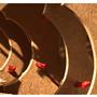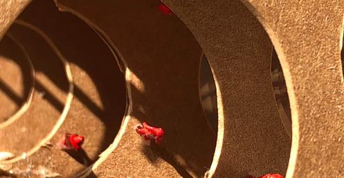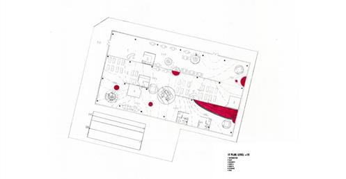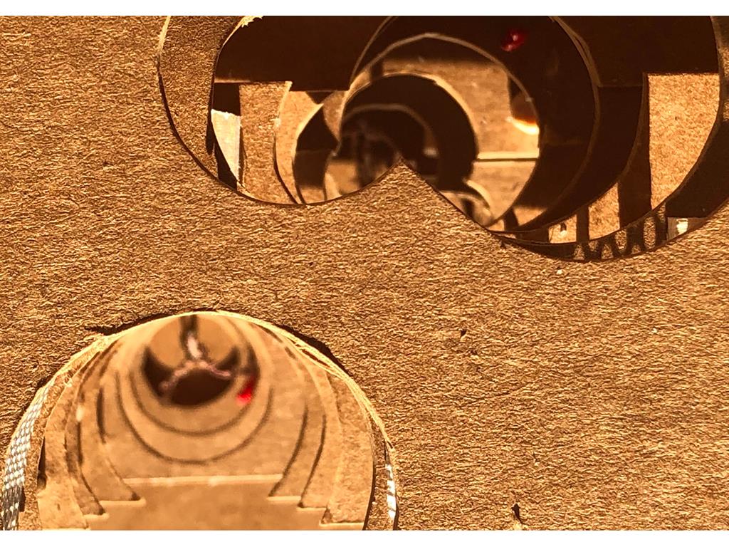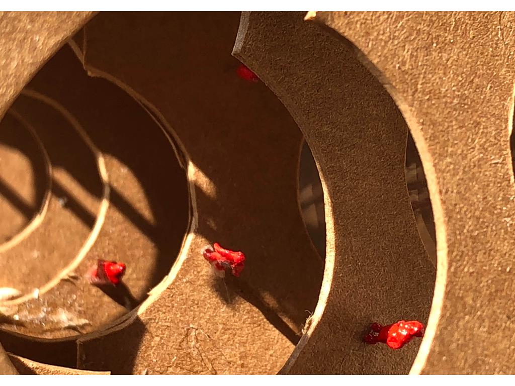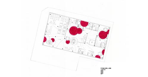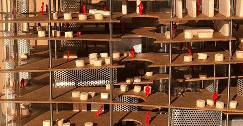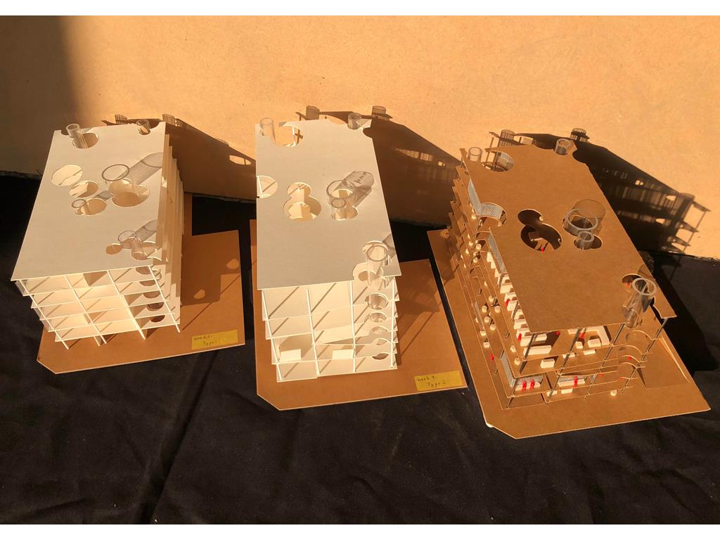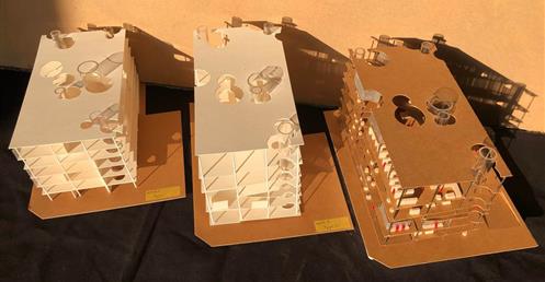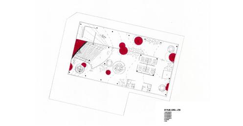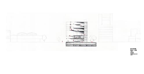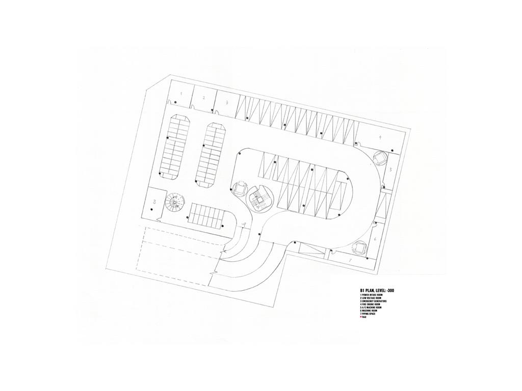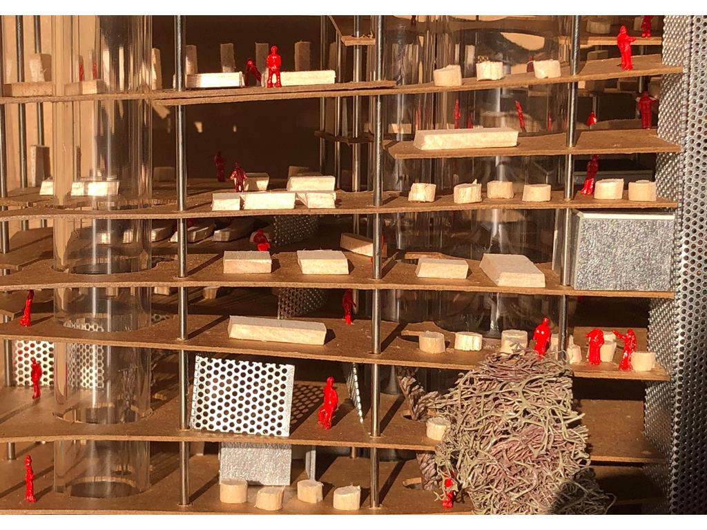 以實體虛體與樓板交疊操作,使得空間產生滲透性,實體與虛體交互產生使得人的活動產生互融 ,實體作為直接性的互動,虛體則柔化交融形式,空間的滲透性在此產生;樓板的交疊,使得人在空間的活動並不是純粹的垂直水平性移動,以三維曲度樓板型式作為空間分界,而非以牆做為區隔,空間的內外分界變得曖昧且多樣,人與人之間的互動產生多樣維度的交疊。