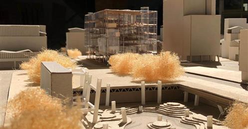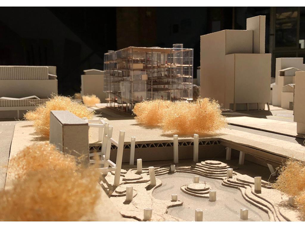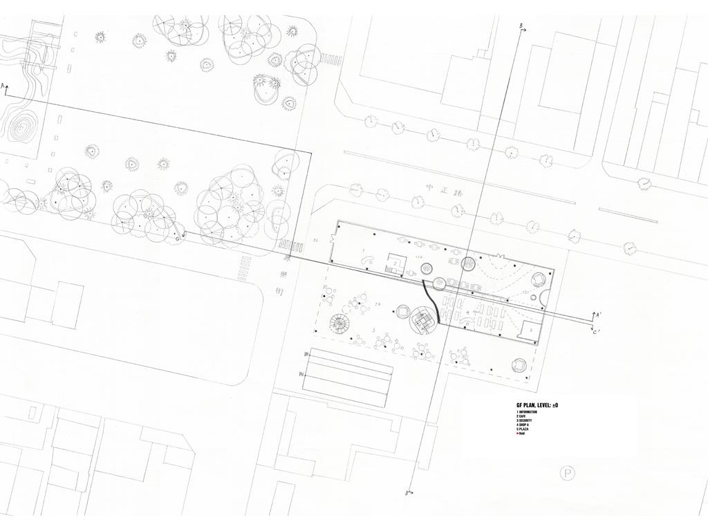 基地斜對角為近期由MVRDV所規劃的廣四廣場,儀式性的保留原有中國城舊址基礎,內部以有機的潟湖型態作為回應運河的空間處理,本次設計以此為空間原型基礎,以方體內部有機化的形式回應,創造出更佳且豐富的空間體驗。
