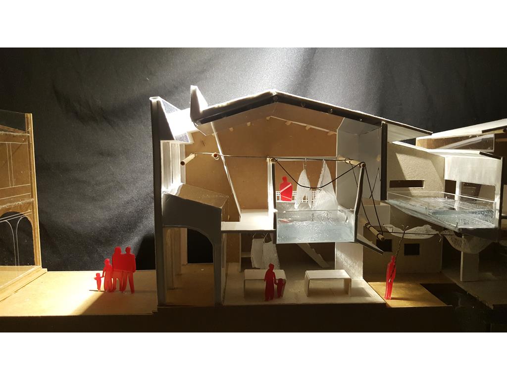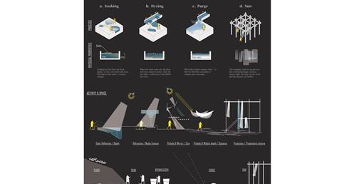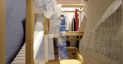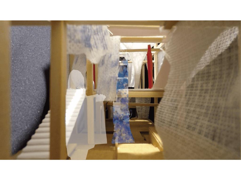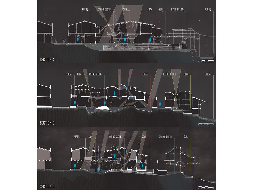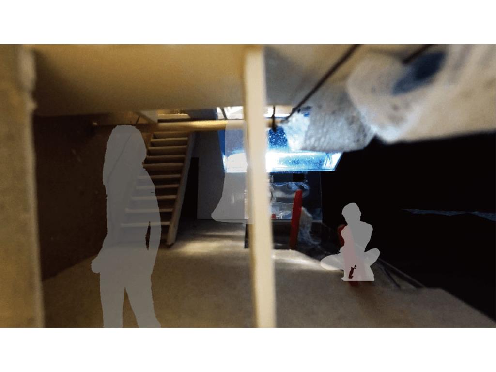藉由自然光經過不同的水進入下方的藝廊空間讓人們藉由光與成像的方式來體驗藍染的作業空間與動作。