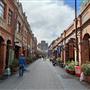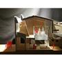 進入這條街屋,上方清洗室灑下來漫漫水波的柔美光線點亮了整個販賣部。再向前,進入中庭的染布體驗,靛藍染劑從上方緩緩滴入水中後暈開,小孩子在染槽中的玩耍濺起白色的泡沫,迎接上方即將入水的反射光線。穿過街屋,映入眼簾的是擬街屋,木架上披掛著染後深淺不一的布,藉著光映下藍色漸層的倒影,指引著人們穿梭至溪邊的路徑。穿梭其中,上方的雨漏斗將雨水不時滴落,就在即將臨溪邊的剎那,溪面上的曬布架瞬間展開,讓純色的溪景似乎被套上了名為三峽藍的濾鏡。