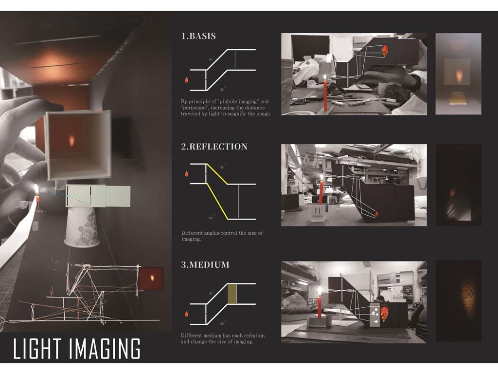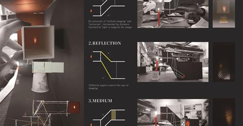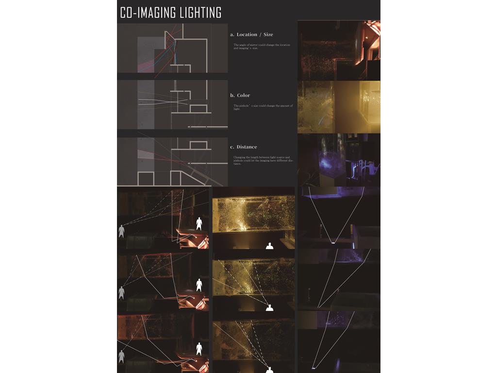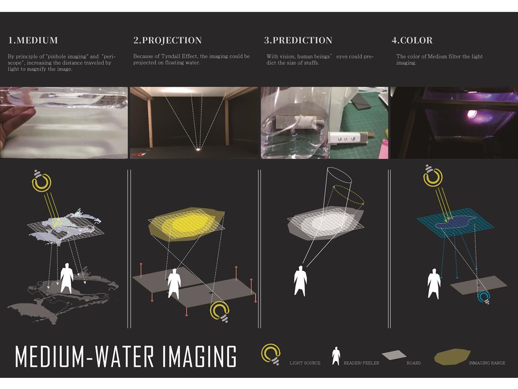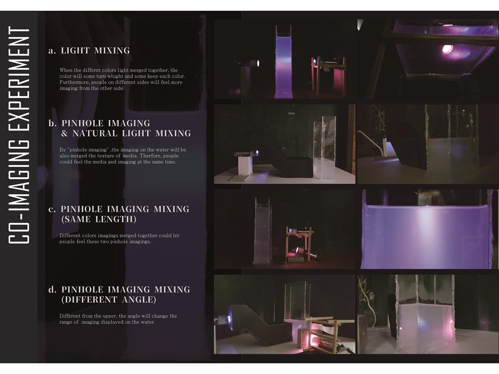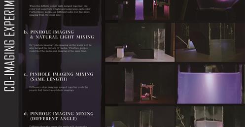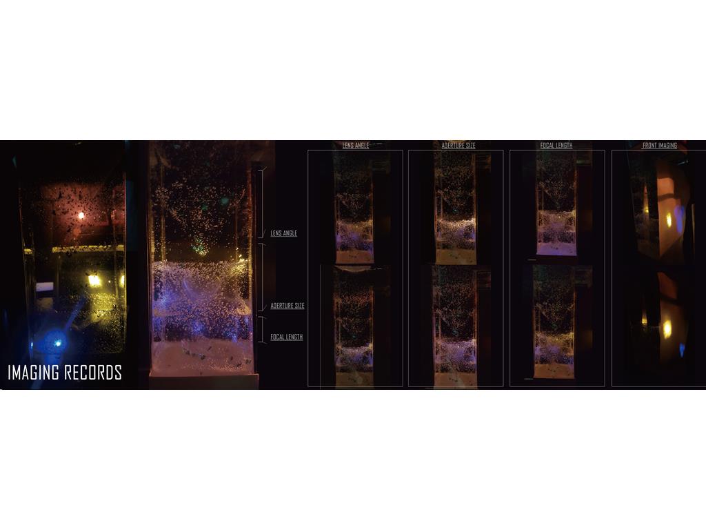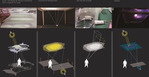 我做了一系列的光學實驗,發現反射的角度及次數會改變成像的大小,介質的狀態會改變成像的紋理、顏色及位置,並製成三種不一樣改變成像的裝置,實驗一場光+水+成像的空間劇場。發現空間中的訊息會藉由直接+間接+扭曲的方式傳遞到人的眼中,讓不同的空間之間產生一種特殊的空間關係。