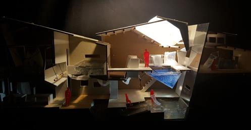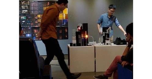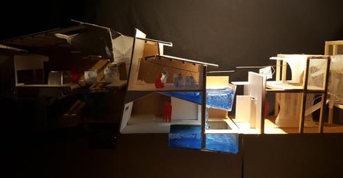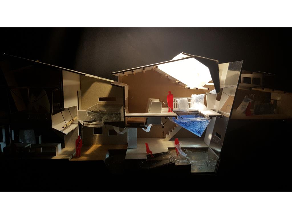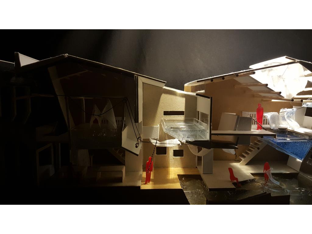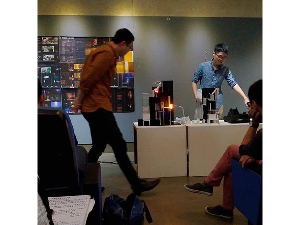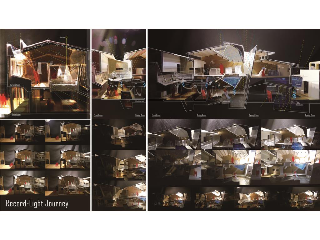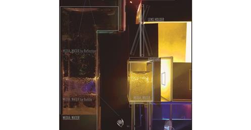 我做了一系列的光學實驗,發現反射的角度及次數會改變成像的大小,介質的狀態會改變成像的紋理、顏色及位置,並製成三種不一樣改變成像的裝置,實驗一場光+水+成像的空間劇場。發現空間中的訊息會藉由直接+間接+扭曲的方式傳遞到人的眼中,讓不同的空間之間產生一種特殊的空間關係。