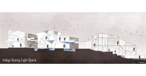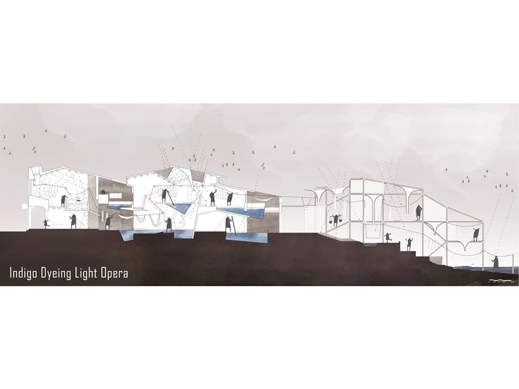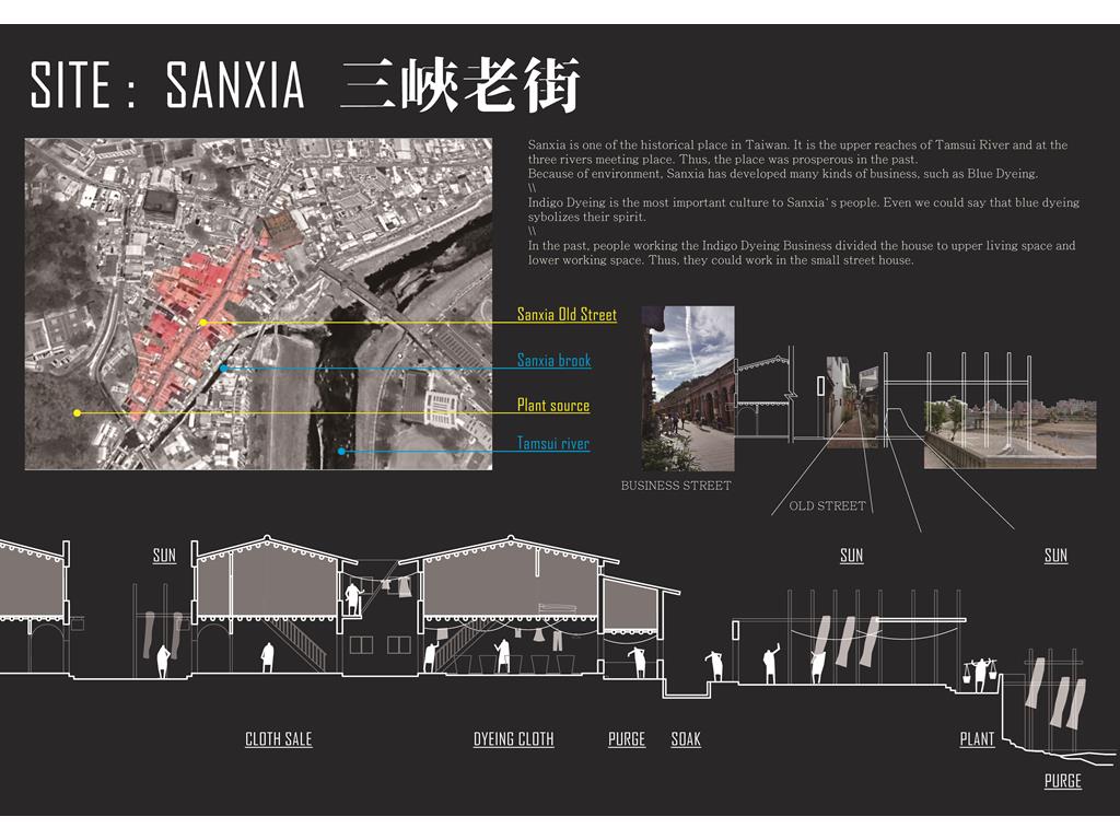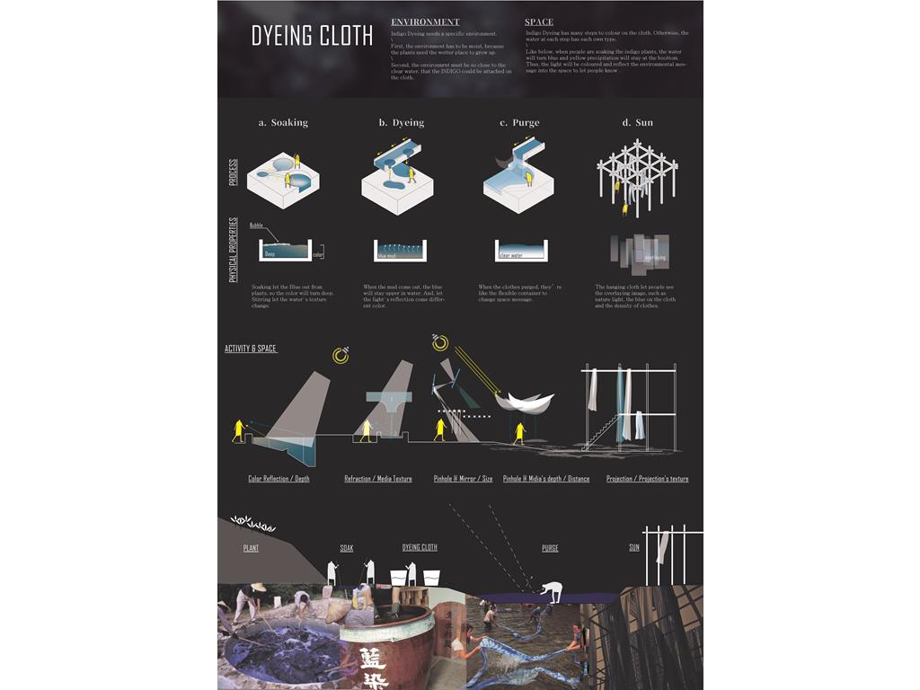 藍染,是三峽是三峽老街重要的文化之一。在過去街上的藍染工作坊,人們在街屋中染布,在老街與三峽溪之間曬布,因此三峽溪成為他們生活中重要的一部分。然而,老街的整建,老街的轉型,人們與三峽溪的關係漸漸薄弱,因此我希望介入藍洞成像現象研究,透過 藍染。光之劇場 作為三峽溪與老街的連結,並重新架構溪與藍染與老街的關係。