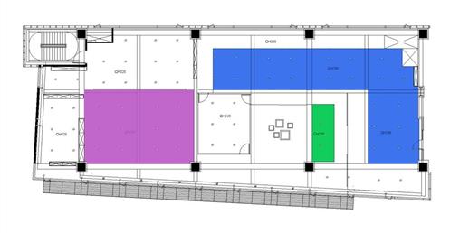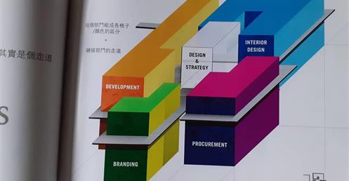 在八樓的部門有黃色的管理與行銷部門,九樓的部門則分別有紫色的工程部、青色的品牌營運部門、淺藍色結合了藍色的設計部門與白色的創新部門,為設計與創意部。