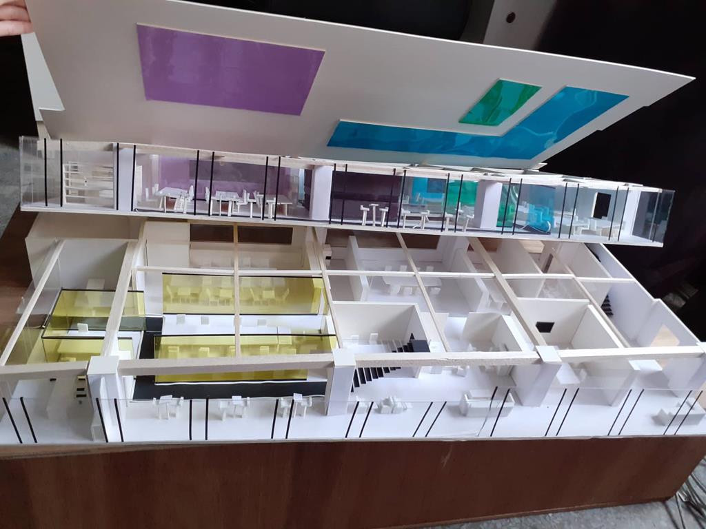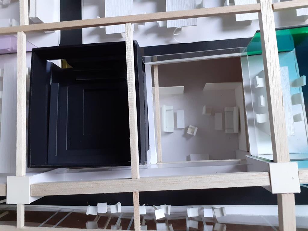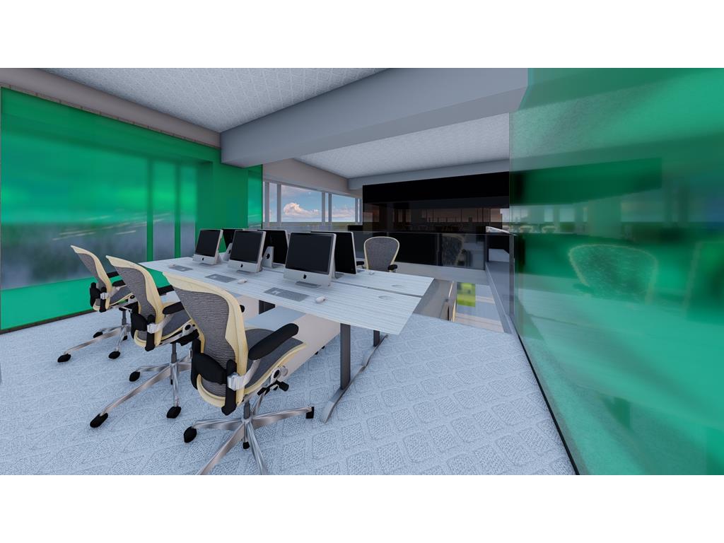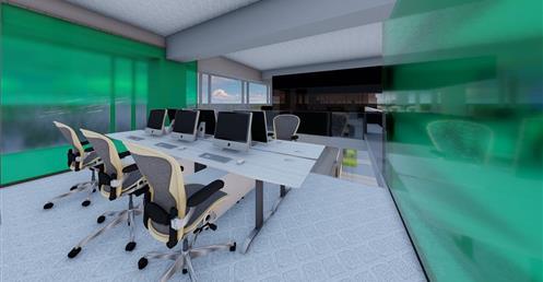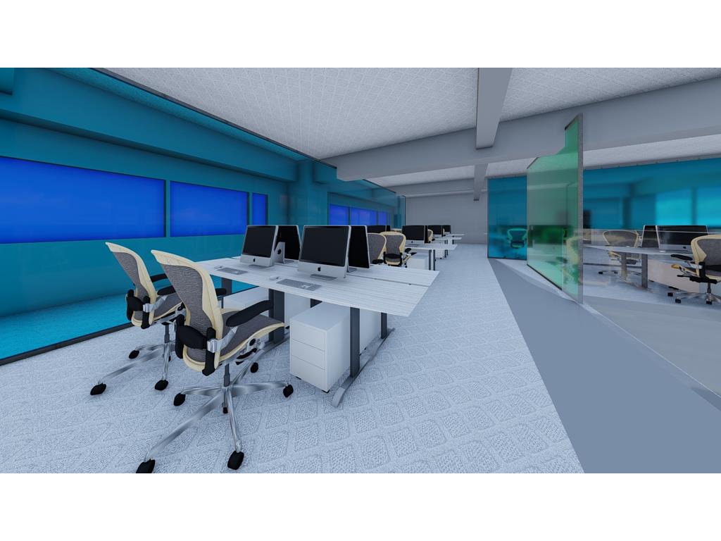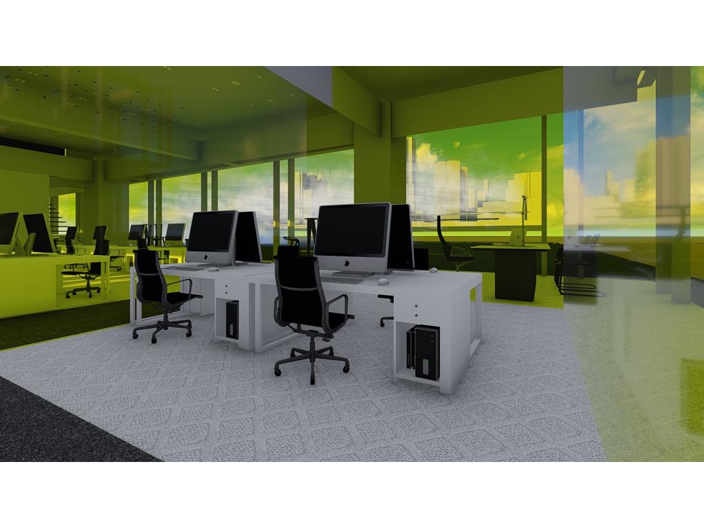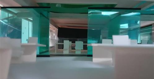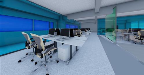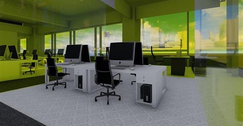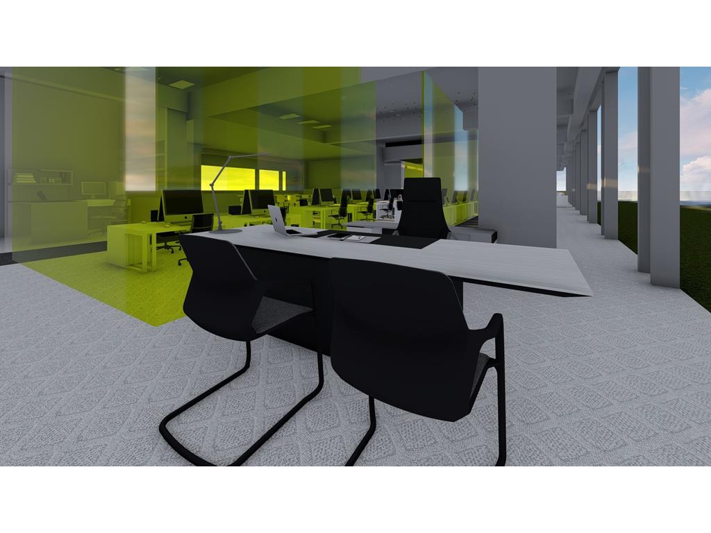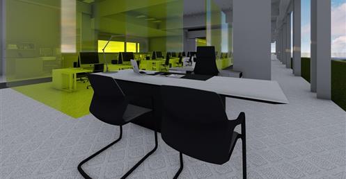 首先依據原Logo的5個顔色的格子,把各個部門也用彩色玻璃圍成格子,玻璃隔間區分領域的同時也保持通透性,玻璃為綠色環保材料,可回收再利用。