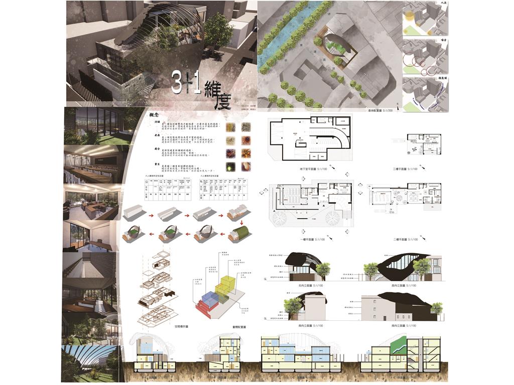 4維即3維加入時間。3代表建築師本身,1是建築師的經歷,3+1就是建築師成長里程,搭配基地的觀察整合出---淬鍊~疤痕~癒合~重生---4個過程。