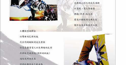 work1 自介 平面處理以大樹為基礎概念,表現從小到大成長過程,以家庭、家人為根基,興趣為支持,最後以樹脂的交織生長,期許未來發展的多元性。 模型部分,以彎曲的瓦楞紙版,代表一區蜿蜒的成長歷程,但是憑藉家人以及興趣支持終將突破困境(傾斜紙板),也期許自己能成為別人的動力。