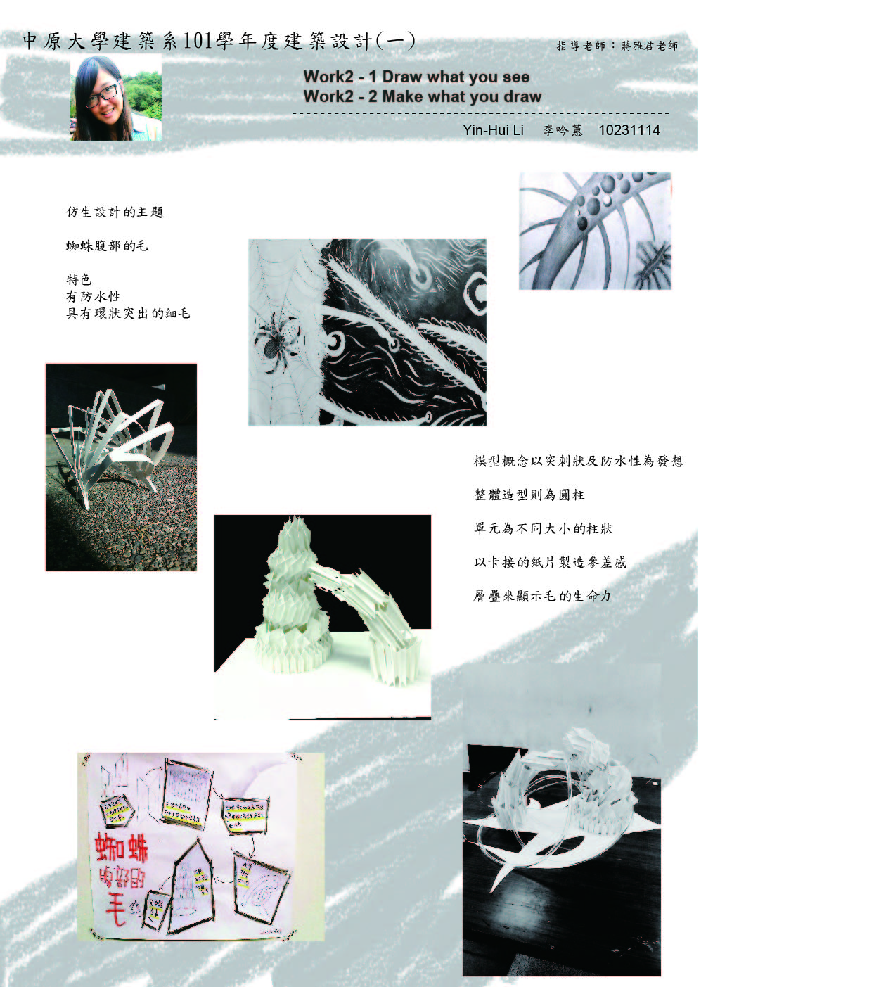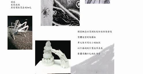 work2 仿生 以蜘蛛腹部的纖毛為主體發想,模型概念以防水性為出發,整體造型參考毛的型態為圓柱,單元為不同大小的柱狀卡接而成,卡楯的紙片製造參差感,層疊凸顯毛的型態。