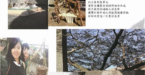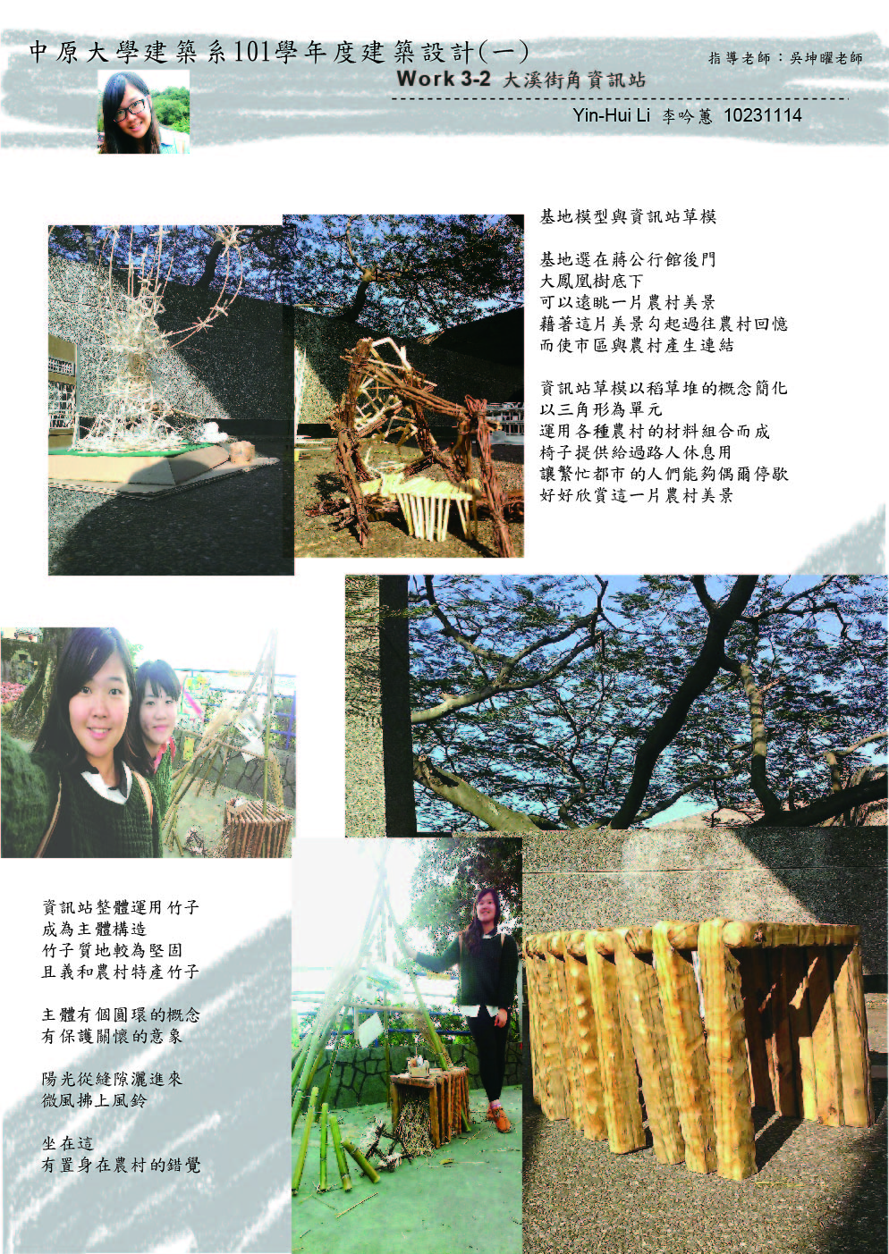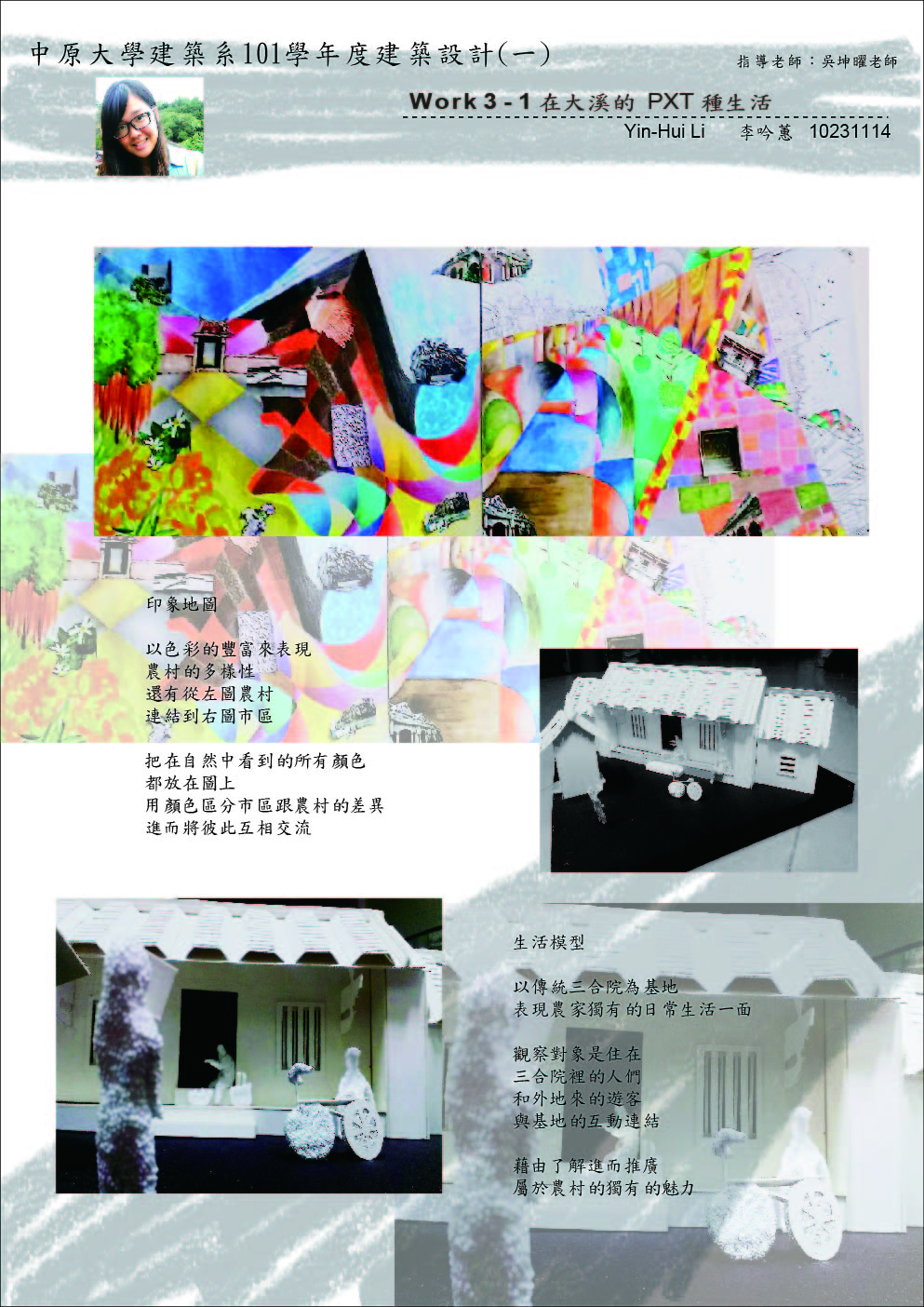 work3 資訊站 印象地圖,以色彩豐富表現農村作物多樣性,從圖面左邊連結到右邊市區,進而彼此交流。 生活模型,以傳統三合院為基地,表現農家獨有的生活,觀察對象為原住在合院的農民、外地遊客,與基地的互動有無,藉由了解基地特質,進而推廣農村。 基地模與資訊站,基地選在蔣公行館後門,藉著一片農村好景勾起人們對農村的意向,使市區與農村產生連結,整體以竹子為架構,圓環有包容保護之意,象徵農村的溫暖,陽光從竹子縫隙撒下,搭配著微風,亦有讓人置身農村之錯覺。