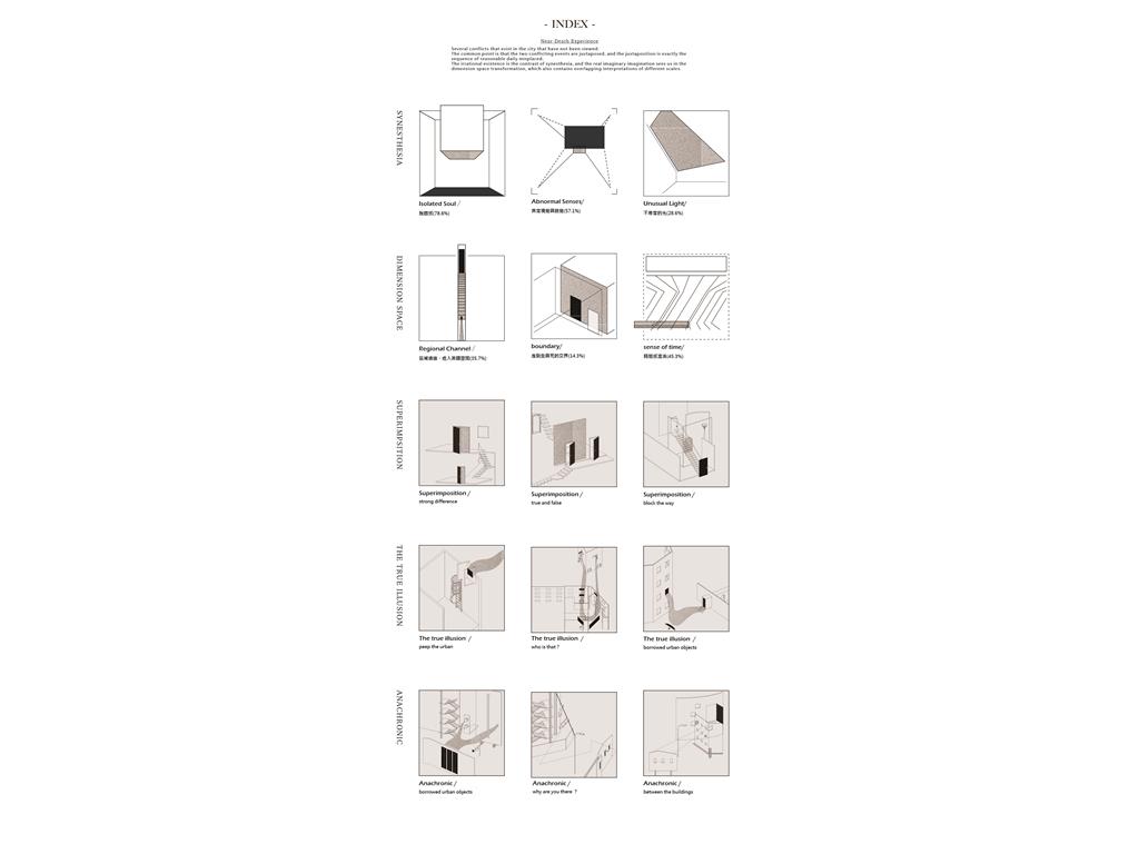 在瀕死者的陳述中談到,你將感受到的會顛覆你既定理解的任何觀念:「時間不是線性的。」或許是多重覆蓋,甚至拆解成元素;時間與時間重疊發生,進而組成時間。在建築中假設已理解的觀念:人、物、事件、空間被分離和錯置,建築的慣有組構被打破並在不同的軸線上被重組。