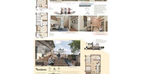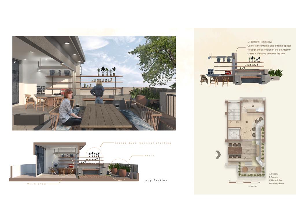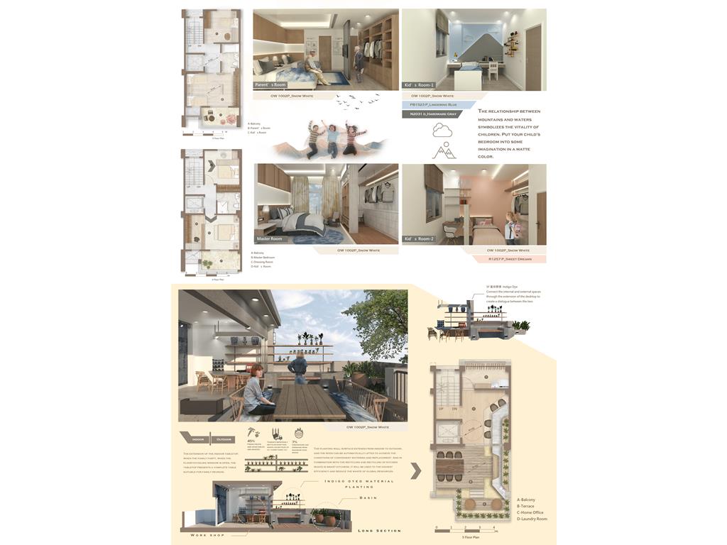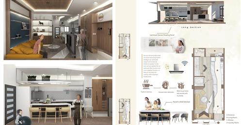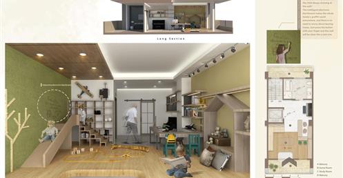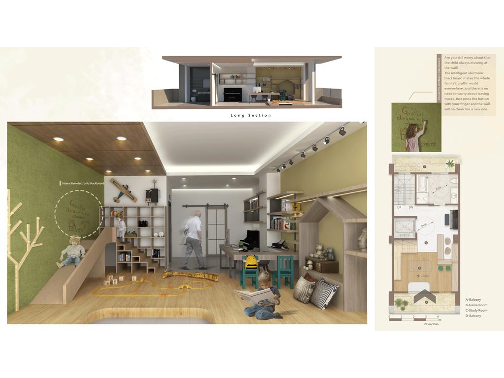 透天厝是台灣常見的居住形式,通常是多世代一起居住。但在生活中往往會面臨到的問題是不同代之間的生活習慣、興趣嗜好、日常活動......都有很大的不同。最後造成每一代都分開來居住,大家互不干涉互相的生活,讓一個家缺少向心力。此次的設計我們要改變傳統的問題,在不同的樓層的公共空間依照家庭成員的興趣喜好及互動關係,使用不同的主題,使每一個家庭成員在不同的空間享受不同主題帶來的體驗,加強成員間的互動,同時也保有一定的隱私。我們也將業主設定的部分帶入設計主題中,同時在空間的構想中考量到無障礙的活動進而產生一些退縮。另外我們也在此設計案使用智慧家居系統,將每一樣對於這個家庭重要的功能置入,比如天氣預報、居家管理、老人照護、氣體偵測等等…使一個家庭的功能變得更加豐富,創造出一間屬於三代家庭的住宅。