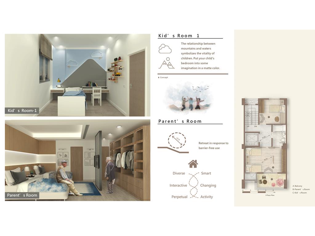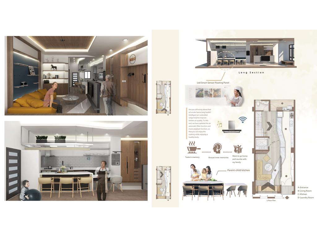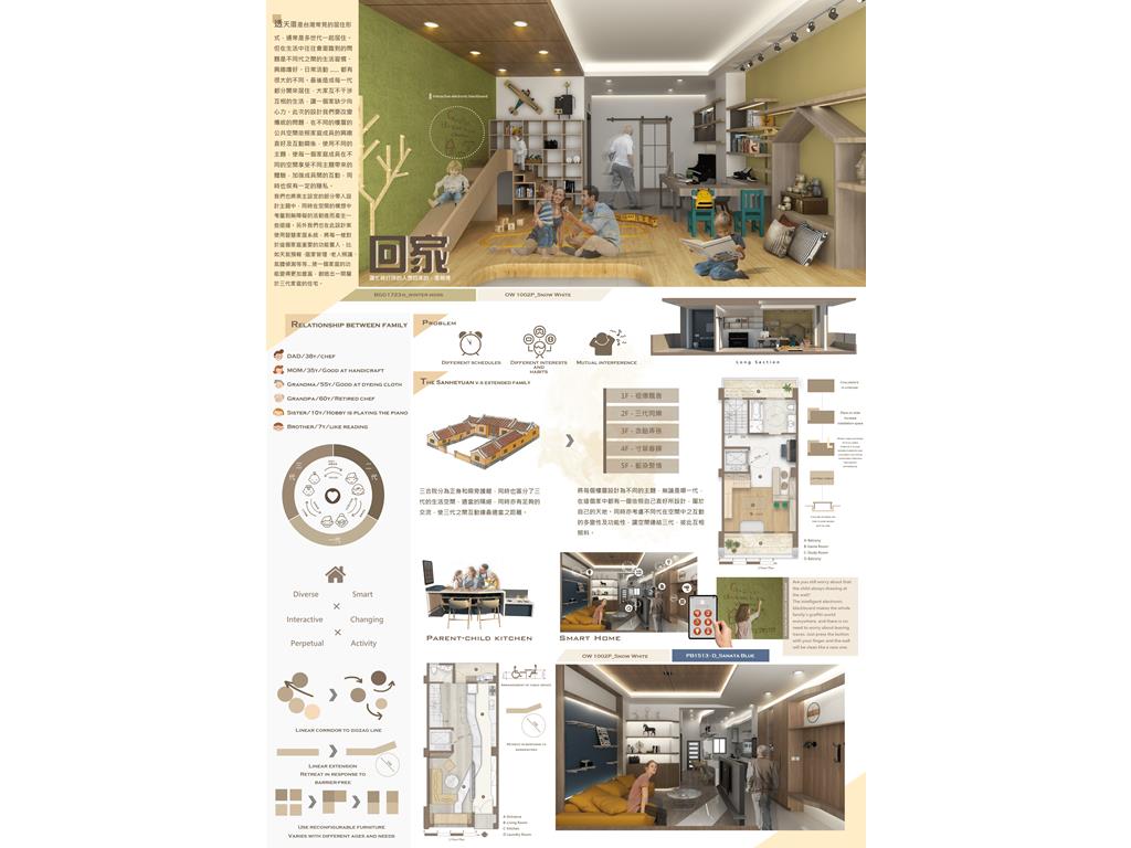 In this design, we have to change the traditional problem. In the public spaces on different floors, according to the interests and interactions of family members, use different themes, so that each family member can enjoy the experience brought by different themes in different spaces. Strengthen the interaction between members while maintaining some privacy. We also bring the part set by the owner into the design theme, and consider the barrier-free activities in the space concept to generate some retreat at the same time. In addition, we also use the smart home system in this design, and put in every important function for this family, such as weather forecast, home management, elderly care, gas detection, etc ... to make a family's functions more abundant. Created a home belonging to three generations families.