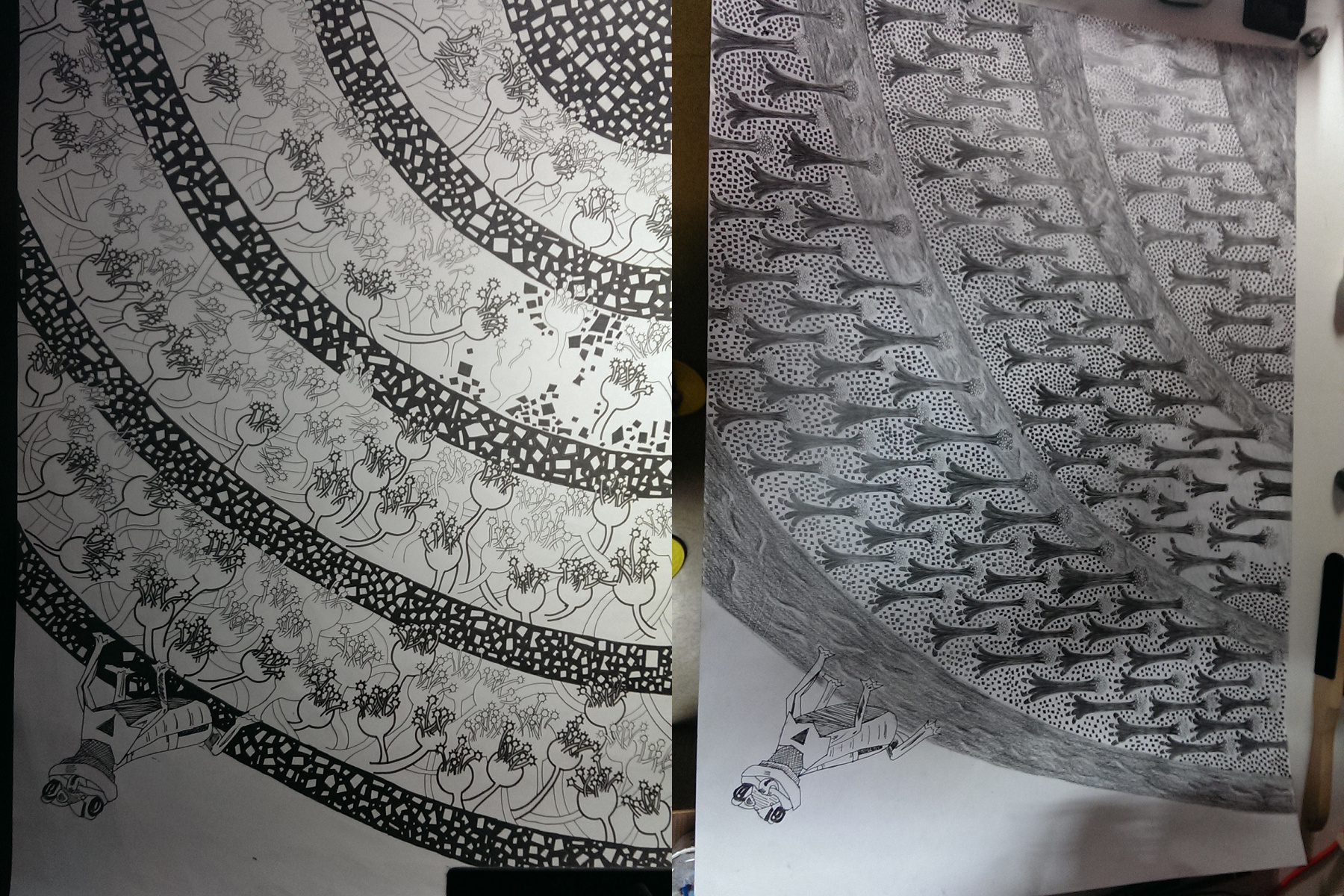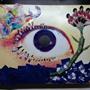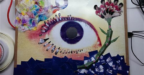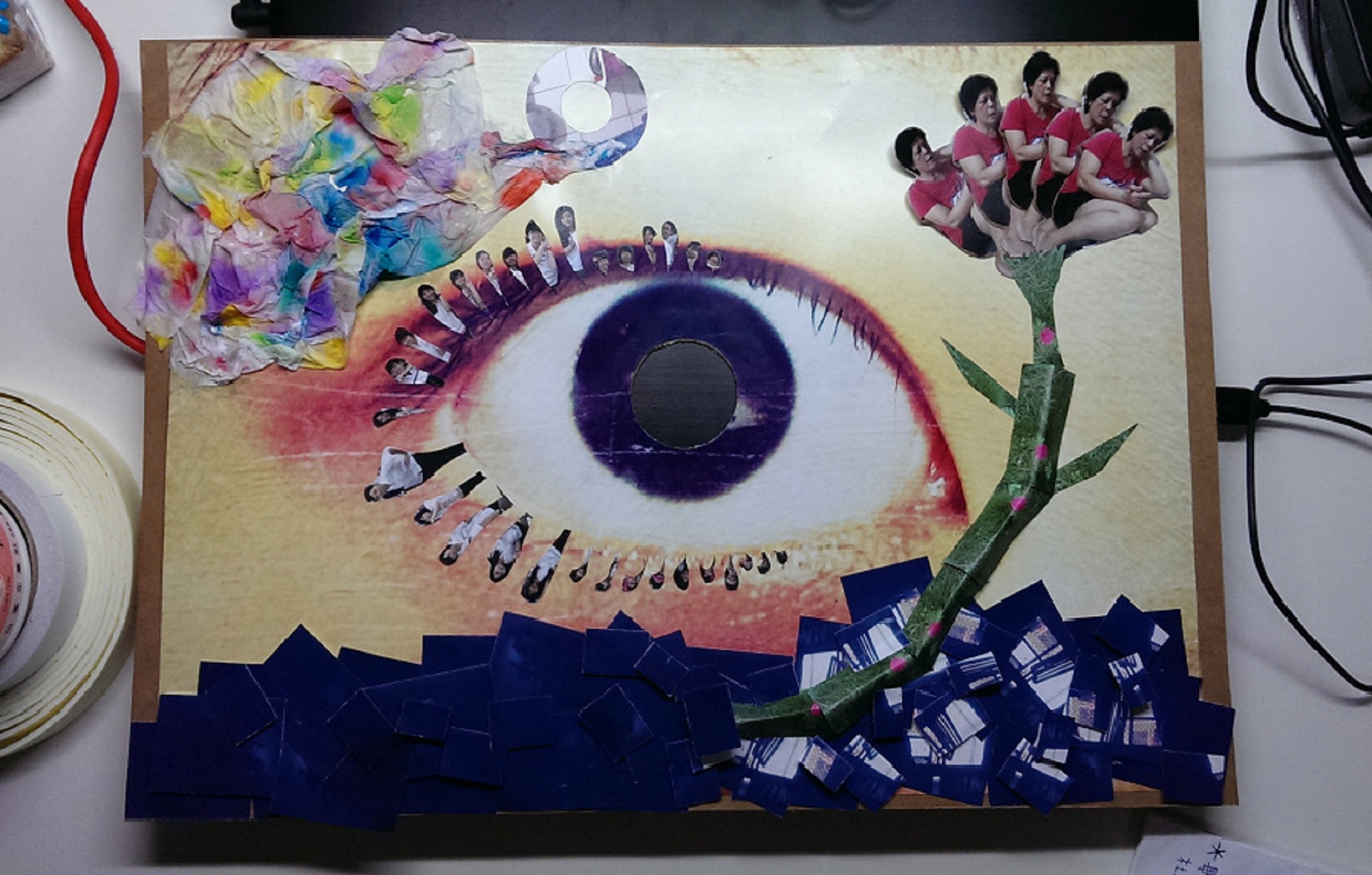 平面:以眼晴為中心,表達生長過程中我的「視界」,瞳孔挖空表達自生的成長繼續探索這個世界,左上方的雲朵代表童年記憶,下方土壤代表家鄉,是不可或缺的養分,開出的花朵為生命中影響我的重要他人,眼球周邊是高中生活縮影,代表人生轉捩點。