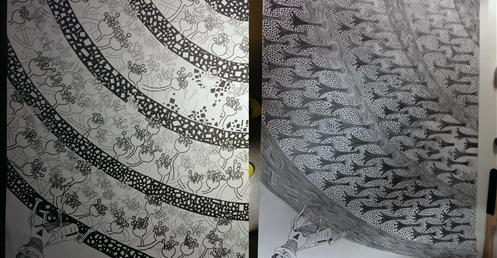 觀察對象為壁虎腳上的細毛。壁虎之所以能吸附在牆上,是因為腳掌上有分布密集的細毛所產生的分子作用力。平面想展現壁虎腳掌上毛的整齊排列,以及大小交錯產生的層次,細微的單位構成大單位的感覺。