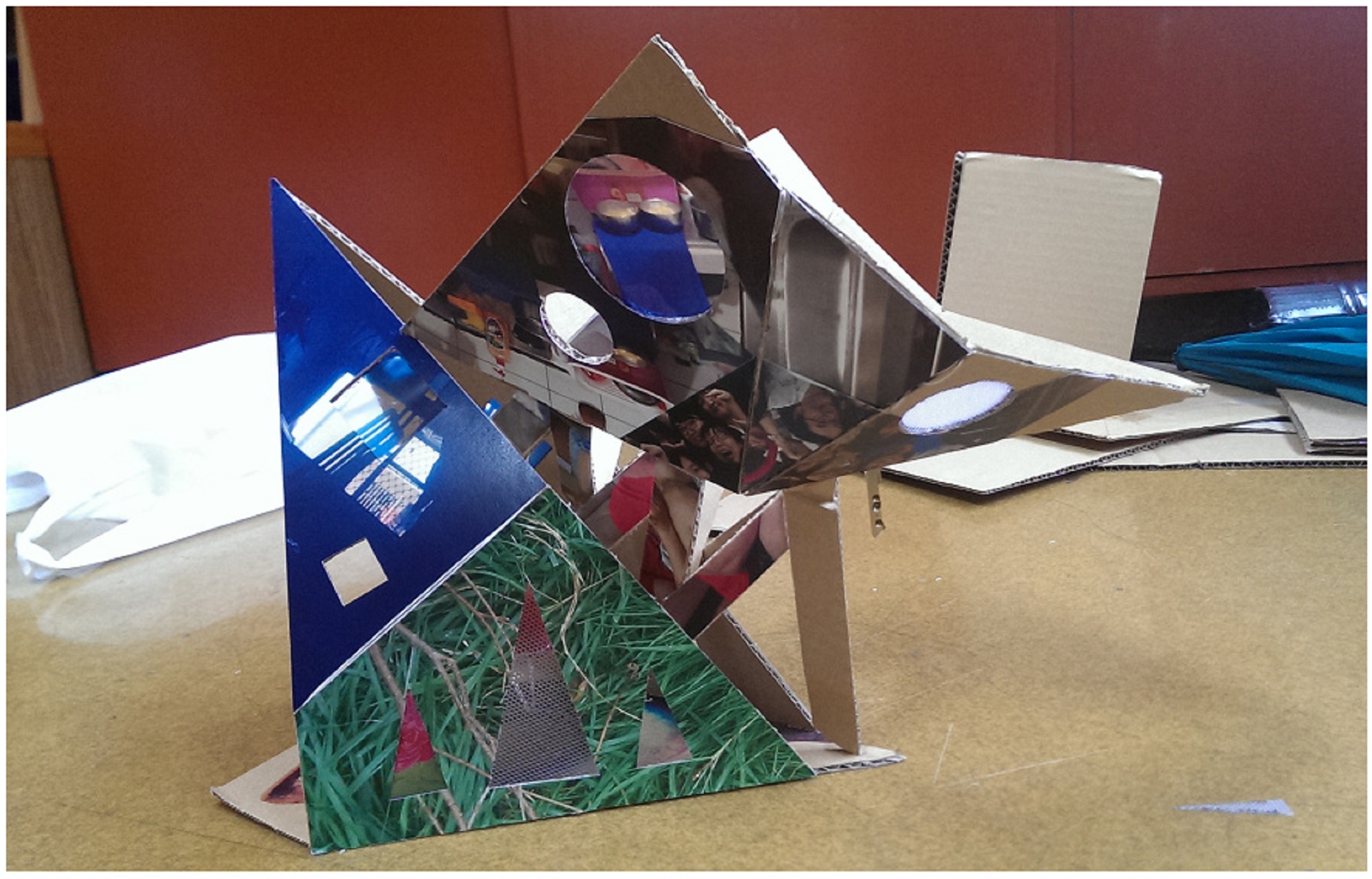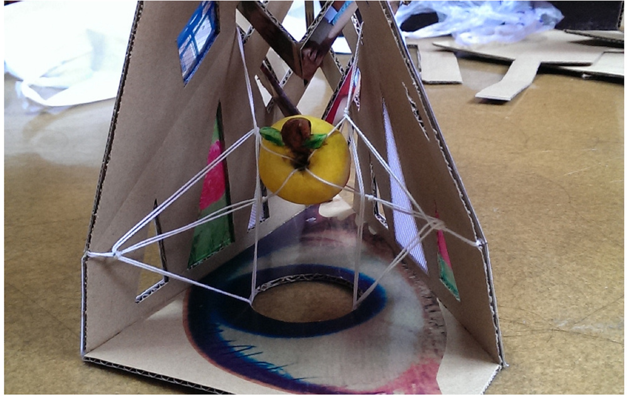立體:希望各視角皆能表達眼球的意象,懸吊的蘋果及鑰匙分別代表價值觀和責任,圖像的材質分別使用了透明片、洞洞板及實體照片,表達記憶中的模糊片段,及深刻的地方。