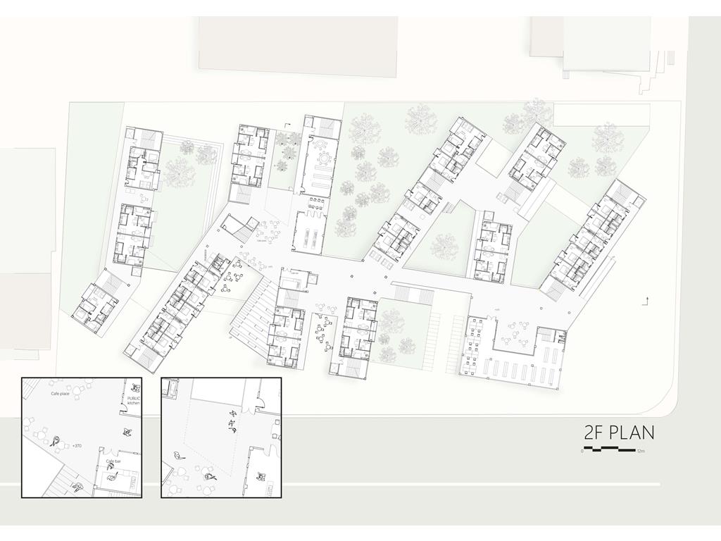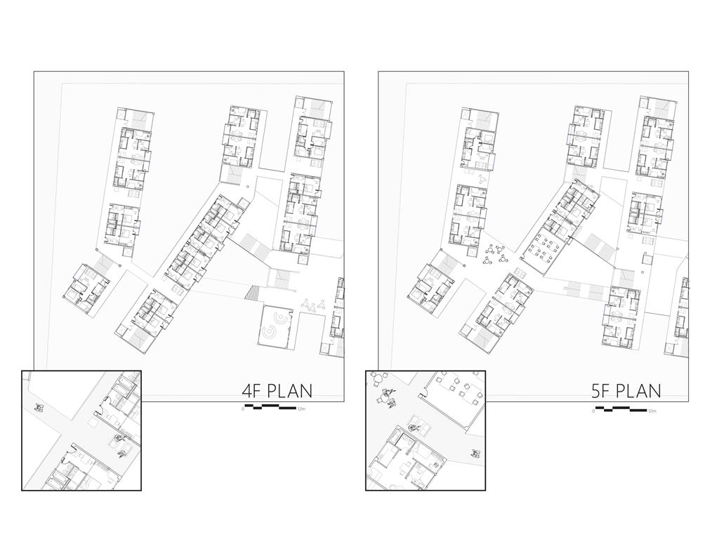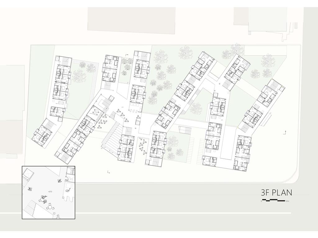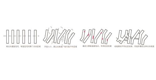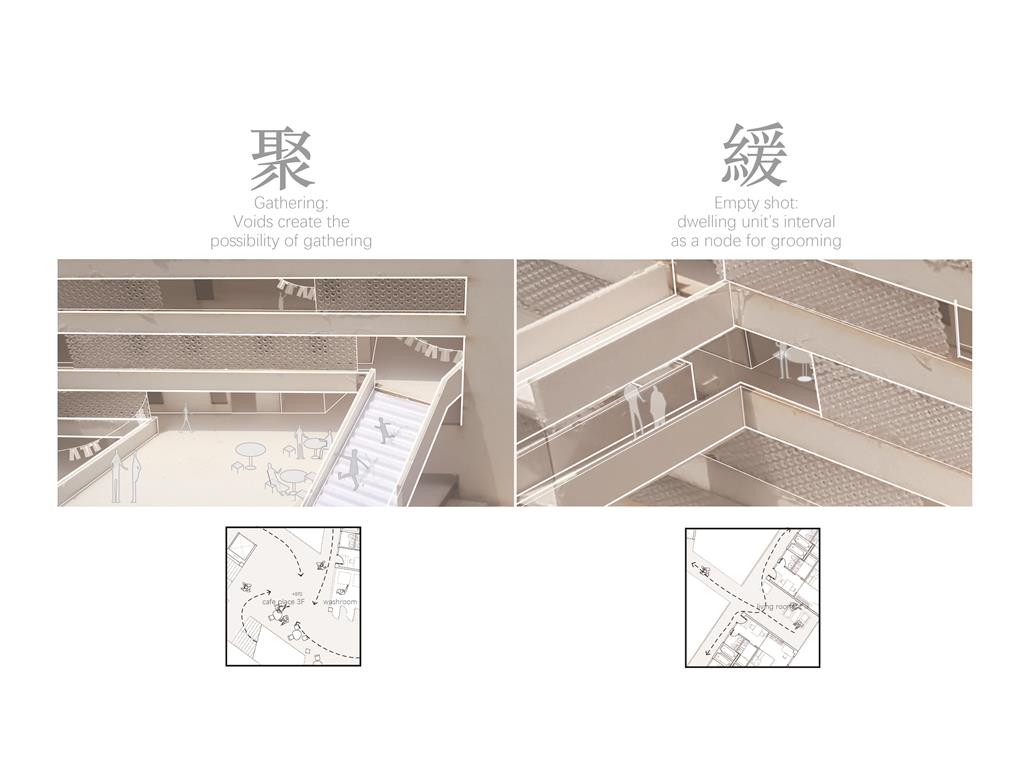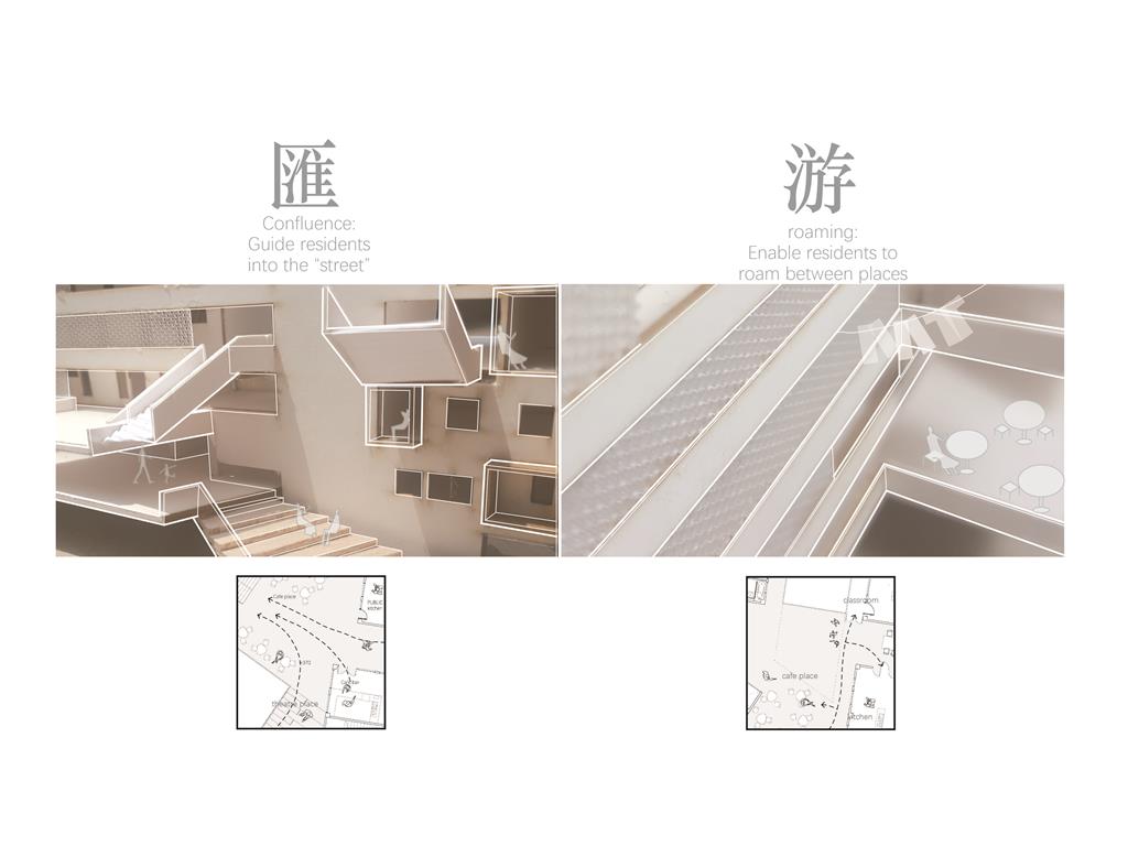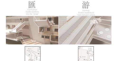 面對年輕族群上下班的日常社交需求,我以不遠處民生社區層級式的街巷組織方式為範本,通過在基地內製造街巷尺度的立體動線,使年輕人的歸家體驗得以于樓群間產生交集。