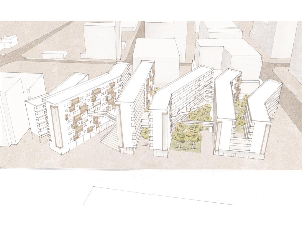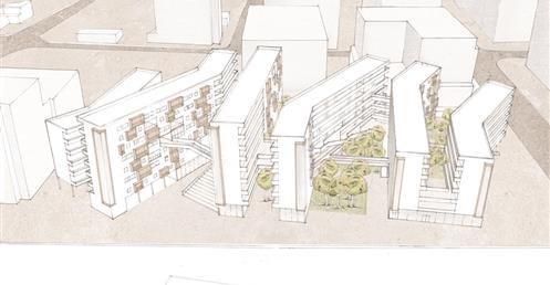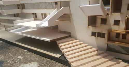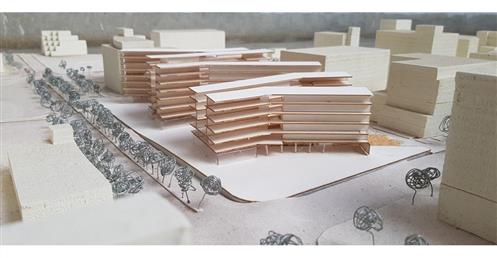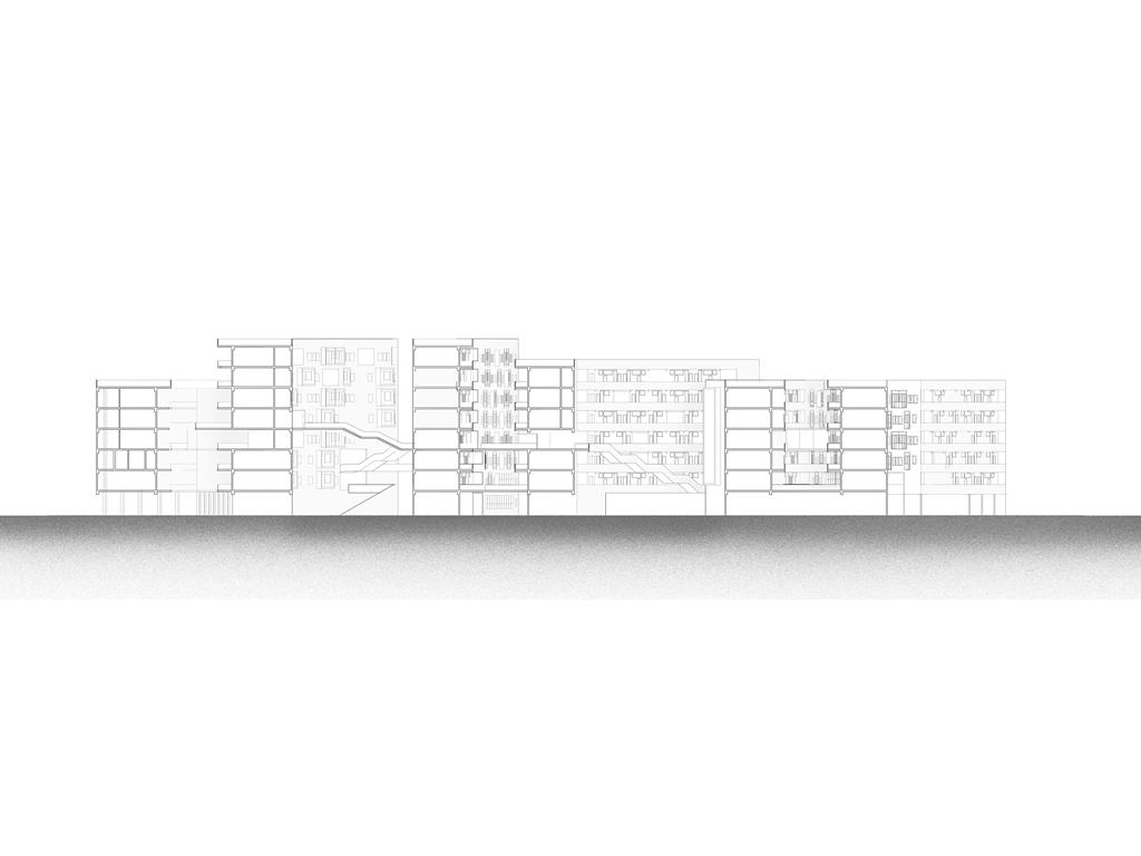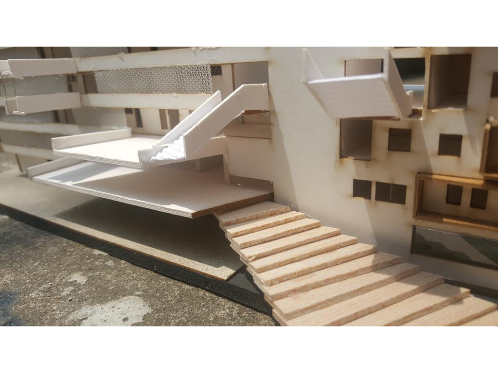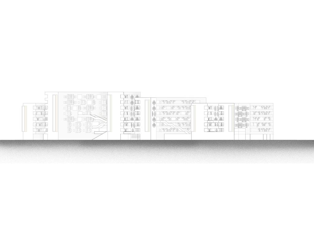 面對年輕族群上下班的日常社交需求,我以不遠處民生社區層級式的街巷組織方式為範本,通過在基地內製造街巷尺度的立體動線,使年輕人的歸家體驗得以于樓群間產生交集。