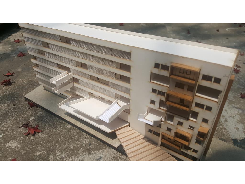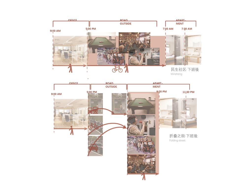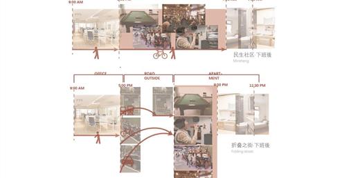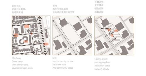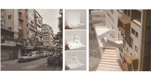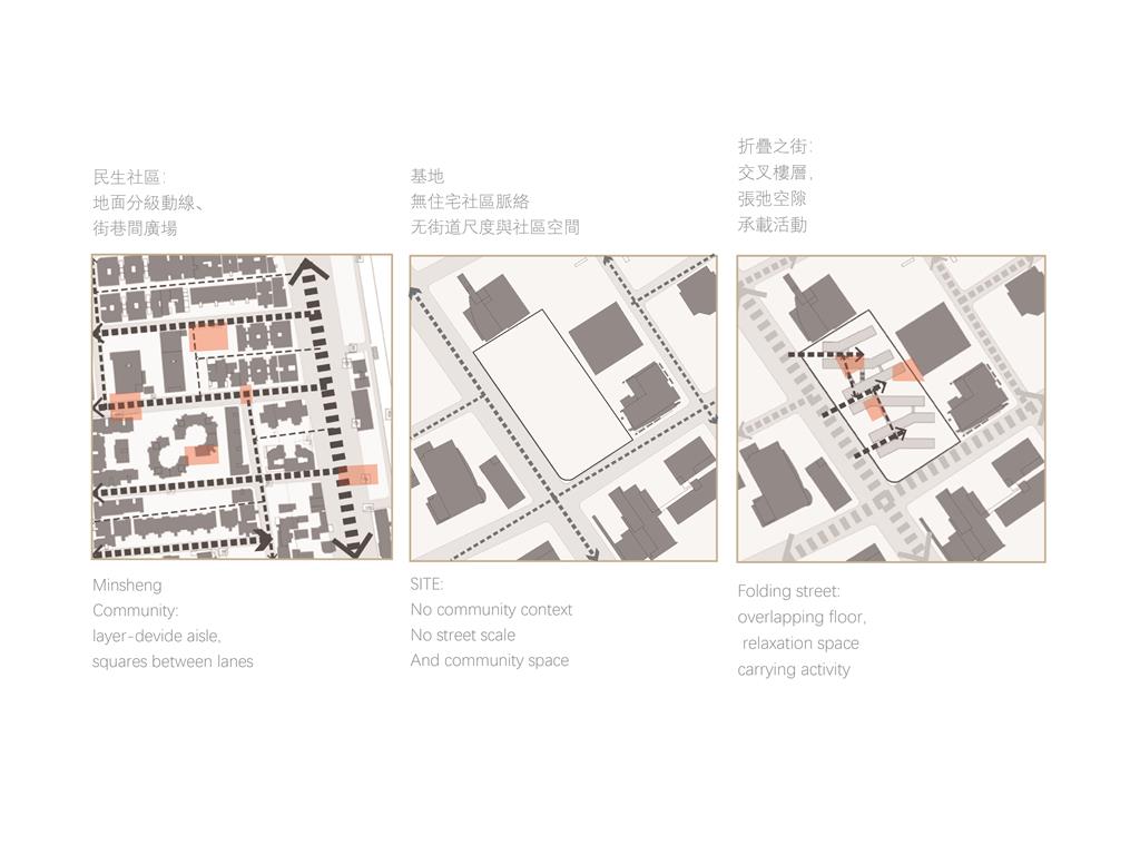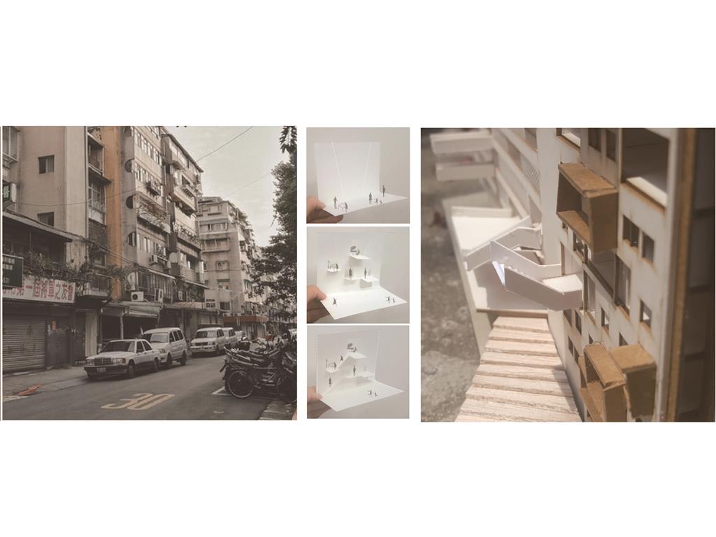 於是我選擇從使用者-上班族等族群的生活模式開始調查研究,通過對民生社區的街道生活進行類比分析,從而得到在居住脈絡薄弱的基地上產生感知的操作方法,並在最後連结台北公寓的立面语言,用量體的折角狀態完成了街道般感知經驗的構建。