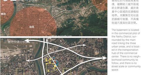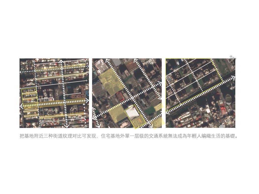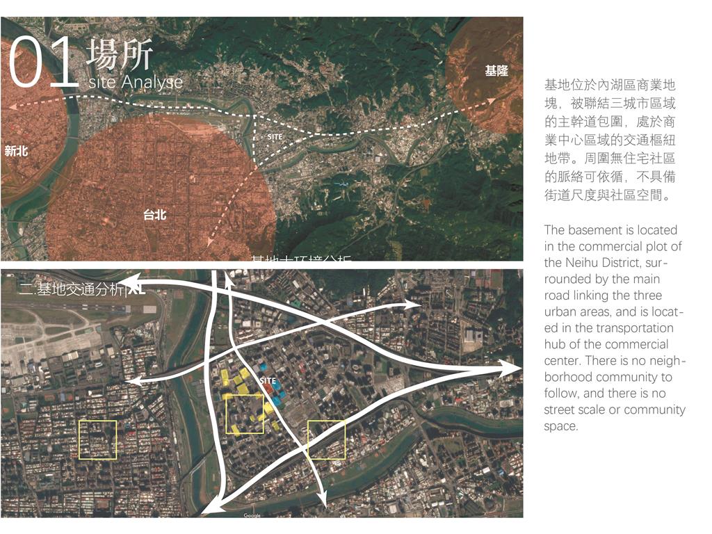 基地位於內湖區商業地塊,被聯結三城市區域的主幹道包圍,處於商業中心區域的交通樞紐地帶。周圍無住宅社區的脈絡可依循,不具備街道尺度與社區空間。住宅基地外單一功能的交通系統無法成為年輕人編織生活的基礎。