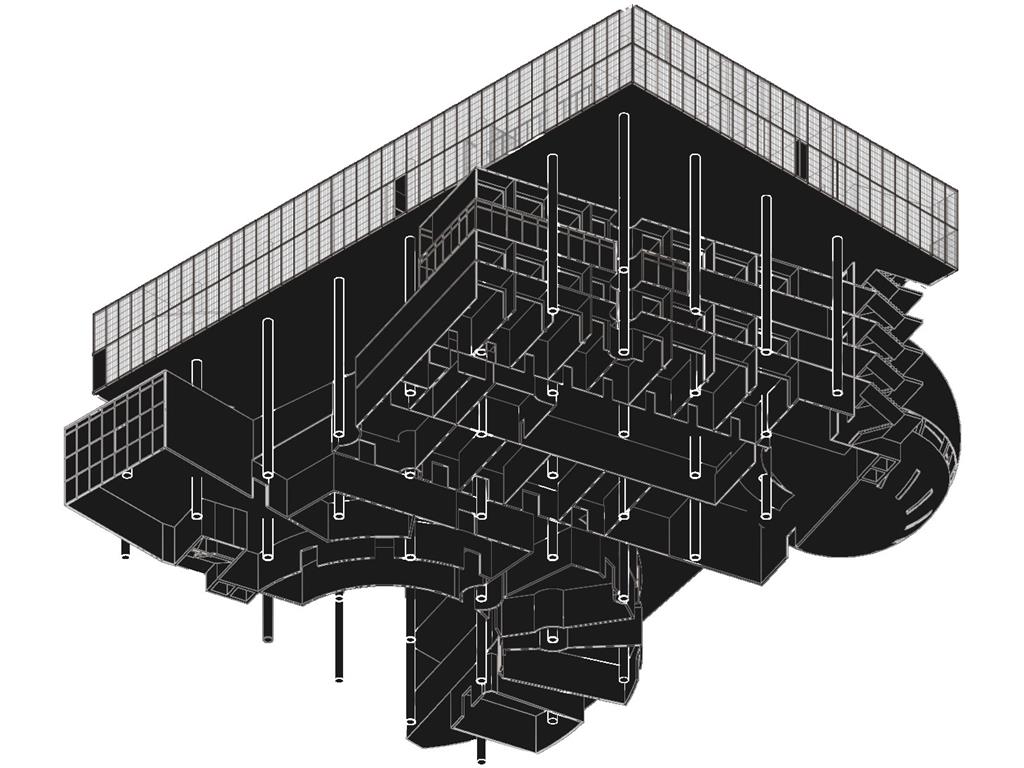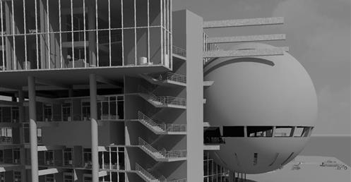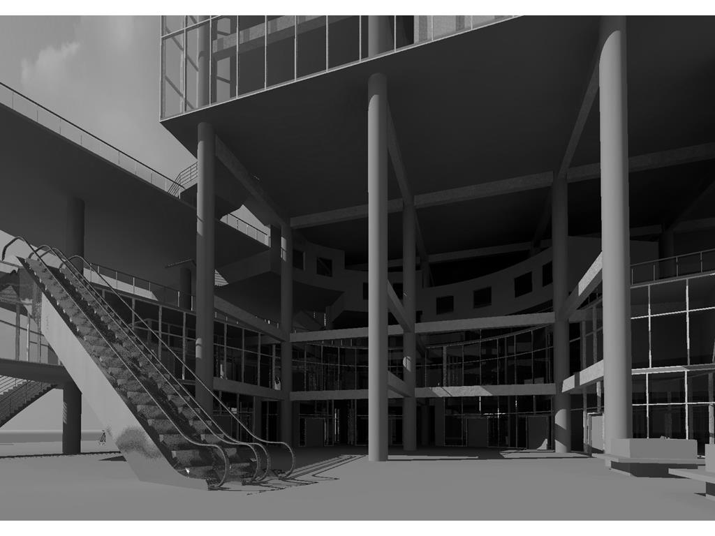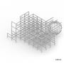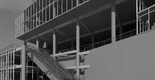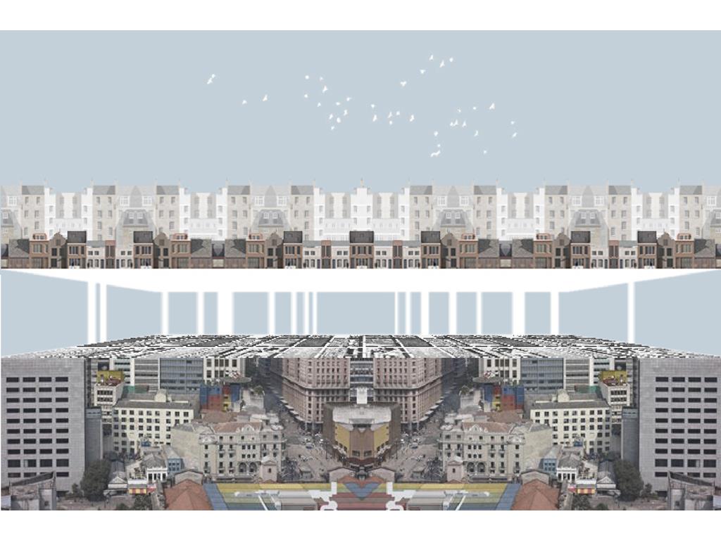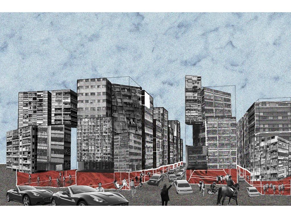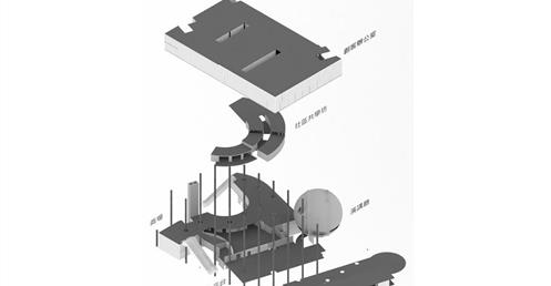 上方創客中心的公共性機能和下方商場和旅店的公共性機能都放置在中間,這個空間即為創客烏托邦面對到都市的中介空間。上下兩部分,用形體和結構系統區分開來,上方用一個純粹的量體來象征新秩序的建立;下方回應中區都市紋理,用破碎分割的量體和基地四周的街道相連,因為對於中區來說,只有在街道上日常生活才是活生生的。