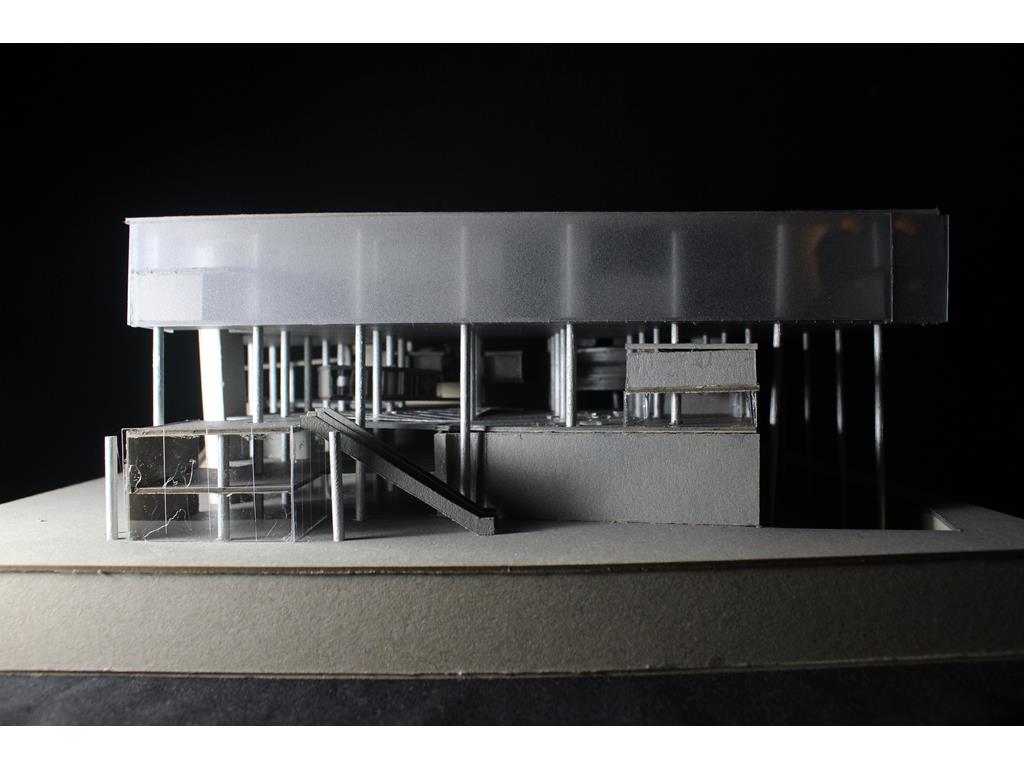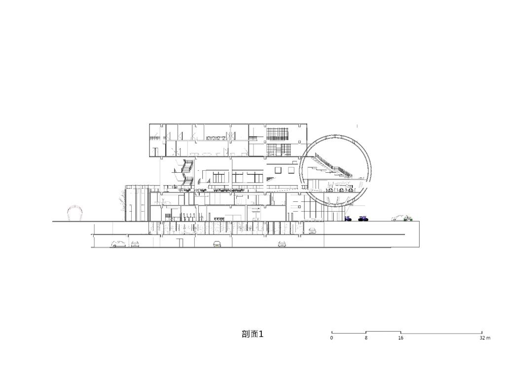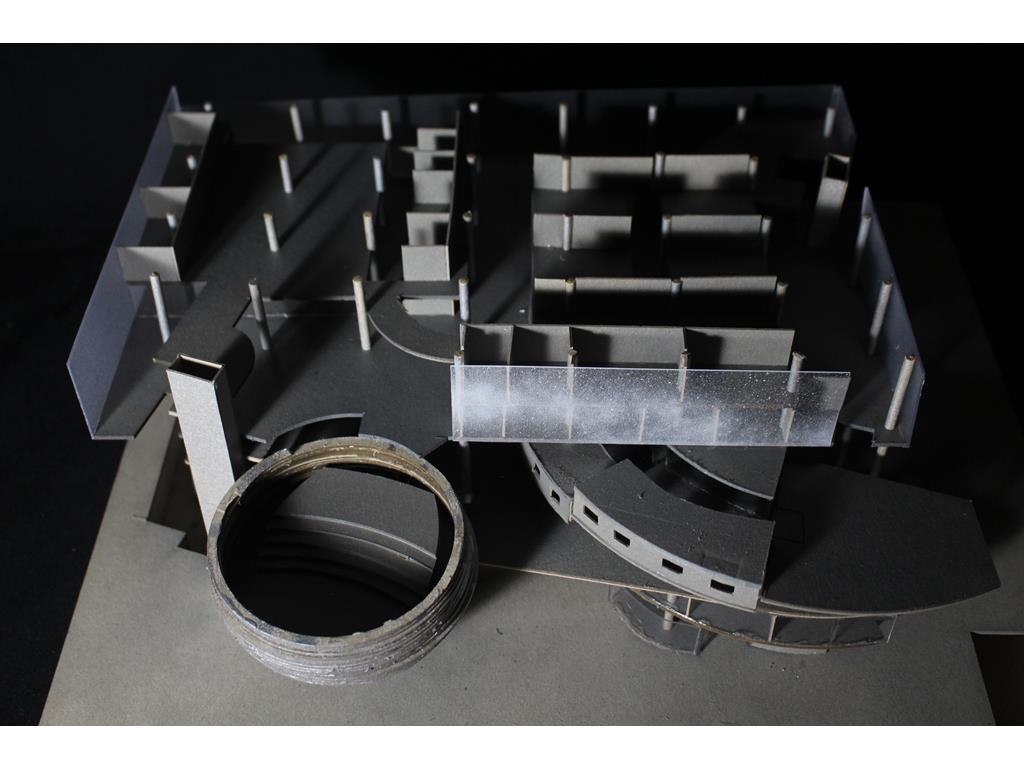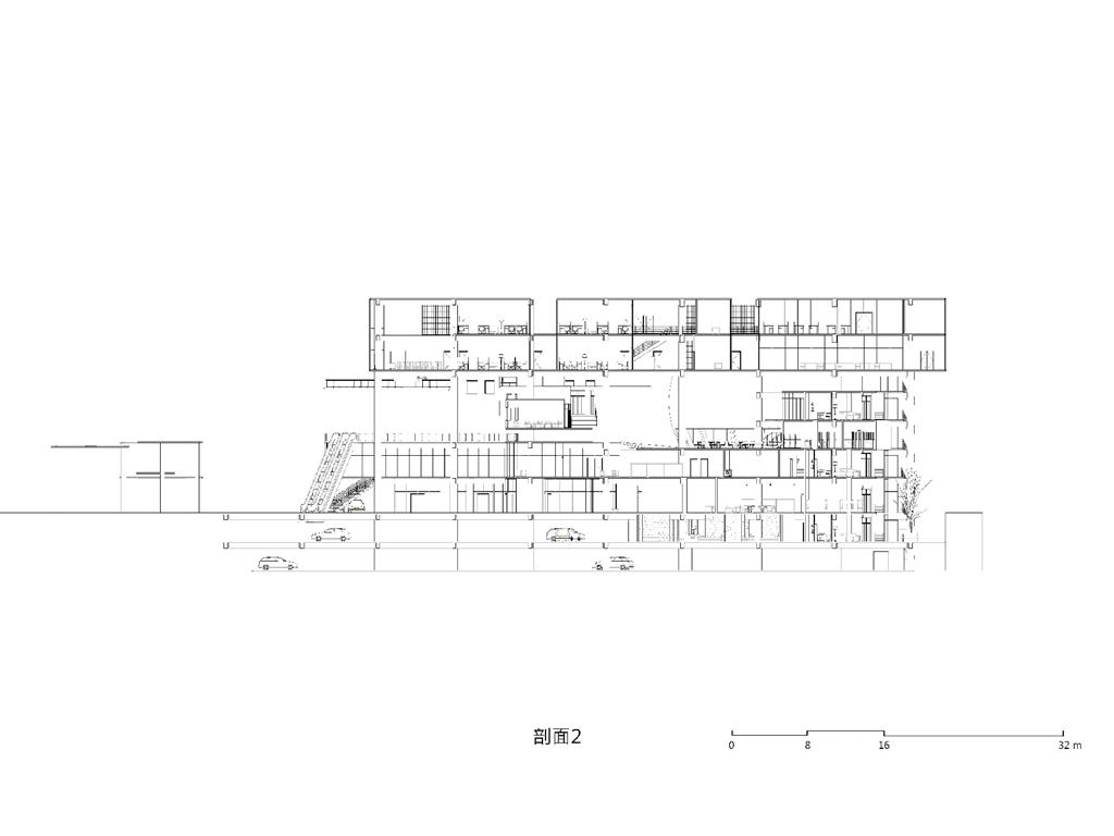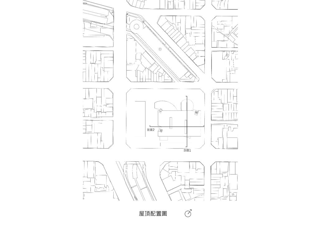 面對到這樣一個巨大的街廓,我將建築量體配置在剖面上橫向劈開,上下分別用不同造型的量體承載不同機能,中間則透過留出一個巨大的平台,為都市引入一個巨大的差異的同時,為中區帶來一個大尺度、高密度活動發生的公共空間。