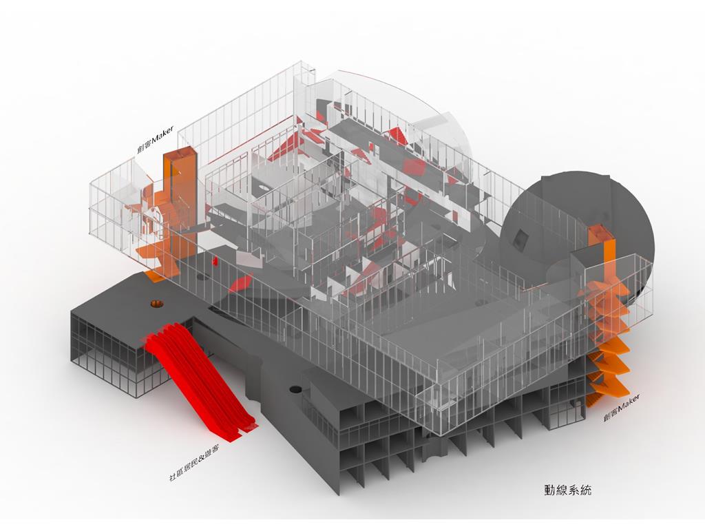 創客的烏托邦要以何種姿態出現在臺中市中區?面對中區和創客中心截然不同的空間氛圍,我認為這樣的衝突和矛盾不應該被弱化,反而是要突出這樣的矛盾,來強調一種介於兩個時代、兩種景觀和兩個觀念的差異性。突出這樣的差異並不是褒獎或貶低任何一方,只是試圖在保留各自個性的同時尋求交流的機會,去尋求一種中區再生的可能。基地預設與中興停車場,原本為柳川一湖面,后封蓋改為停車場至今。現基地南側有一BRT車站,西側有一社區活動空間正在使用,所以停車場附設的小公園市場有老人的小孩子活動。