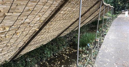 新國立競技場在設計時並未追求場館的地標性,而是儘可能降低本身存在感,引導市民重新關註明治神宮的自然空間,並在建築稠密的東京為人們留出一塊自然的休憩地。因此,場館並未採用過分華麗的外觀,而是運用樸實的結構和自然的材質來增進與訪客的親近感。場館以白、黃、綠作為主色調,並在場外種植了4.7萬株植物,作為明治神宮外苑的延續。