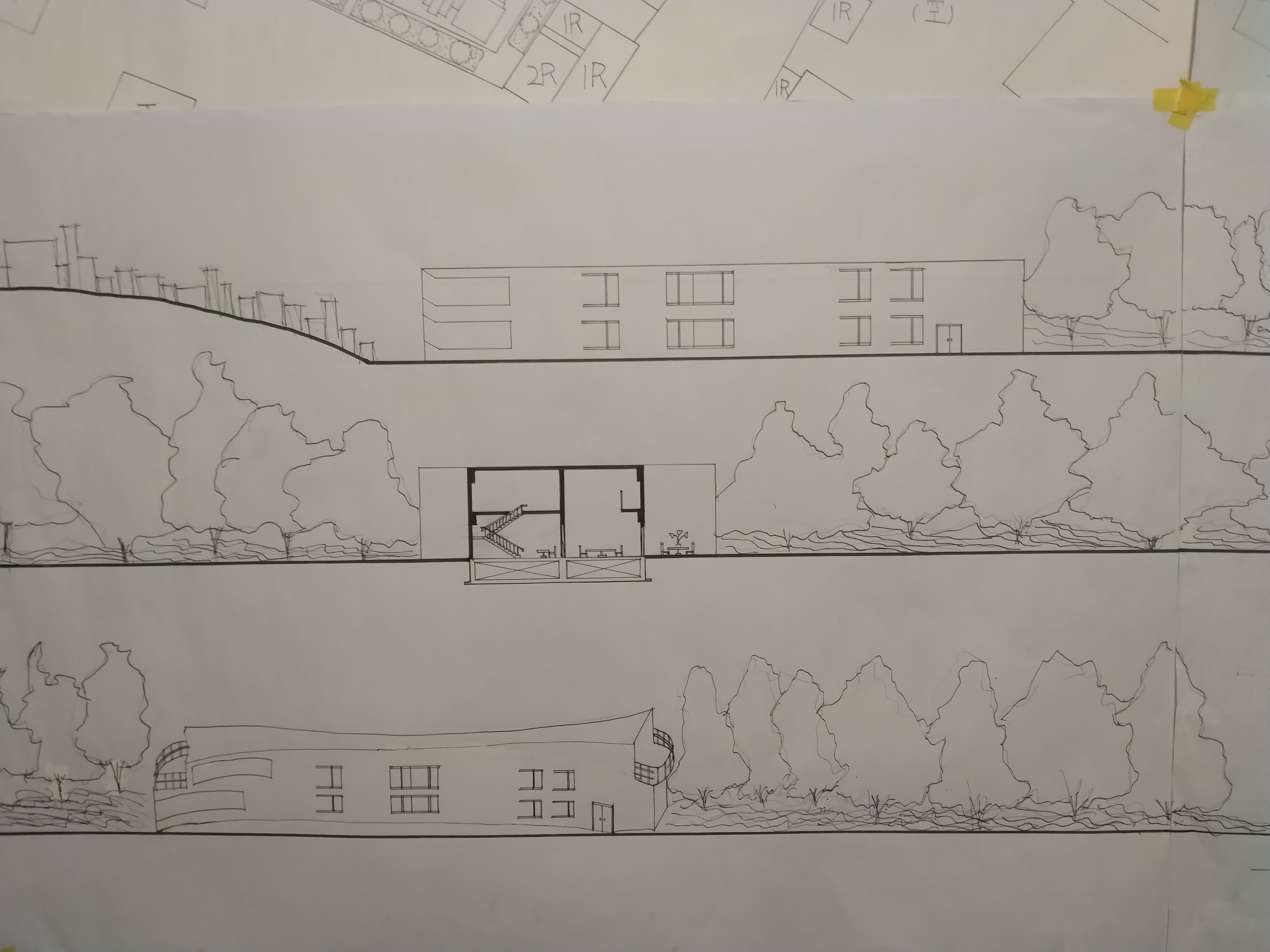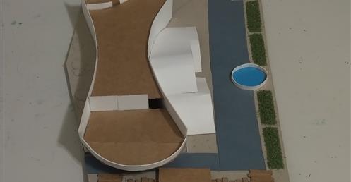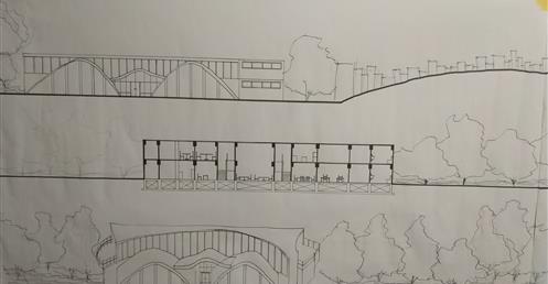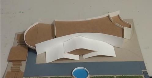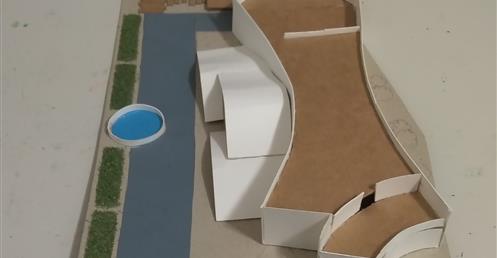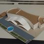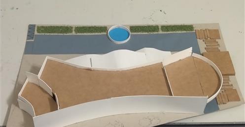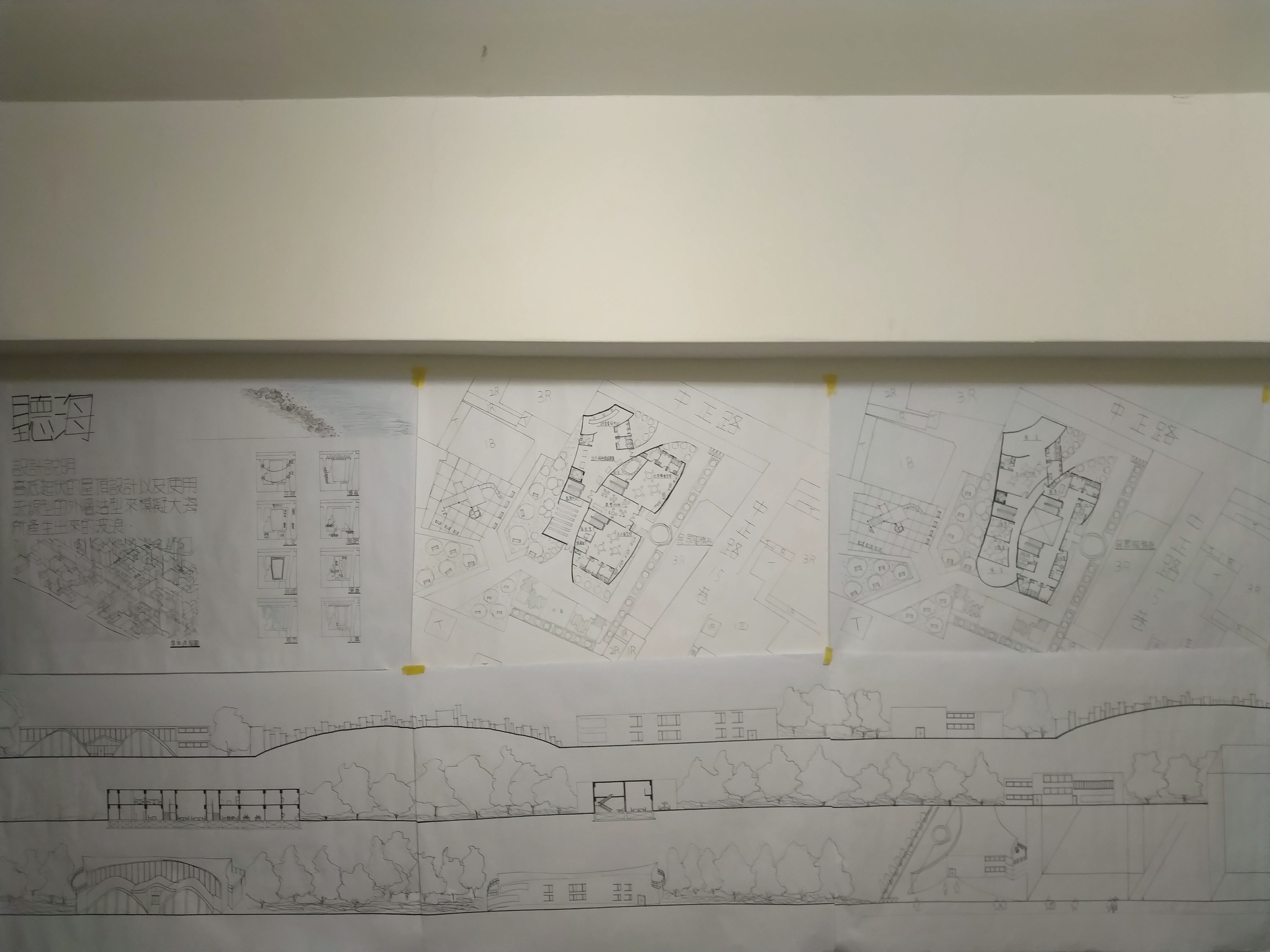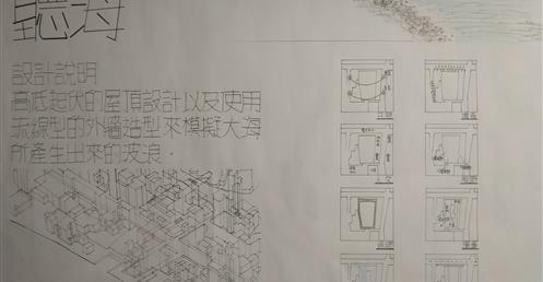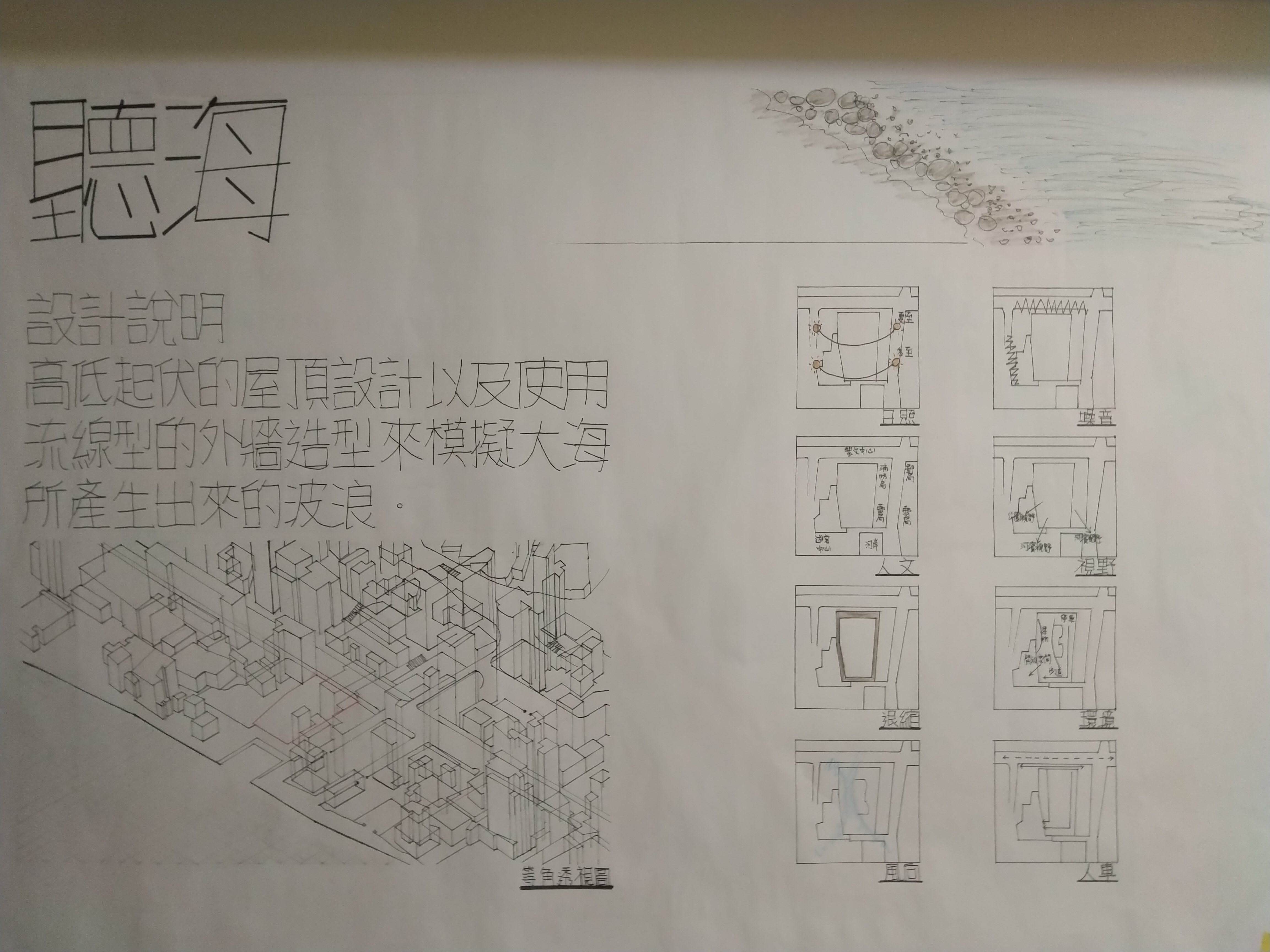 此設計作品主要形容一旅客獨自一人坐在河岸邊遠眺大海聽著浪濤聲。高低起伏的屋頂設計以及使用流線型的外牆造型來模擬大海之中所產生的波浪。