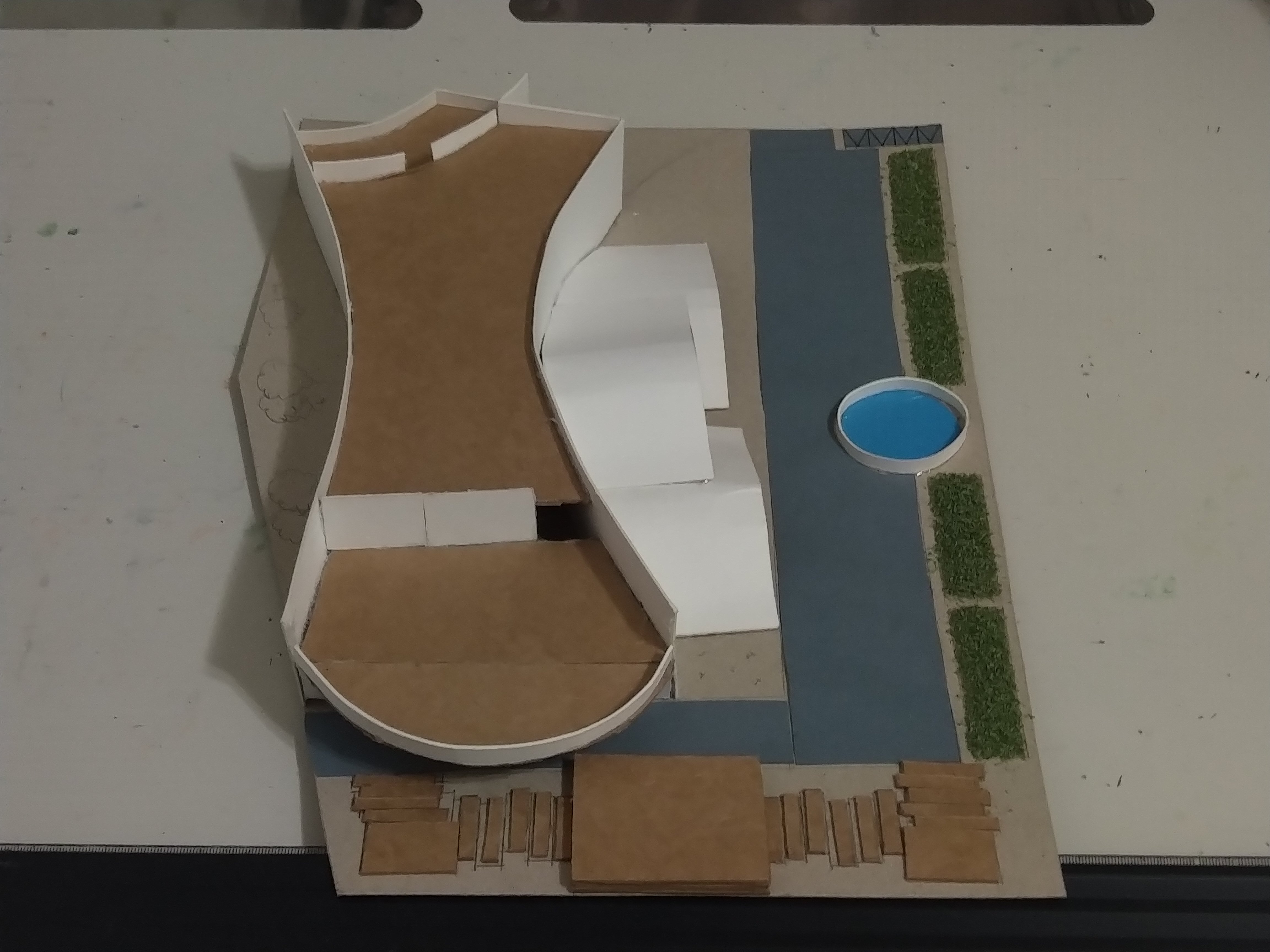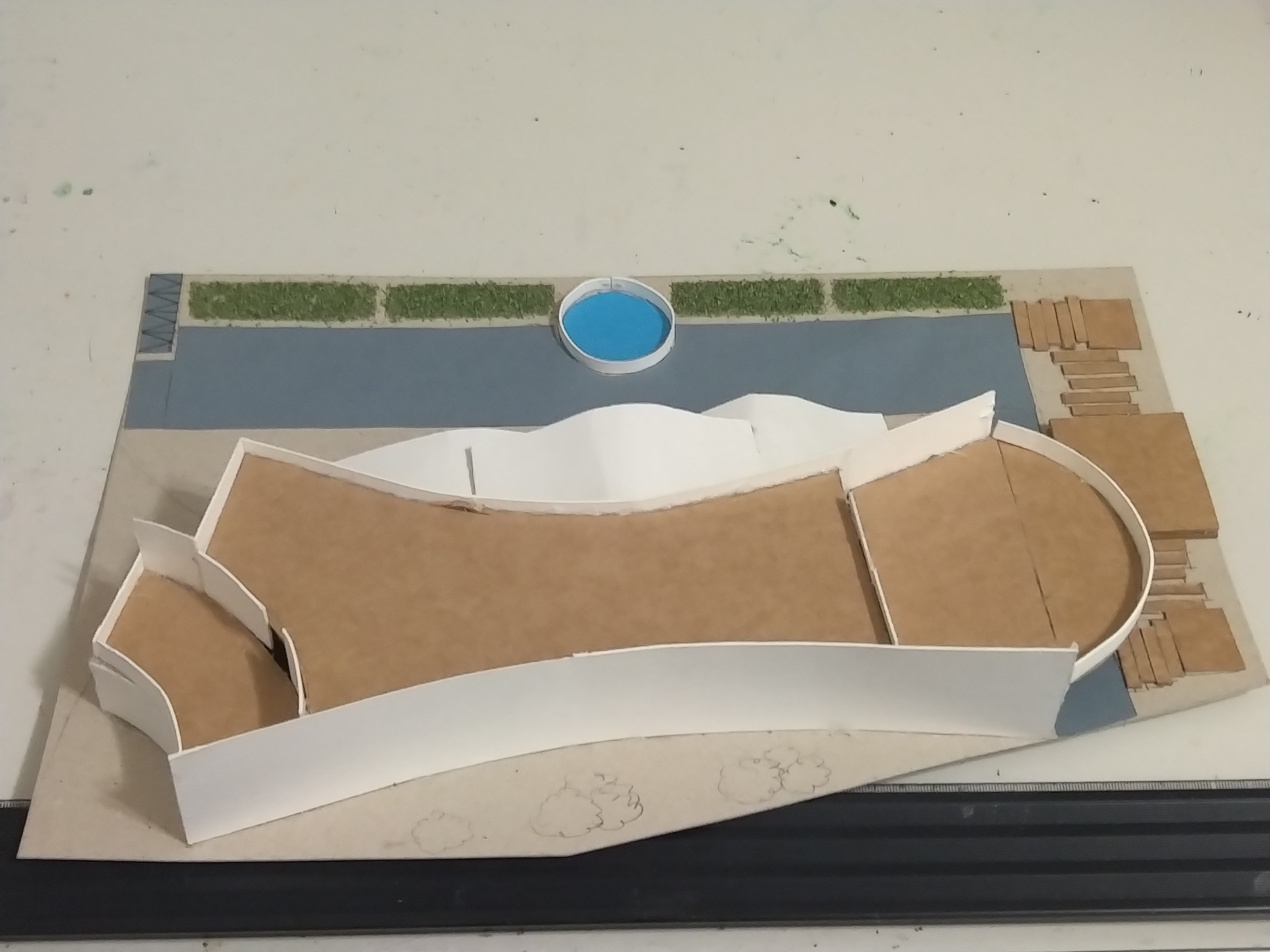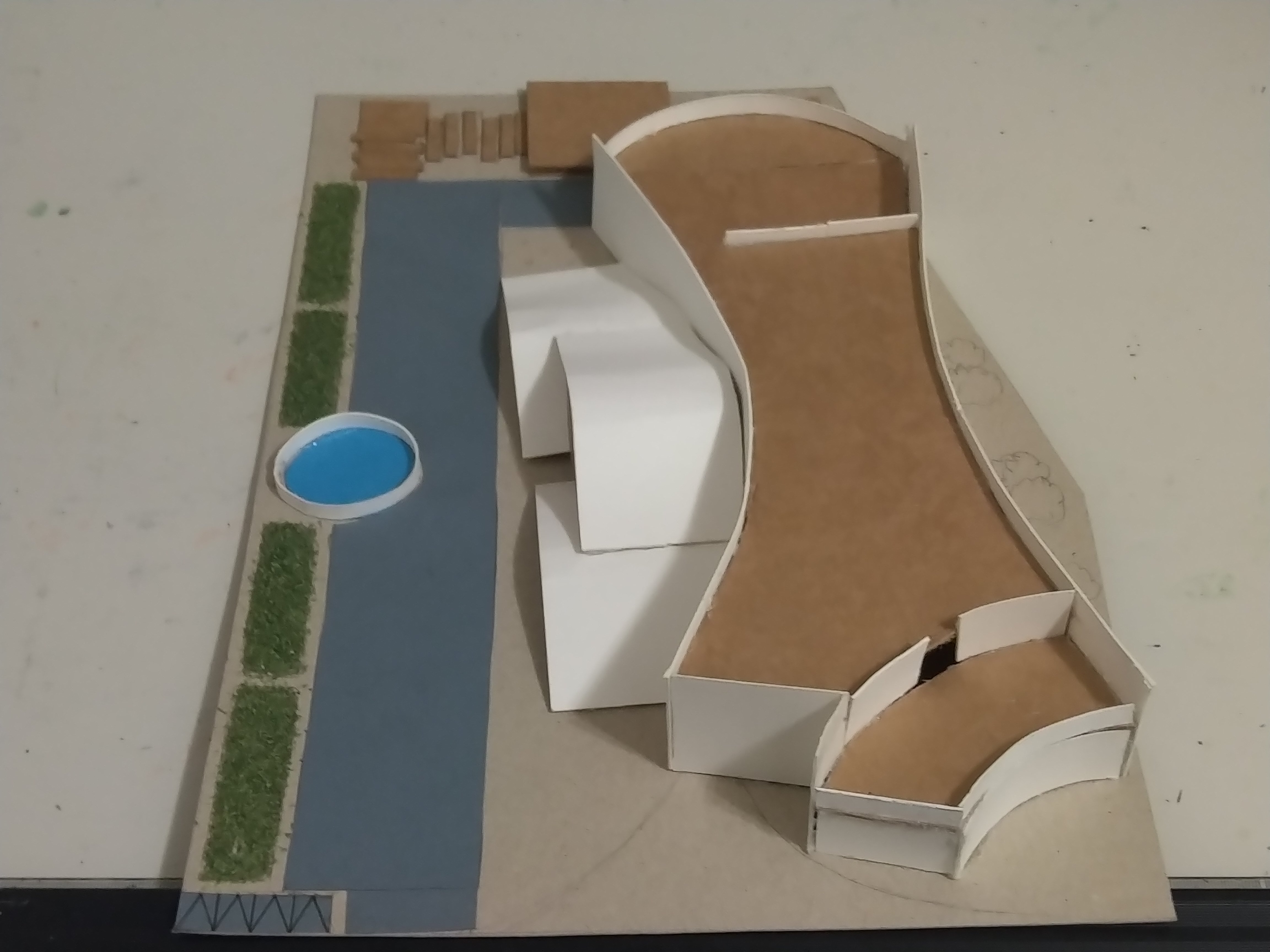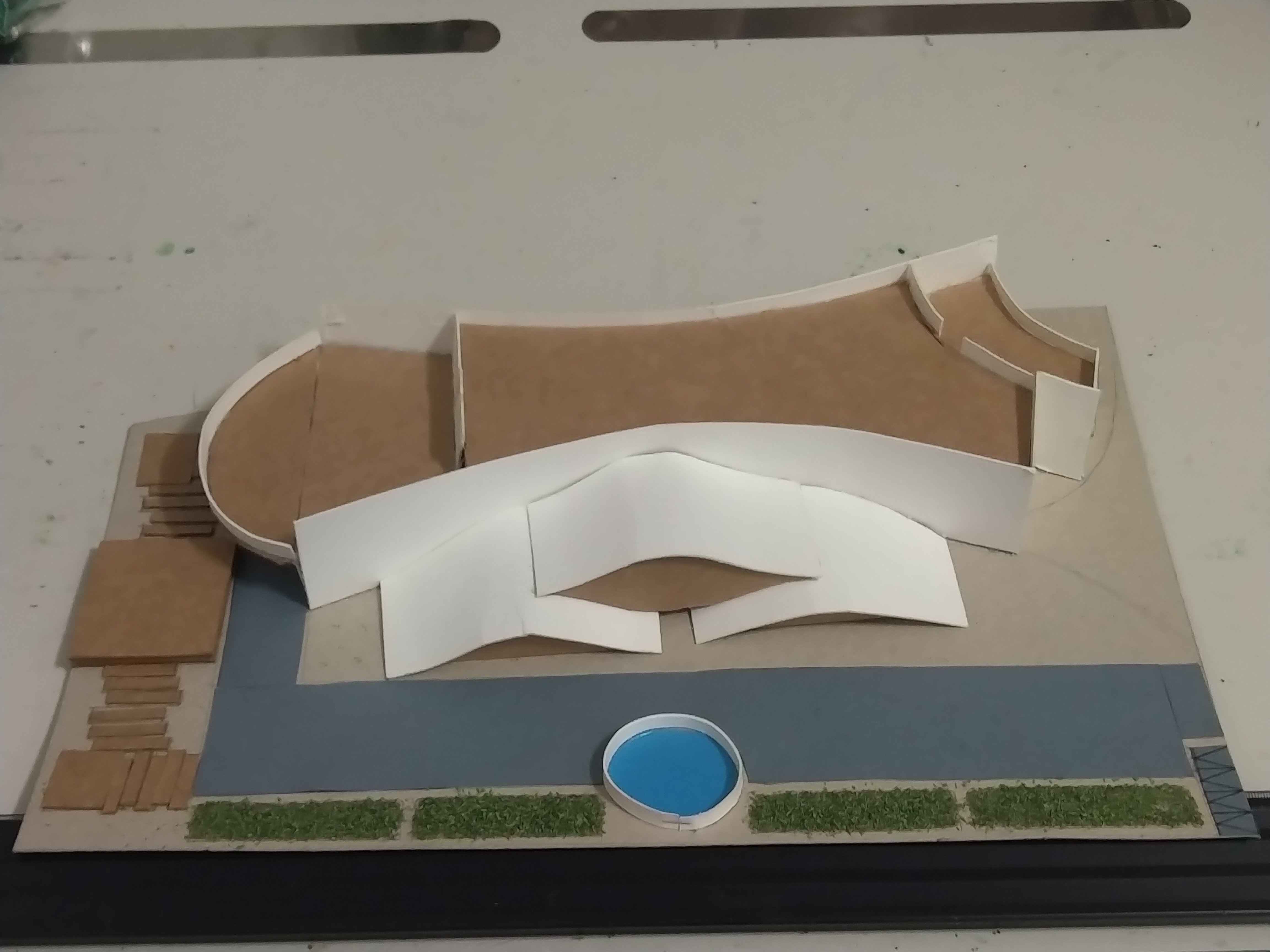 此設計作品主要形容一旅客獨自一人坐在河岸邊遠眺大海聽著浪濤聲。高低起伏的屋頂設計以及使用流線型的外牆造型來模擬大海之中所產生的波浪。