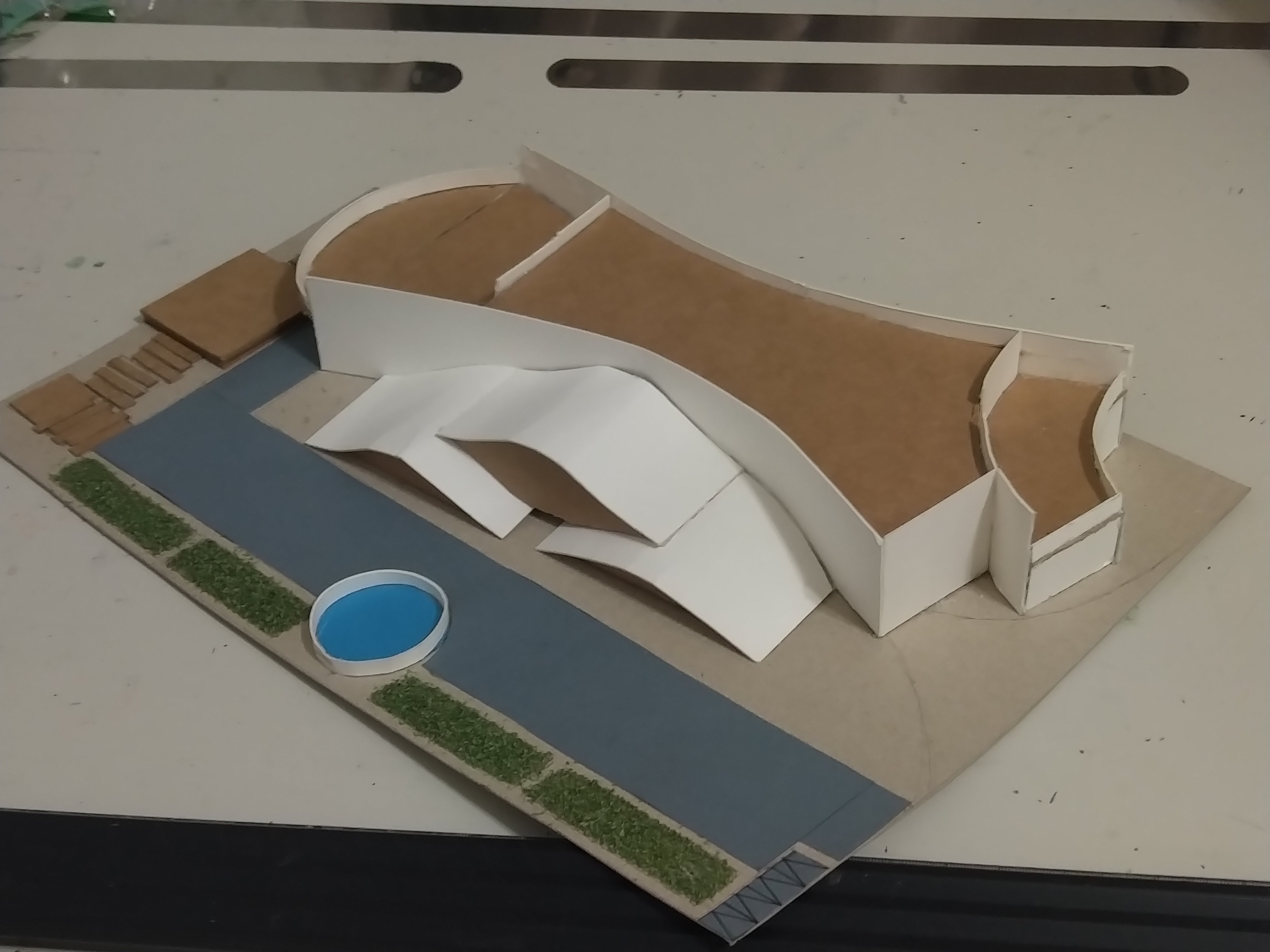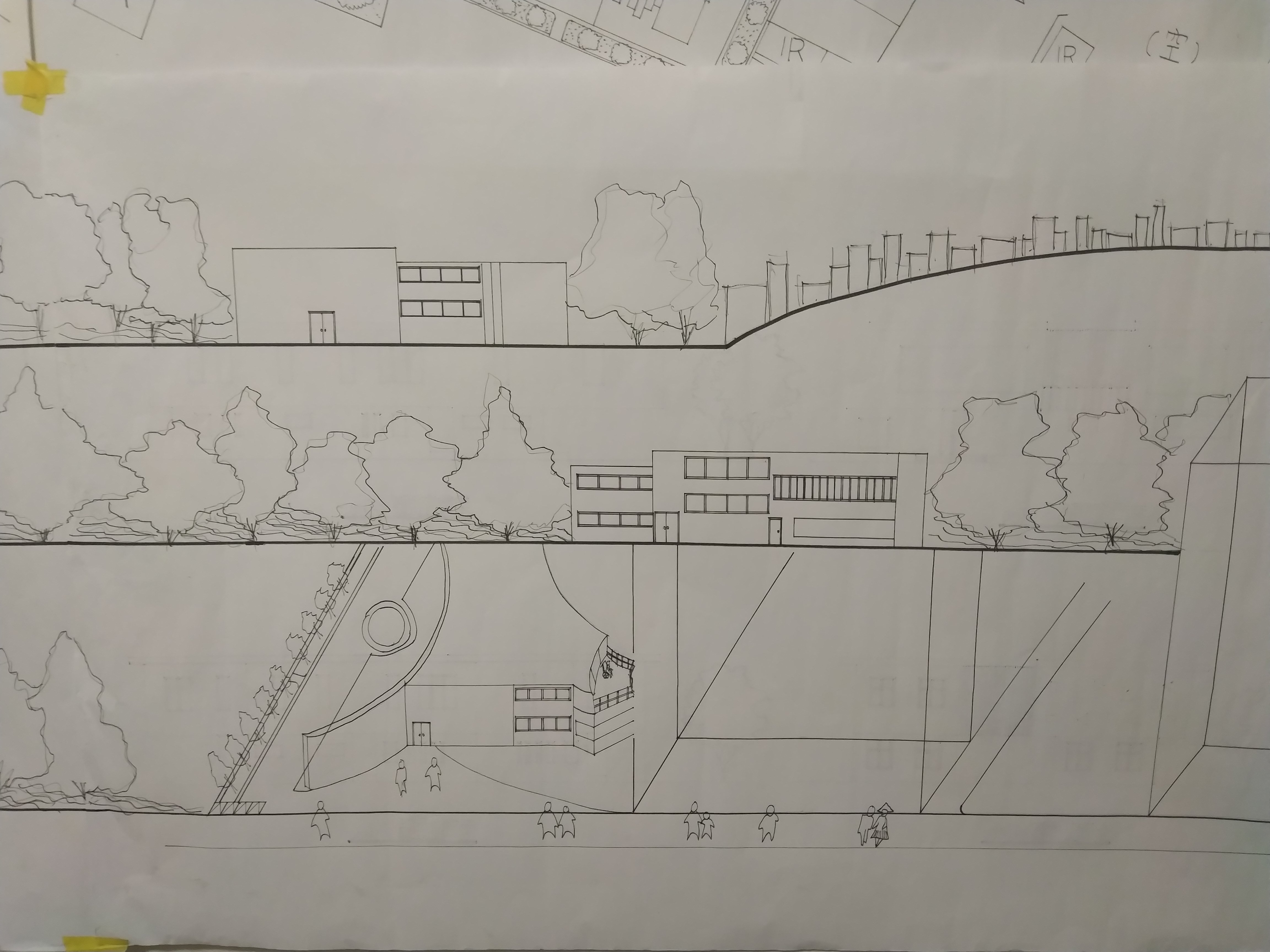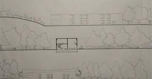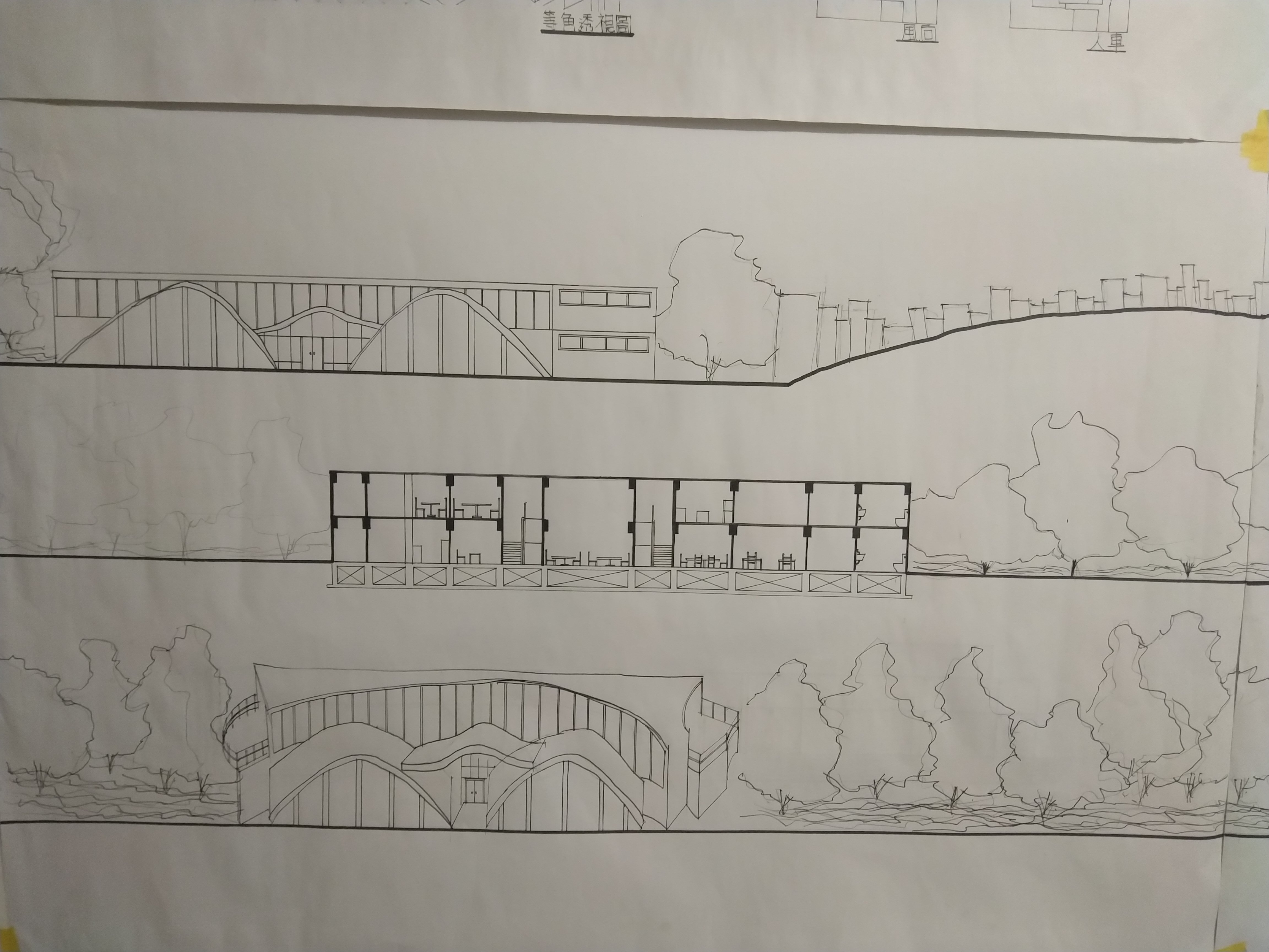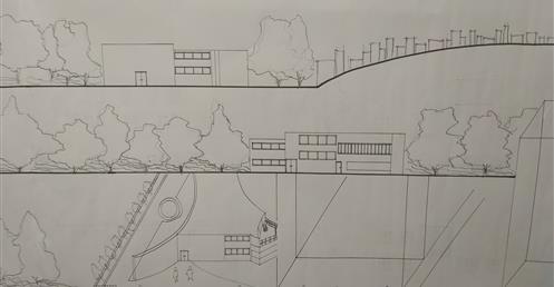 此設計作品主要形容一旅客獨自一人坐在河岸邊遠眺大海聽著浪濤聲。高低起伏的屋頂設計以及使用流線型的外牆造型來模擬大海之中所產生的波浪。