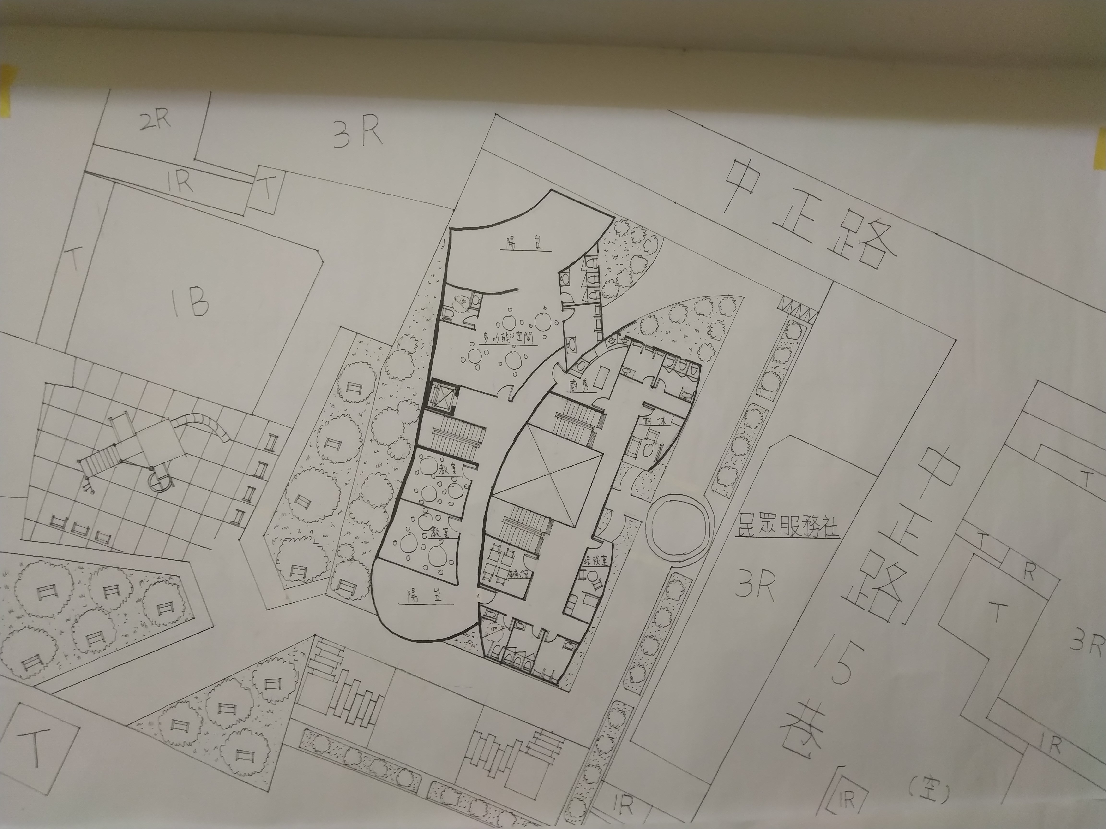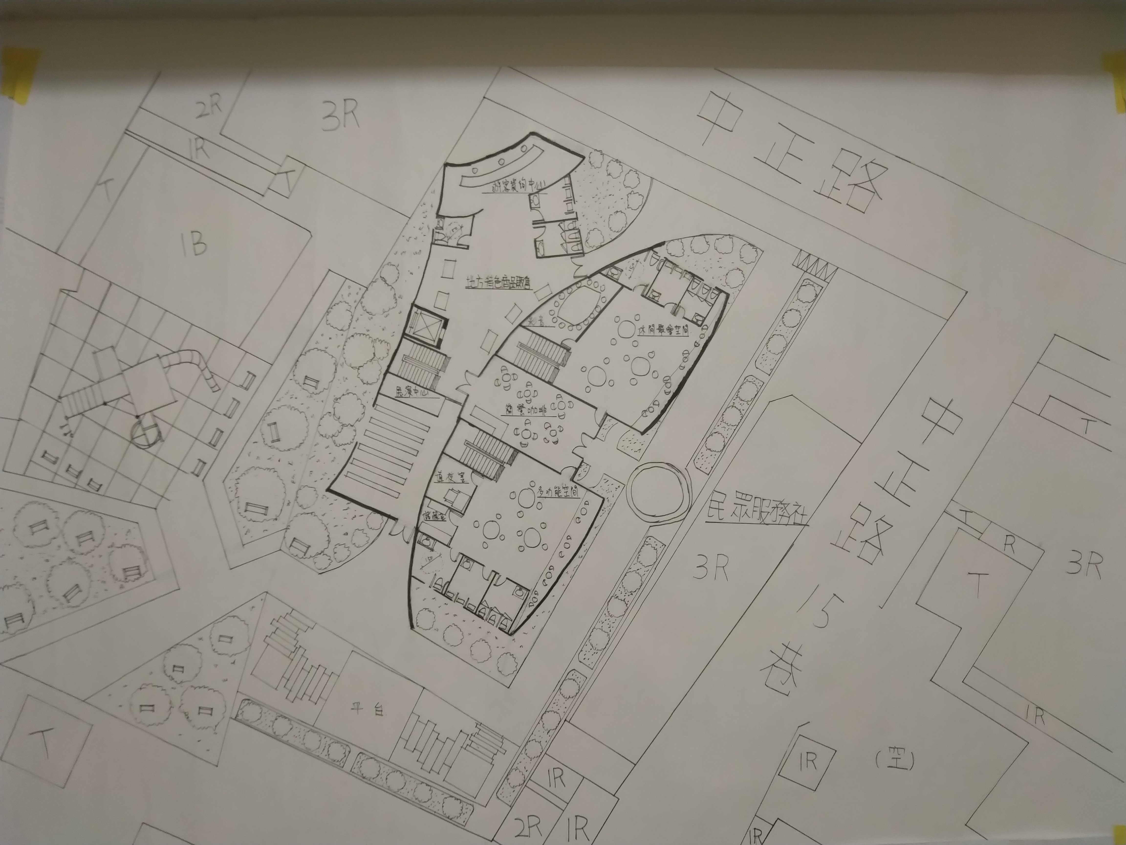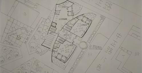 此建築分為兩部分的主體,流線型外牆主要屬於主題空間,有高低波浪起伏的屋頂造型主要為行政空間與咖啡廳做一個融合,使經過此社區風貌館的遊客的目光會被吸引到此中心,在咖啡廳外圍有設有一個戶外的廣場與長條的廊道,旁邊種有一整排的樹,可以阻隔噪音亦可增加美觀的效果,和一個圓形水池作為中心點的美觀設施,在行走於廊道的期間也可以看到本館高低起伏的波浪造型設計,觀看建築的美妙之處,就像魚一樣自由自在地穿梭於海洋之中。