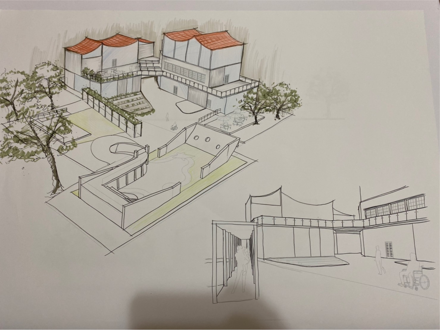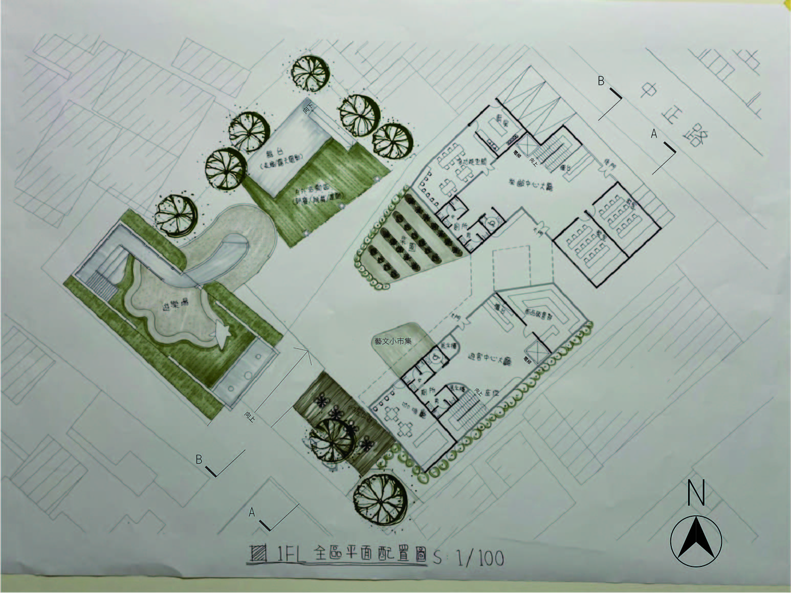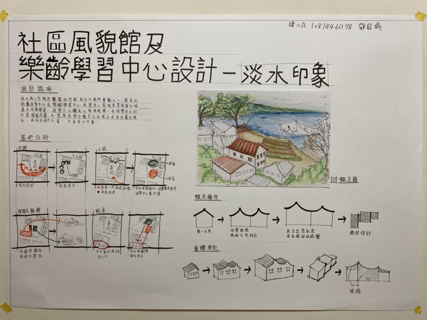 本次設計由我到淡水及基地印象的感受,設計的社區風貌館及樂齡學習中心。將對淡水的印象繪製成一張概念圖,有我到淡水沿著河畔走到基地看到釣魚的漁夫,及走入基地第一眼看到船造型的遊樂場,還有走出基地沿著中正路走向老街途中,看到畫家繪出以前淡水的風貌,有高高低低白牆瓦片的房子及農田。用以上元素結合較現代玻璃元素做結合設計,想帶給老人們及遊客淡水特殊的風情。
