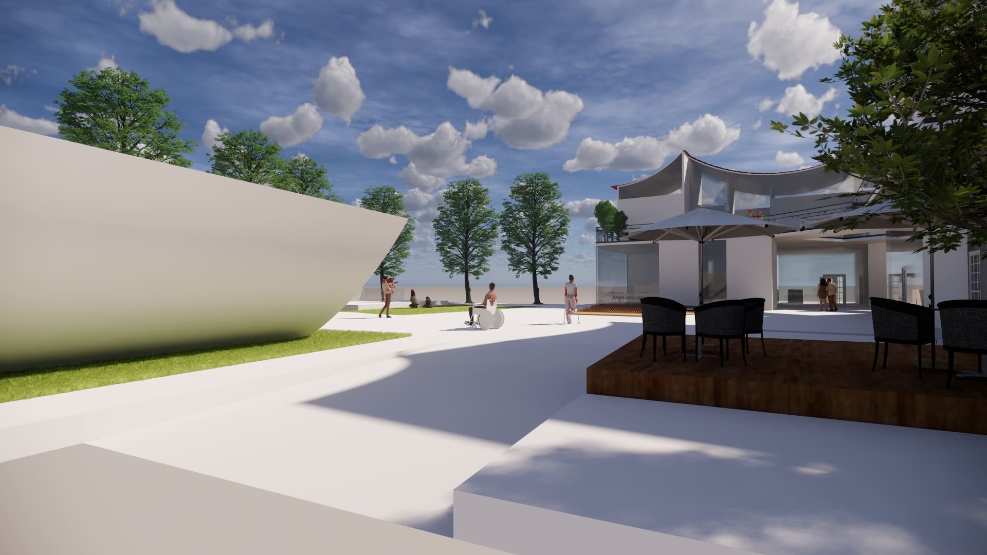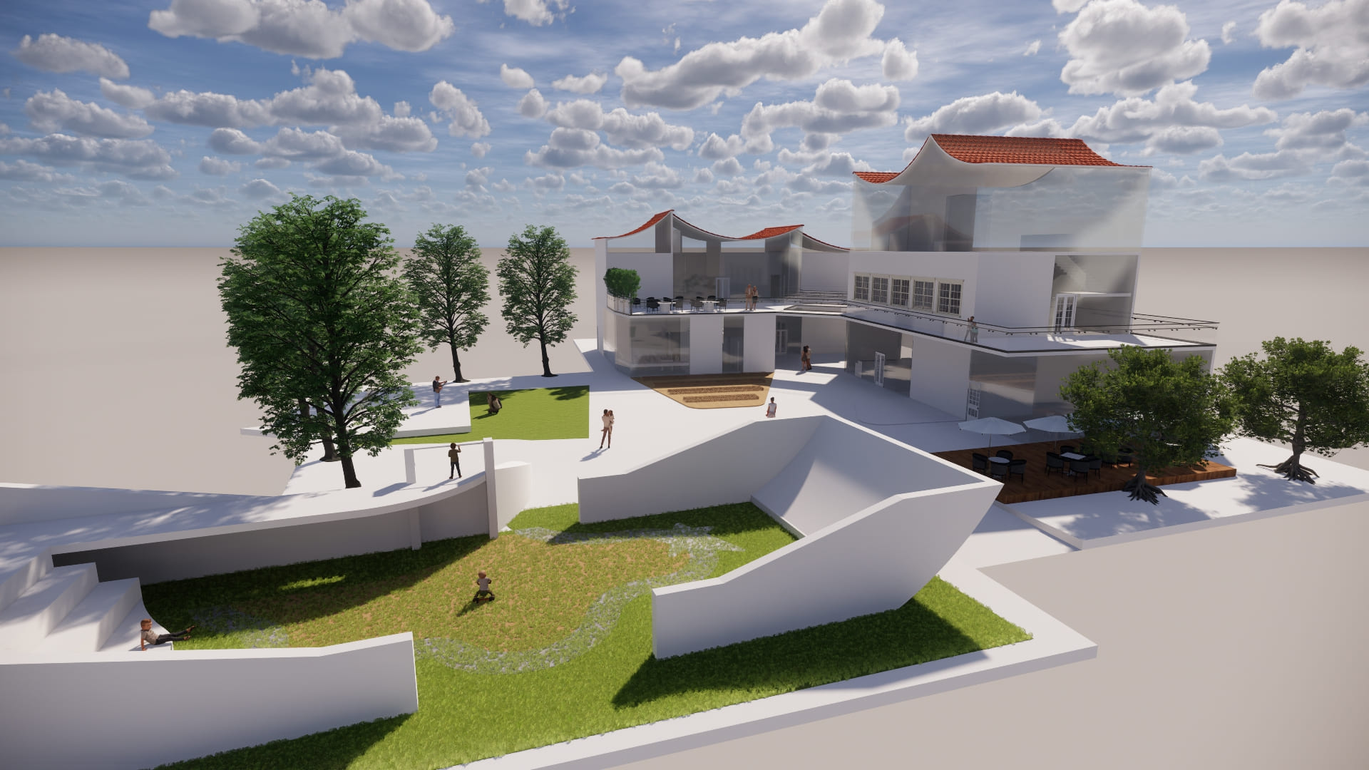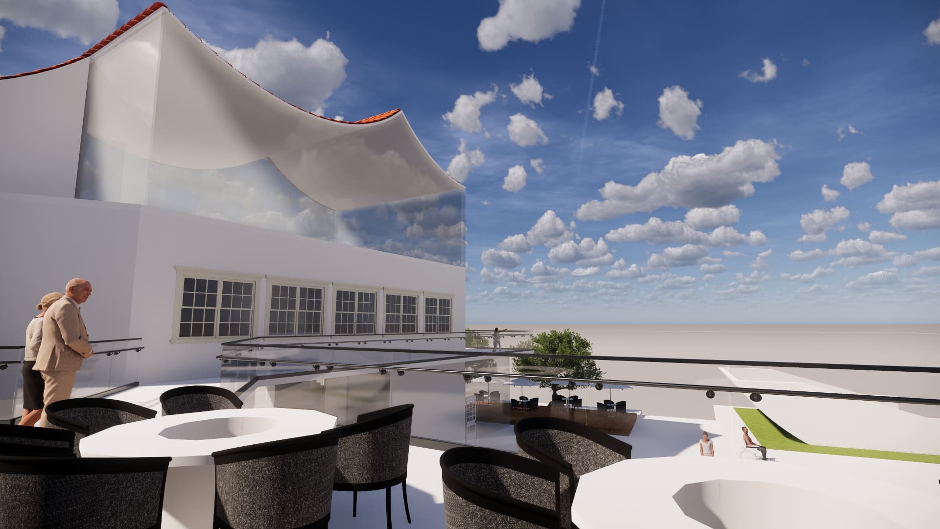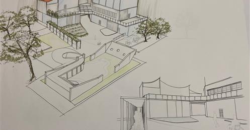 本次設計由我到淡水及基地印象的感受,設計的社區風貌館及樂齡學習中心。將對淡水的印象繪製成一張概念圖,有我到淡水沿著河畔走到基地看到釣魚的漁夫,及走入基地第一眼看到船造型的遊樂場,還有走出基地沿著中正路走向老街途中,看到畫家繪出以前淡水的風貌,有高高低低白牆瓦片的房子及農田。用以上元素結合較現代玻璃元素做結合設計,想帶給老人們及遊客淡水特殊的風情。