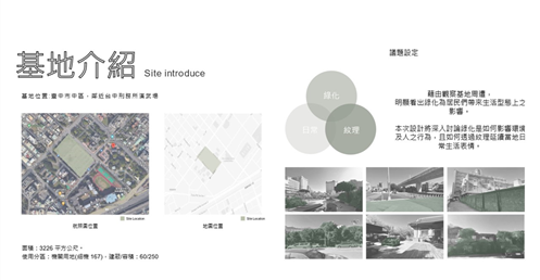 建築基地位於台中市郊,柳川附近,鄰旁多自然美景,擁有豐富的植被和柳川水道。目標是在此建立一個以大自然為基礎的綠植體驗中心,並藉此提醒人們:我們與環境生態的密切聯繫。