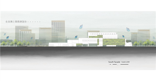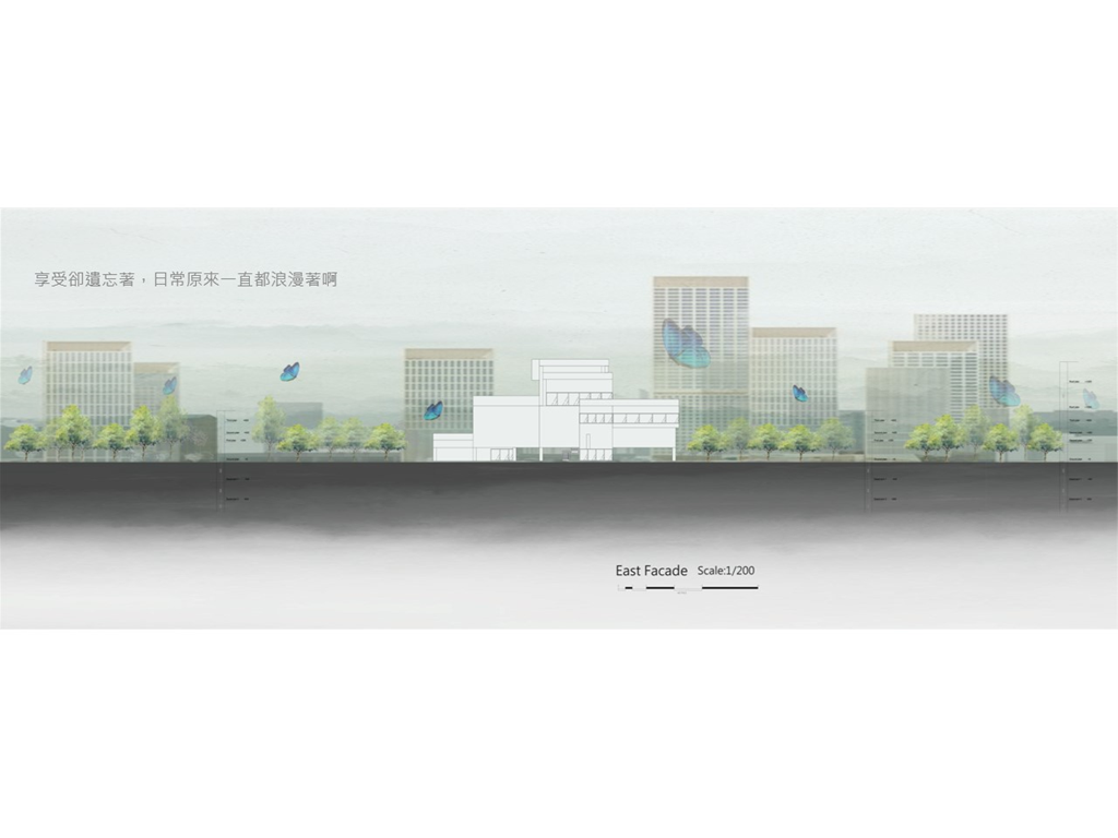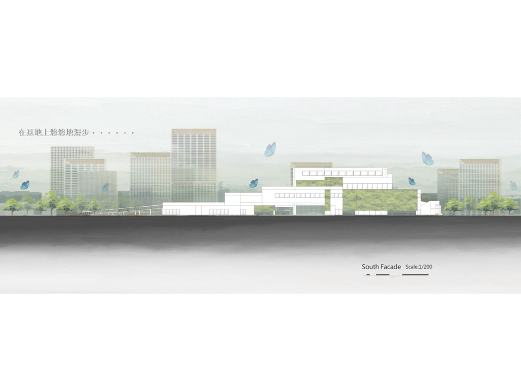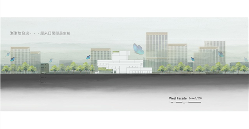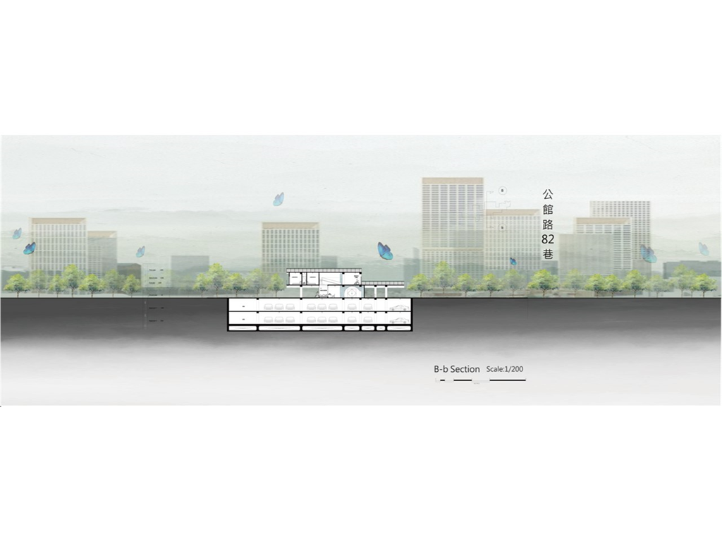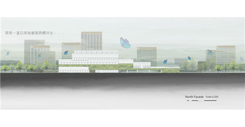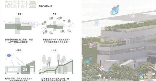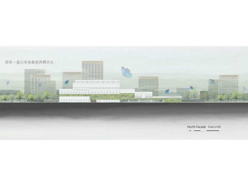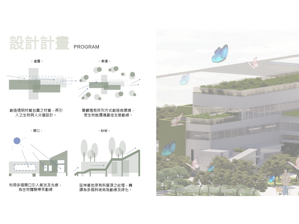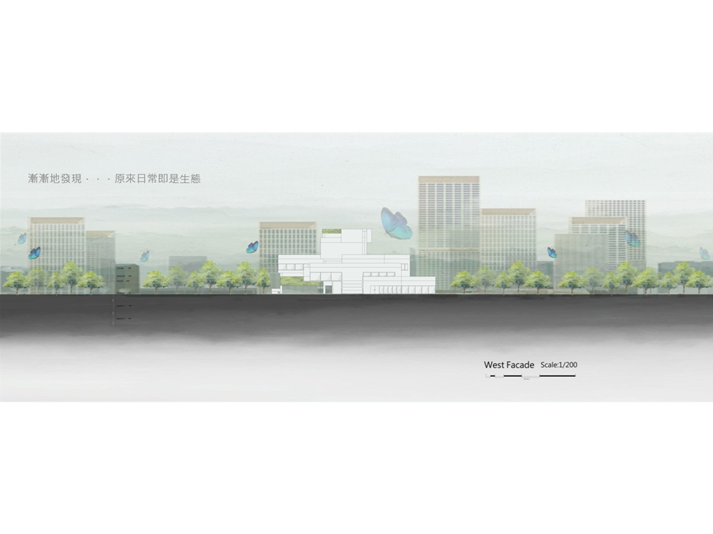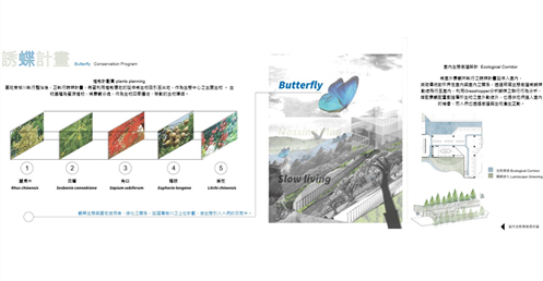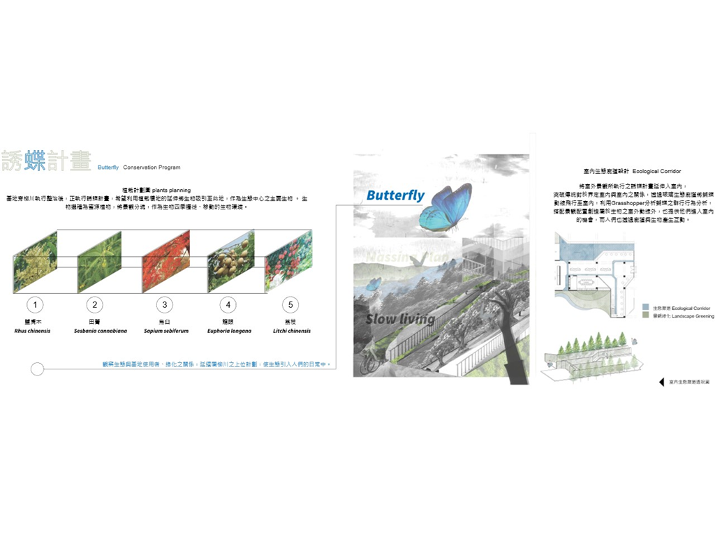 [1]誘蝶計畫:基地旁柳川執行整治後,正執行誘蝶計畫,希望利用植栽棲地的延伸將生物吸引至此地,作為生態中心之主要生物 。 生物選種為蜜源植物,將景觀分塊,作為生物四季遷徙、移動的生物環境。此外也設計了「室內生態廊道」,突破傳統對於界定室內與室內之關係,將室外景觀所執行之誘蝶計畫延伸入室內。