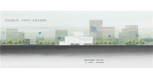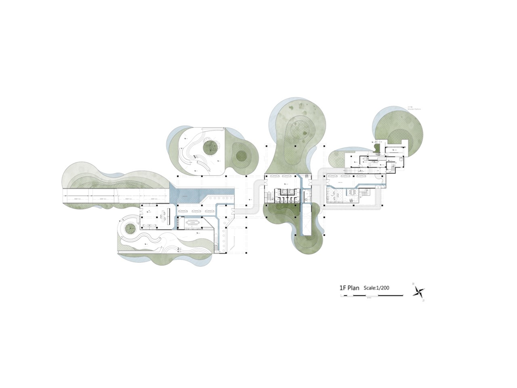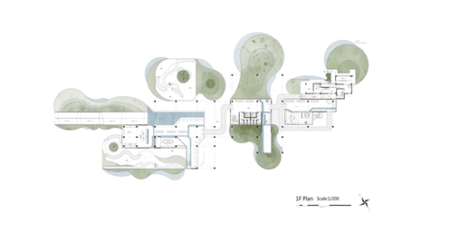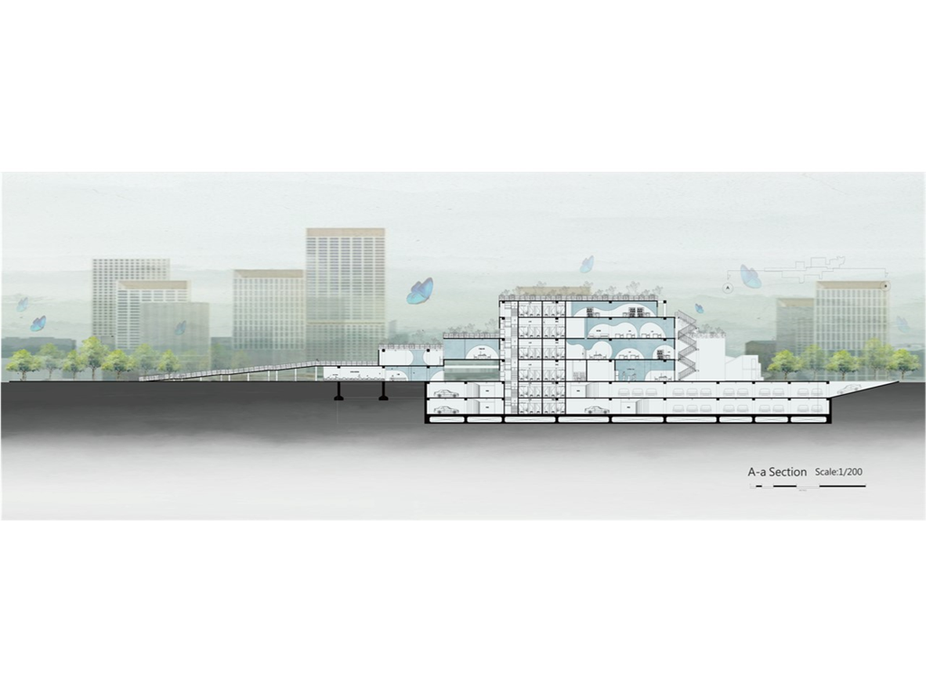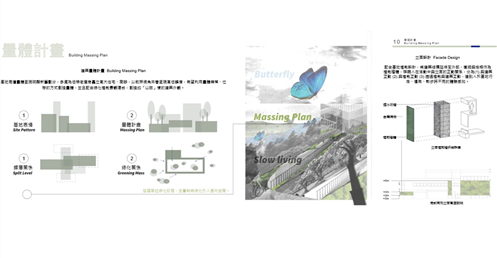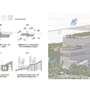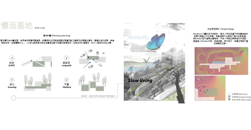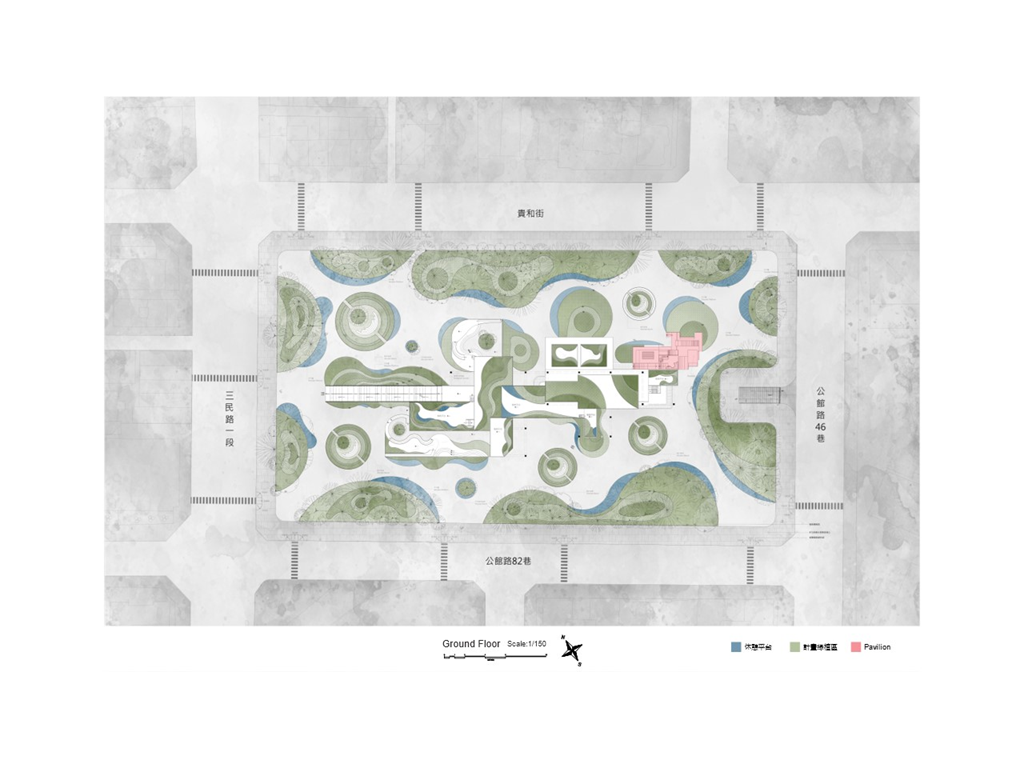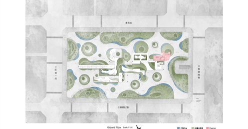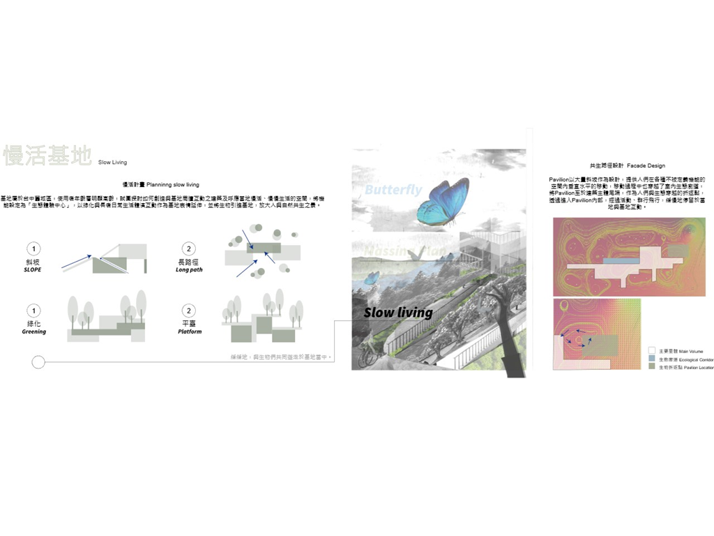 [3]共生路徑設計:建築旁的單元設計(Pavilion)以大量斜坡作為設計,提供人們在各種不被定義機能的空間內垂直水平的移動,移動過程中也穿越了室內生態廊道,將Pavilion至於建築主體尾端,作為人們與生態穿越的折返點,透過進入Pavilion內部,經過活動、群行飛行,緩慢地停留於當地與基地互動。