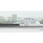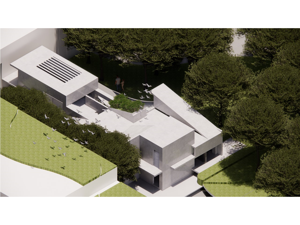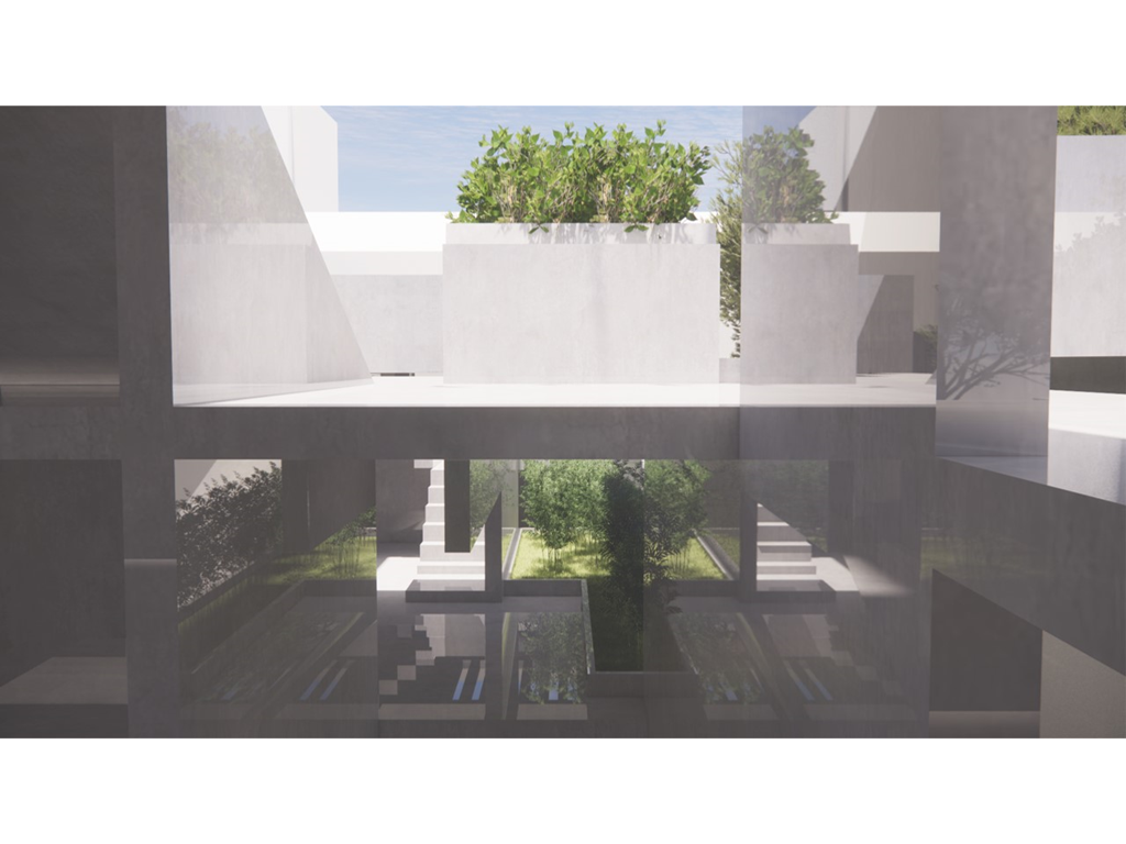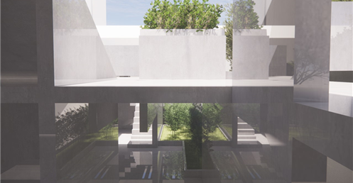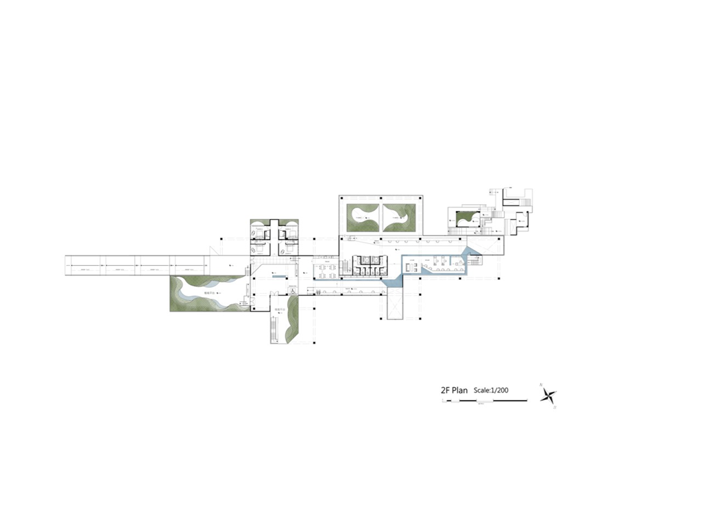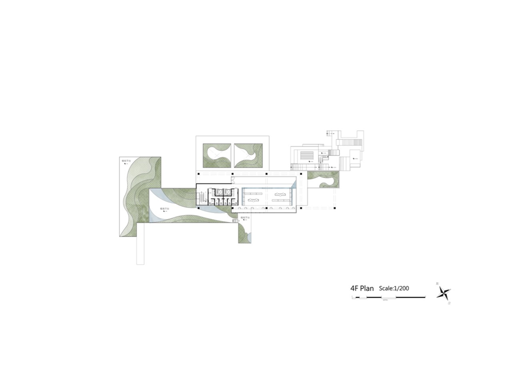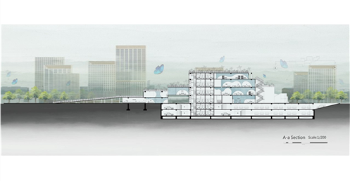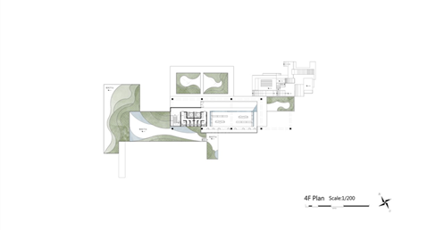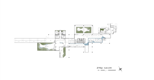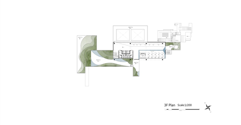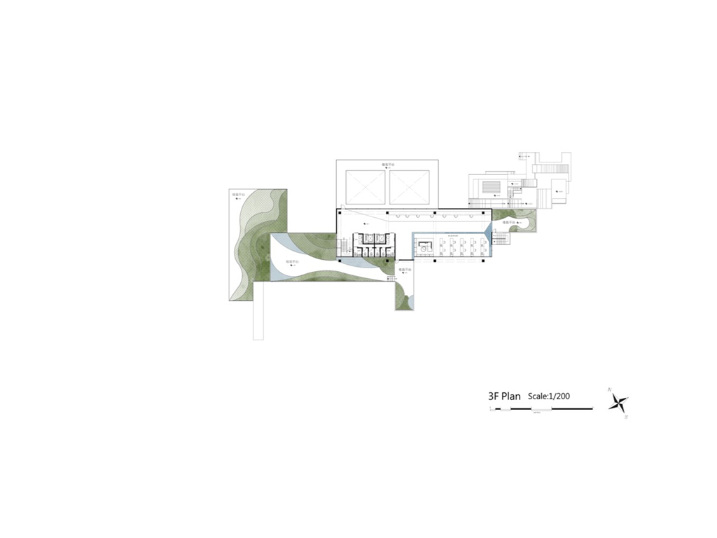 [3]共生路徑設計:建築旁的單元設計(Pavilion)以大量斜坡作為設計,提供人們在各種不被定義機能的空間內垂直水平的移動,移動過程中也穿越了室內生態廊道,將Pavilion至於建築主體尾端,作為人們與生態穿越的折返點,透過進入Pavilion內部,經過活動、群行飛行,緩慢地停留於當地與基地互動。