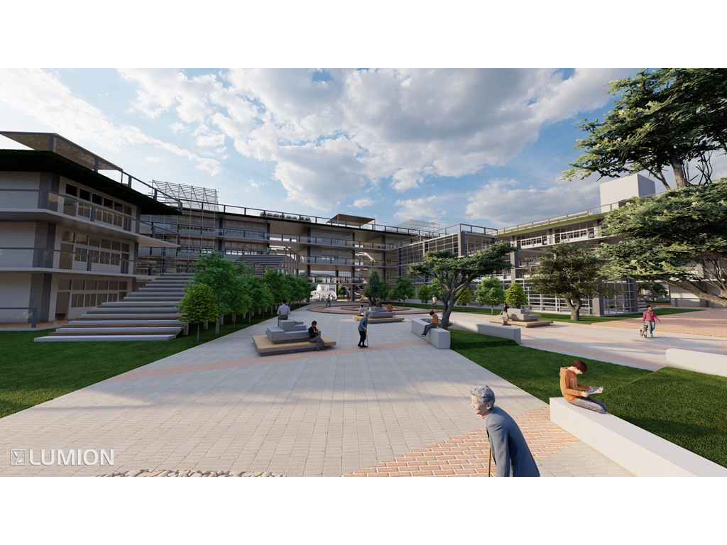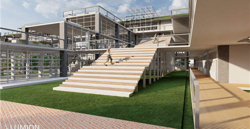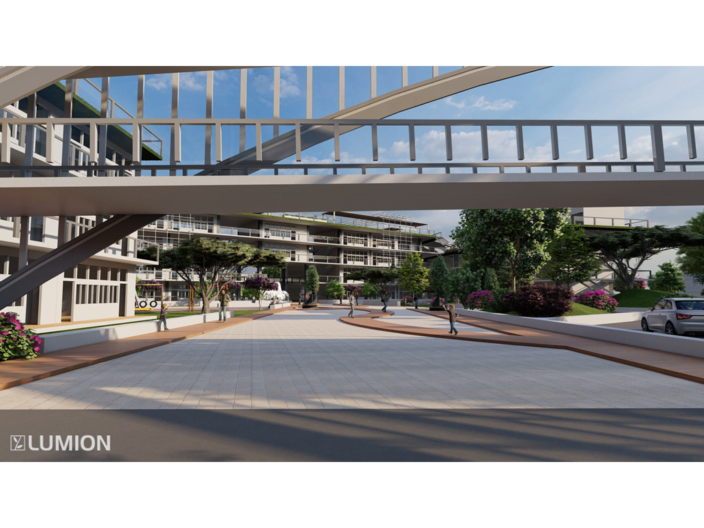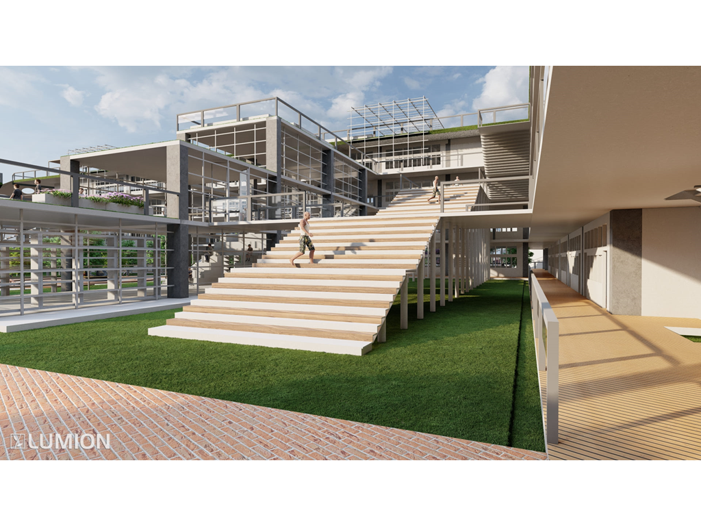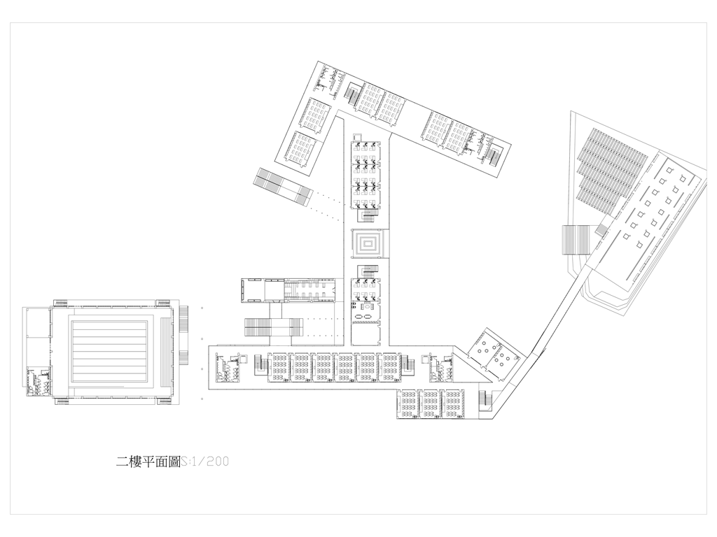 2.校園內部有大型戶外階梯與空中橋實現了全校通達的效果因文山區長期下雨這樣做可以讓學生在不淋雨的狀況下通達溫室/活動中心/教室/學生餐廳/圖書館等區域