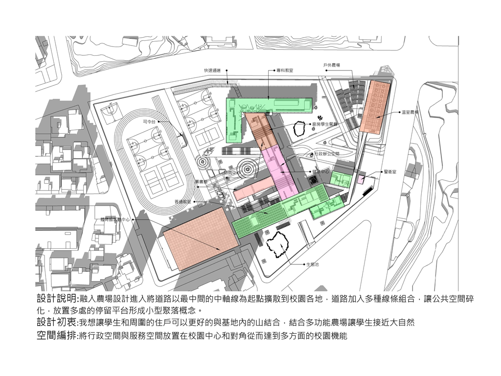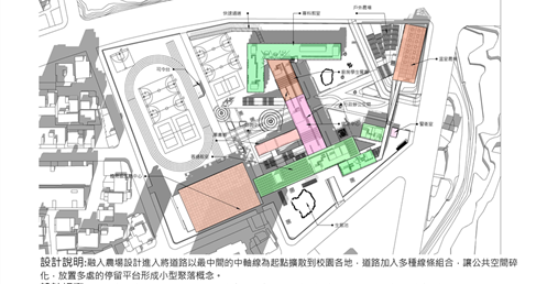 3.我在秀明路一段和原文山公民會館後面增設了側門出路口前者是為了方便學生廚房和垃圾車載貨可以和學生動線分開避免危險後者是為了讓周圍住戶更友善的抵達學院內部的操場或活動中心,而在設計之初我的主要概念有/與民共享/拉近人與山的距離/建立校園農場/公共空間的重組/大自然的調色盤,等設計初衷