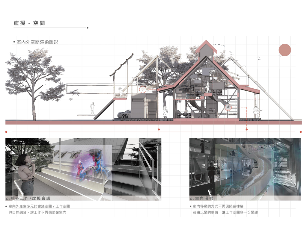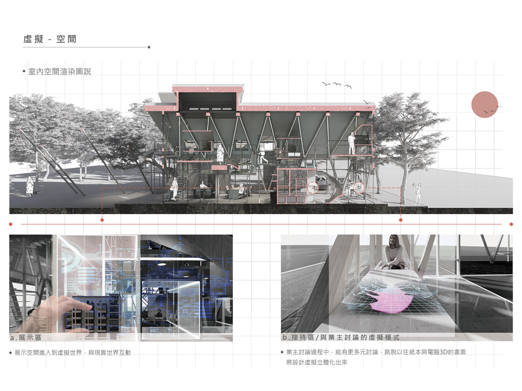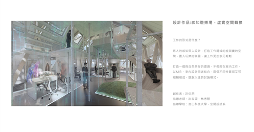 藉由MR設計師的優勢,創造虛擬的空間,結合室內設計師,當中透過基地可以看到的北風與西晒的元素來設計,藉由MR虛擬的技術,而透過現實世界的真實感,創造更真實的模擬,透過這項技術讓員工在工作時也能達到玩樂,創造出更大的設計想像,並且透過該技術結合室內設計師帶入客戶進入到3D世界,現場查看室內模擬。