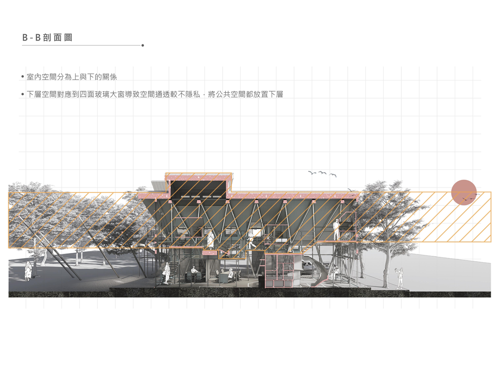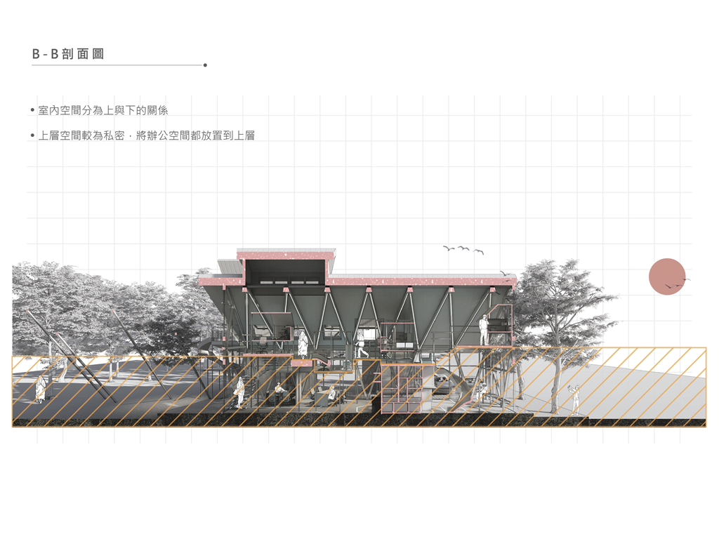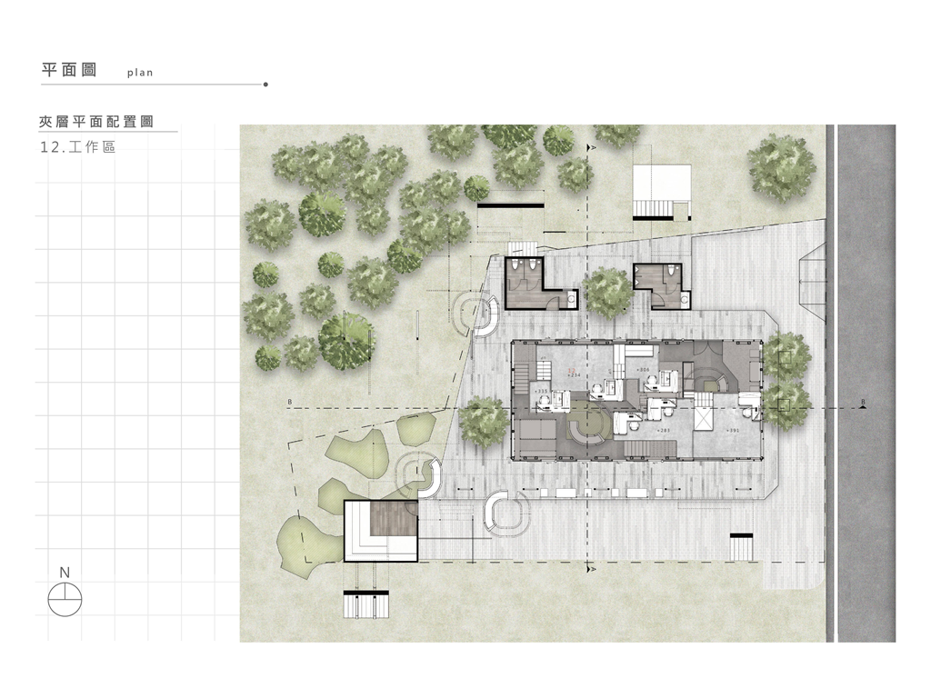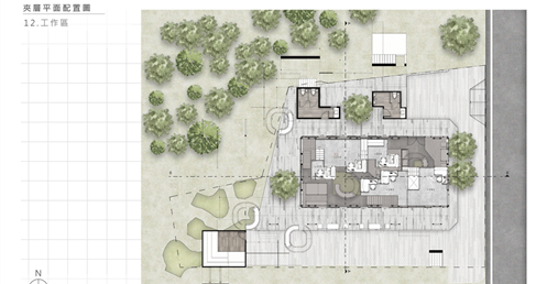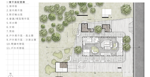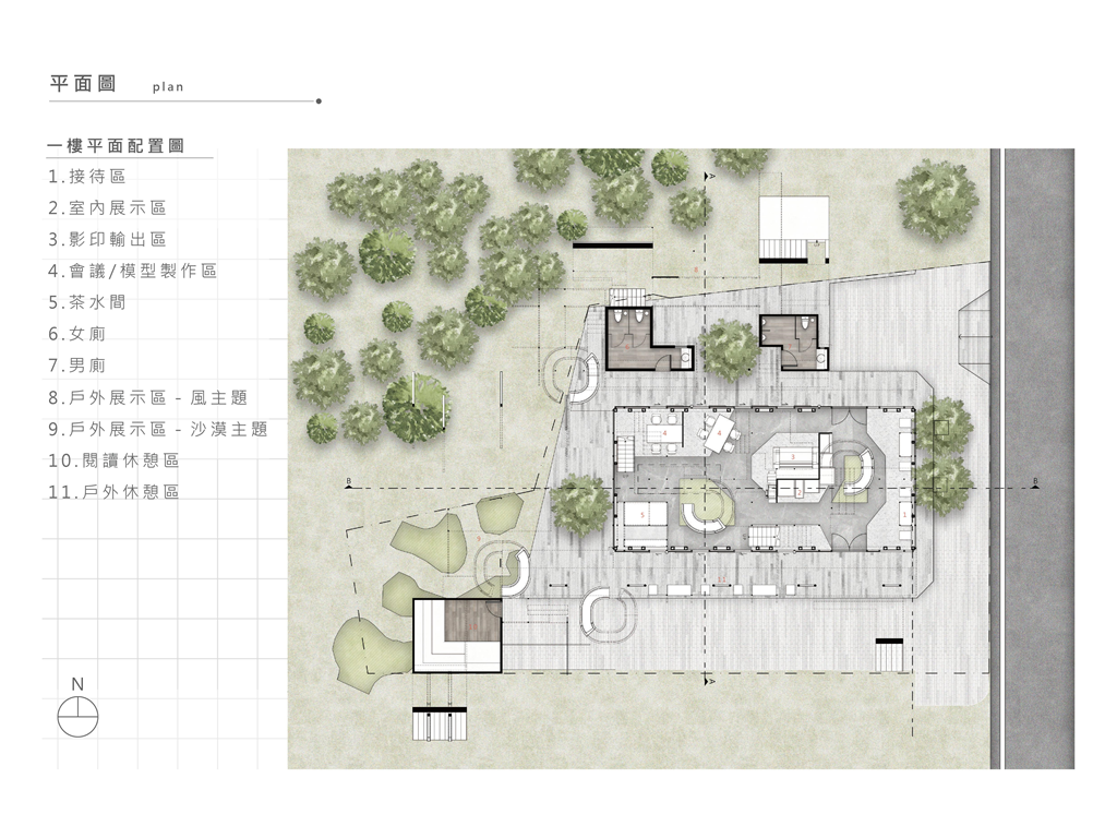 中心場館為兩位設計公司的辦公場域,北向考量到通風設定則為男女廁,西向建築為閱讀休憩區。